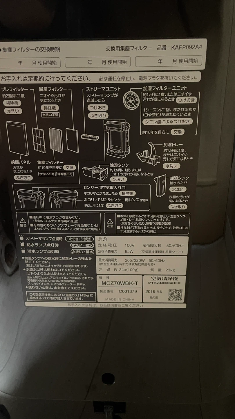 帰国のため出品いたします DAIKIN ダイキン 除加湿空気清浄機 型番:MCZ70WBK(2019年製) 2023年12月に購入(実際の使用期間は約1年) 参考価格:約87,800円 希望販売価格:30,000円 脫臭、除塵PM2.5對應、加濕、除濕、衣物乾燥⋯⋯等 ◆ストリーマ ストリーマ放電の分解力でカビやアレル物質を抑え、お部屋の空気をキレイに ◆TUFUフィルター 花粉・PM2.5・黄砂など、微小なホコリをしっかり補集 ◆水de脱臭 繊維に染み付いたニオイを除去 ◆衣類乾燥 梅雨時期の部屋干しに ◆のど・肌運転 お肌やのどの乾燥対策に高めの湿度で自動調整