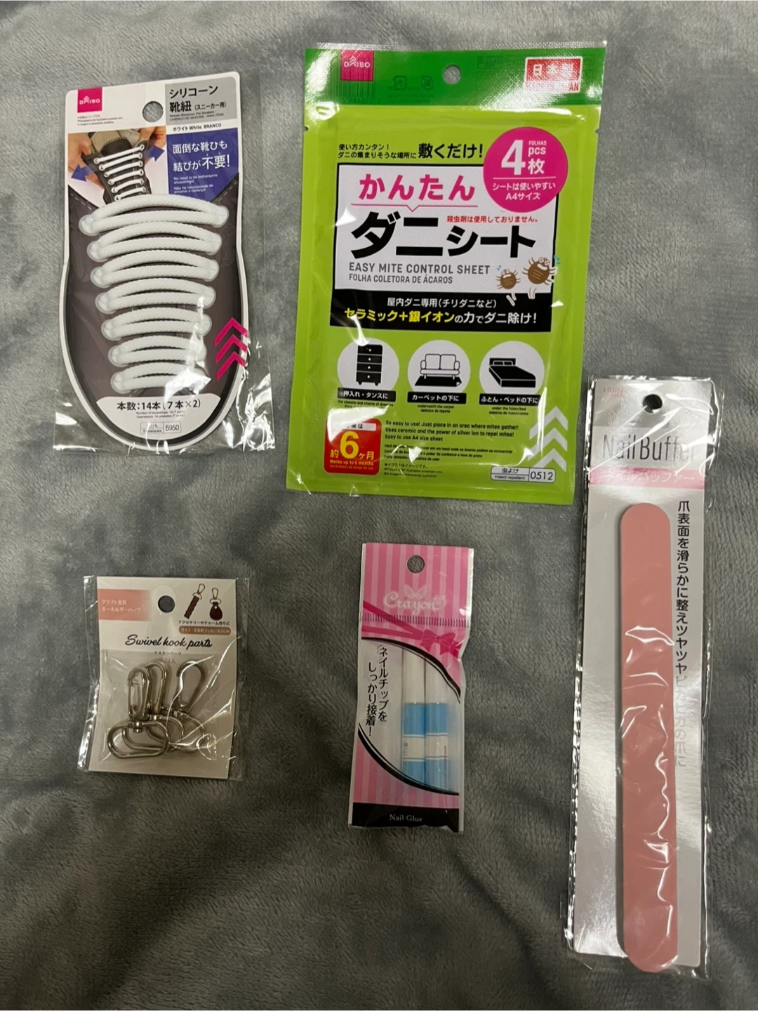ダイソーの商品セットです ・シリコーン靴紐(スニーカー用) ・ダニシート 4枚入り ・ネイルバッファー ・Swivel hook parts ・ネイルチップ用接着剤