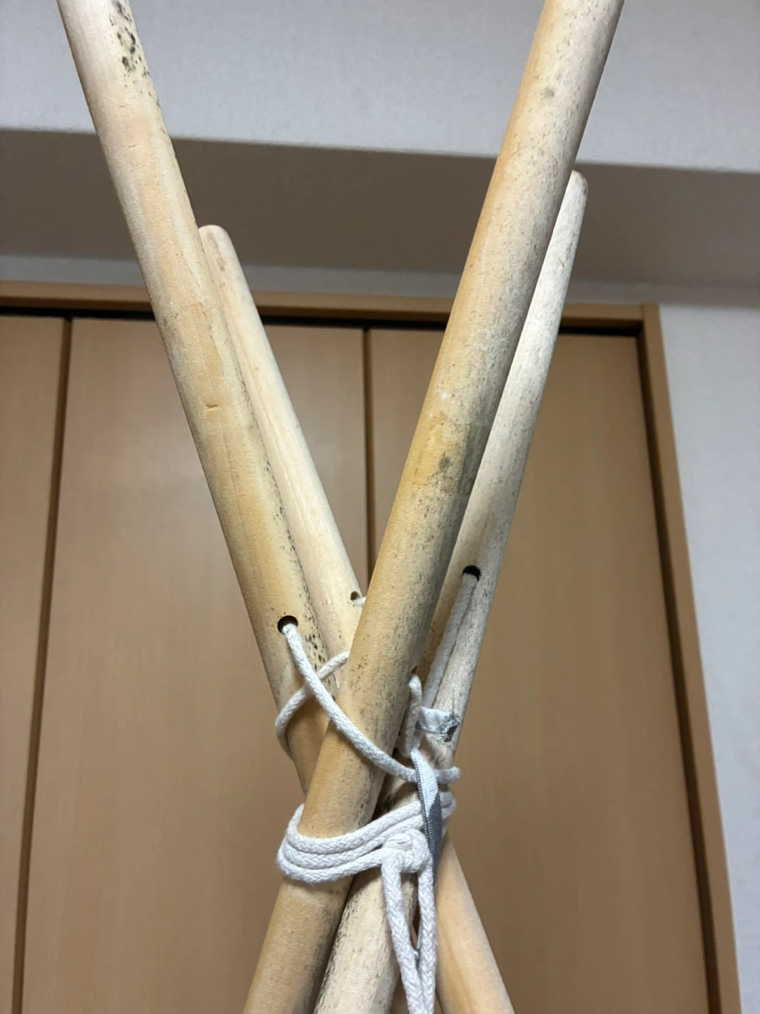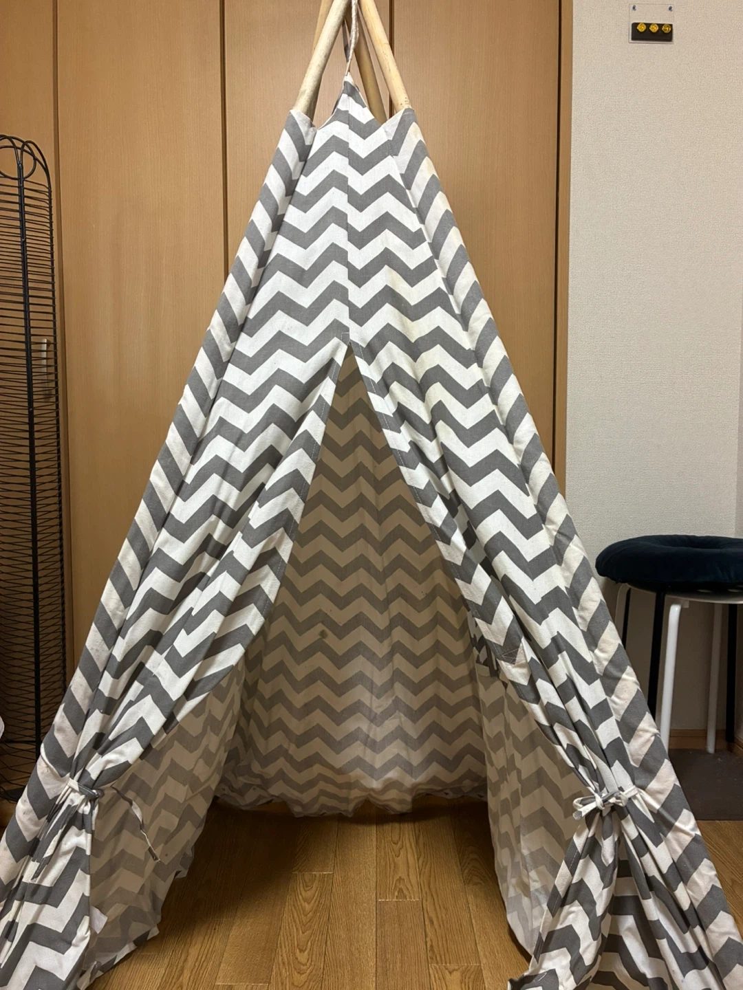 キッズテントです ・色:グレー、ホワイト ・デザイン:シェブロン柄 ・状態:多少の使用感あり 木の支柱の先端に 黒いぶつぶつが付いております 中古品であることご了承ください。 室内テント、 ピクニックなど外出の際に 活躍します