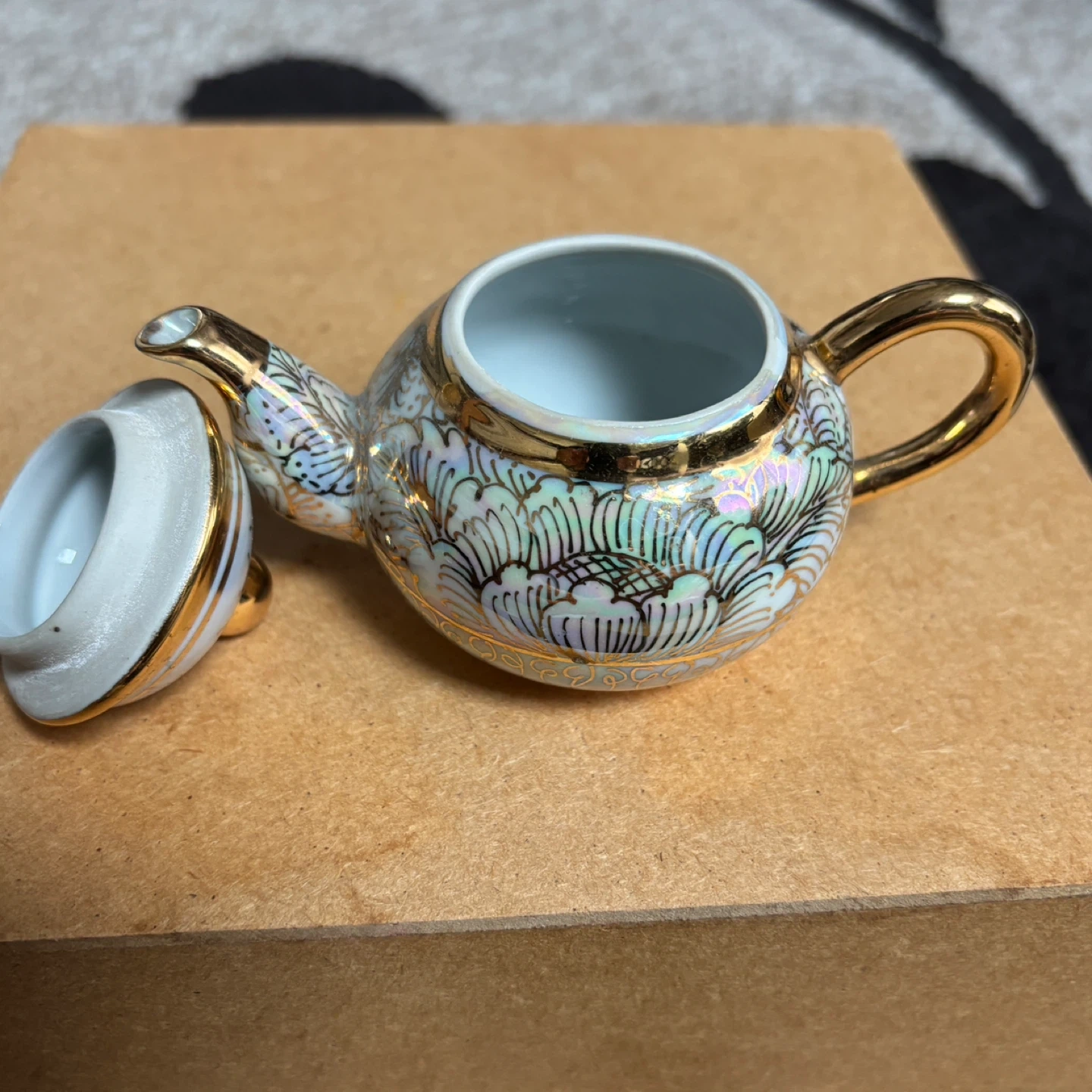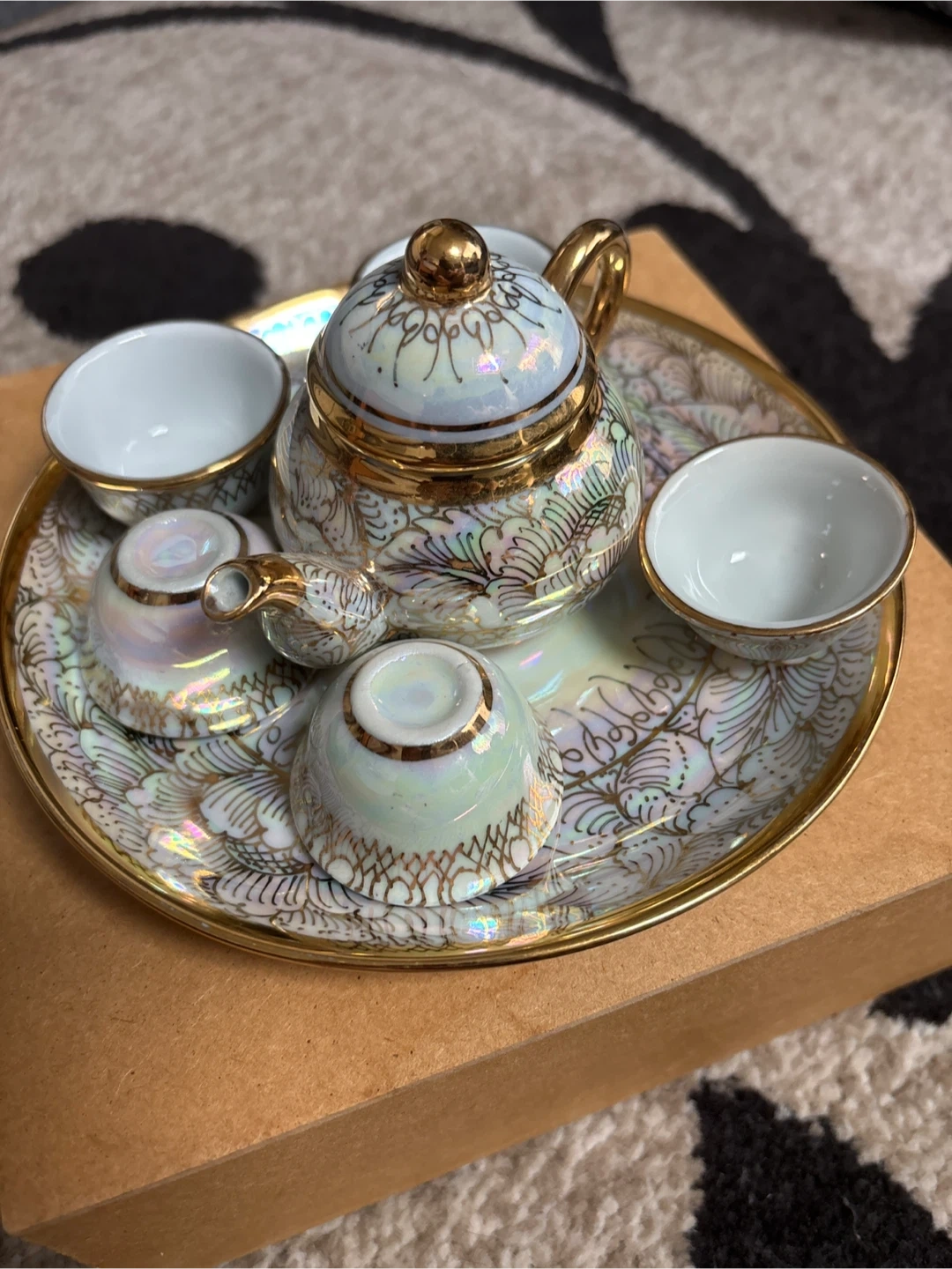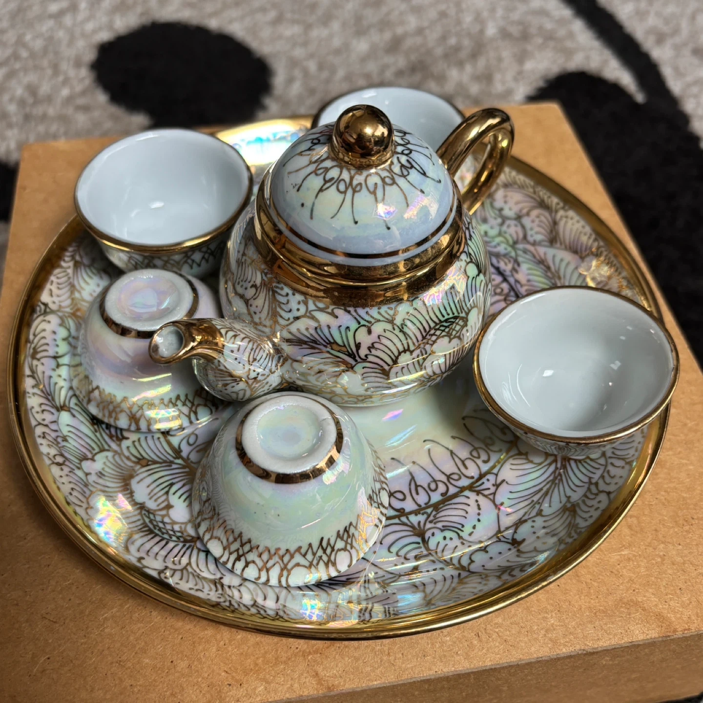 ティーセットのミニチュアです バリ島で 買いました。 ・ティーポット1つ、カップ5つ、ソーサー1枚のセット ・色:パールホワイト、ゴールドの縁取り ・状態:未使用に近い ・底面に「Handpaint in Thailand」の文字あり 中古品であることご了承ください