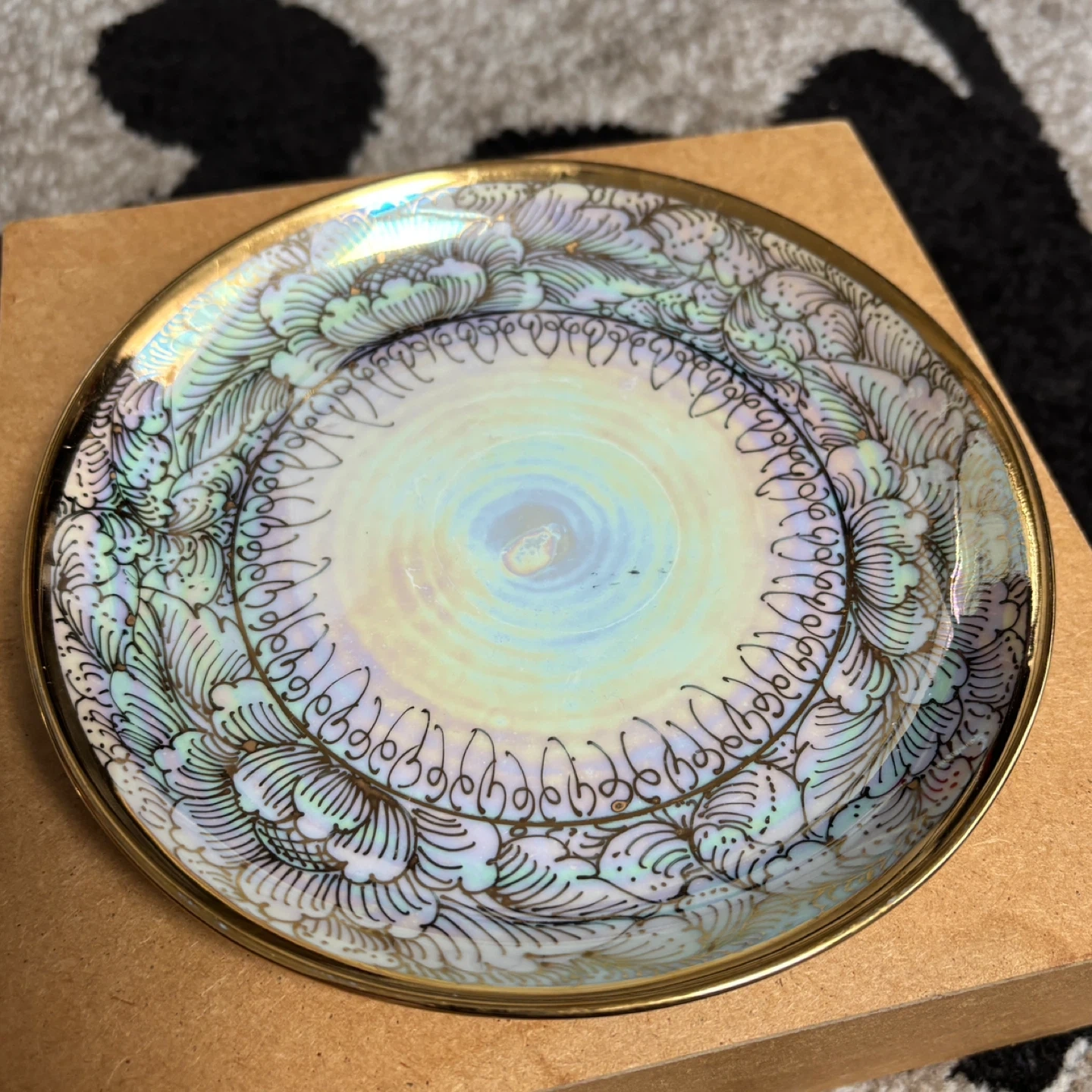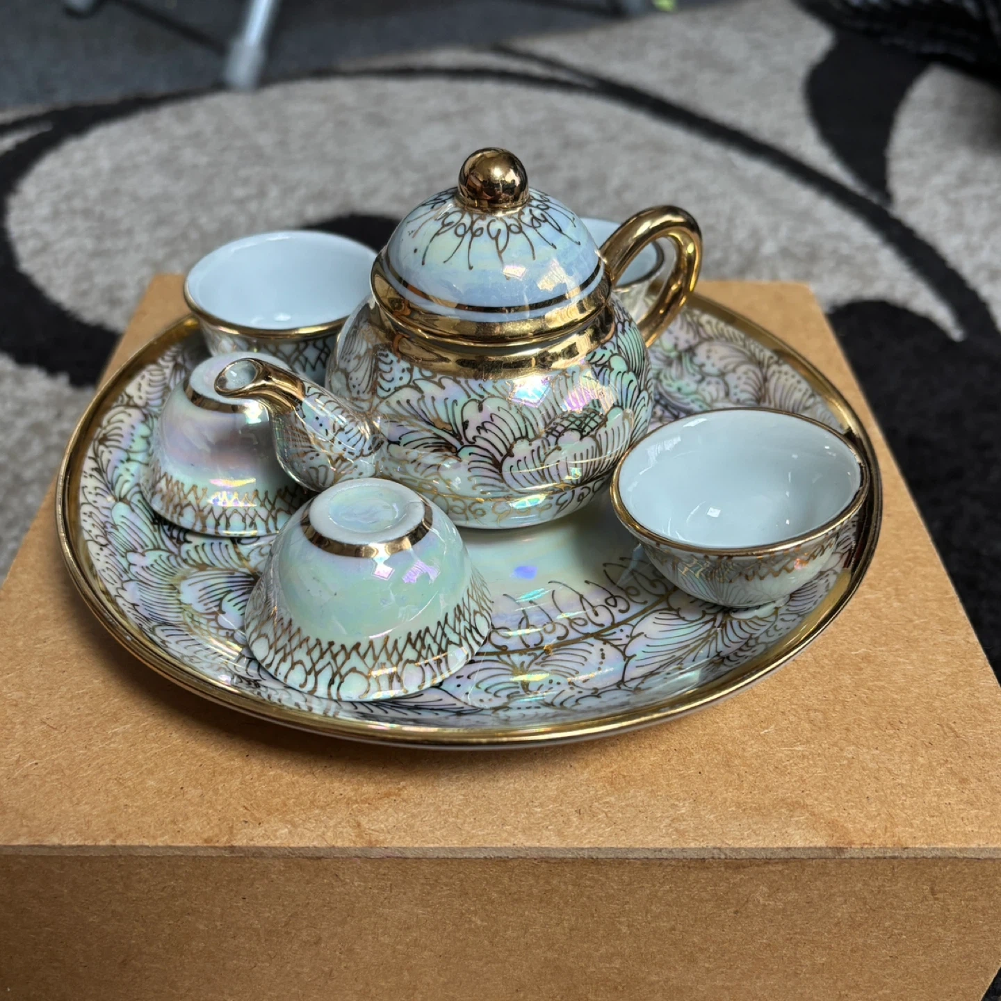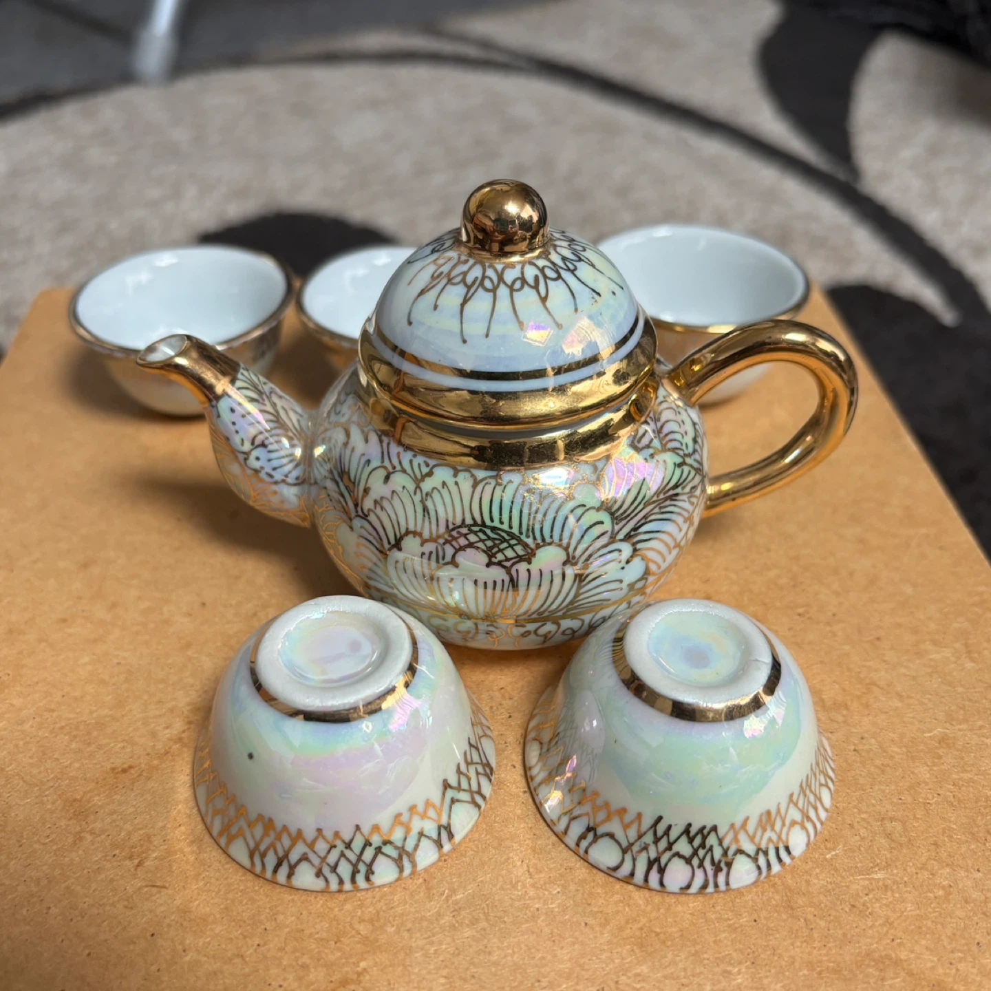 ティーセットのミニチュアです バリ島で 買いました。 ・ティーポット1つ、カップ5つ、ソーサー1枚のセット ・色:パールホワイト、ゴールドの縁取り ・状態:未使用に近い ・底面に「Handpaint in Thailand」の文字あり 中古品であることご了承ください