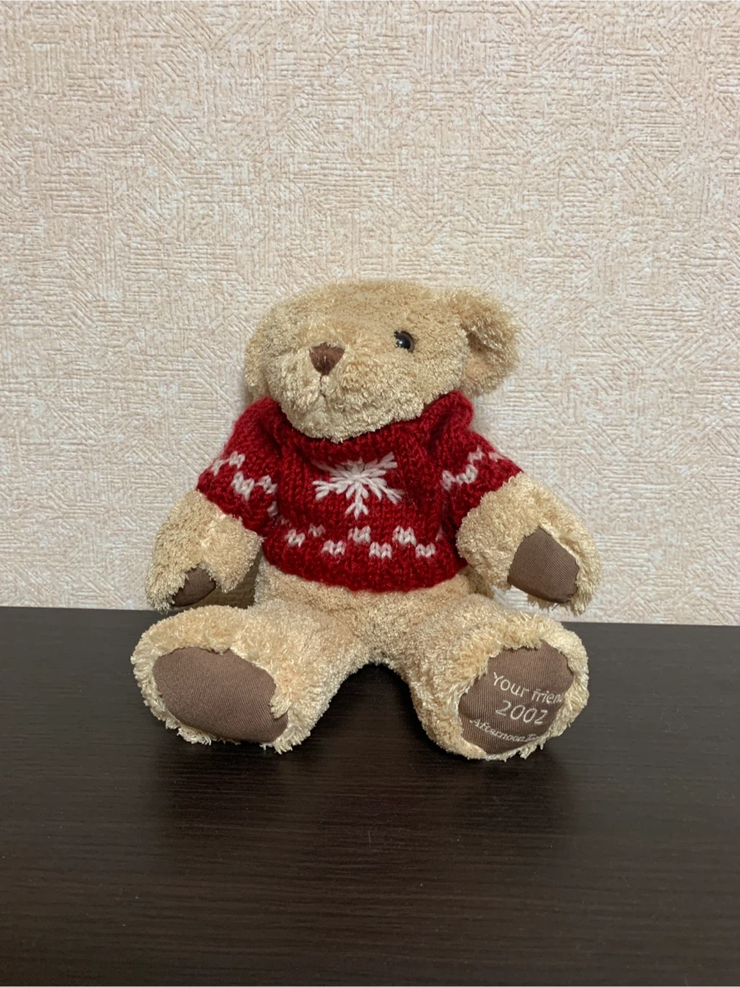 テディベアのぬいぐるみです ・色:ベージュ ・赤いセーターを着ています ・セーターに雪の結晶の模様があります ・足の裏に「Your first Bear 2004」と書いてあります ・使用感は少なめです アフタヌーンティーのものです 中古品であることご了承ください