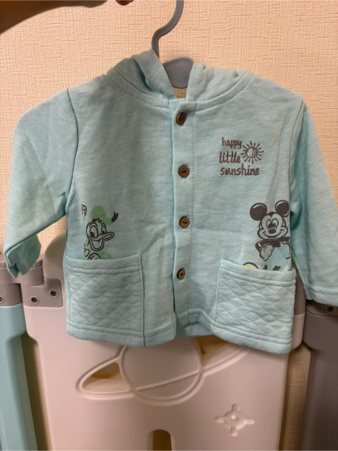 ディズニーのベビー服セットアップです。 ・色:水色 ・ミッキーとドナルドの絵柄 ・上着にポケット2つ ・ズボンにミッキーのアップリケ ・状態:使用感少なめ 中古品であることご了承ください