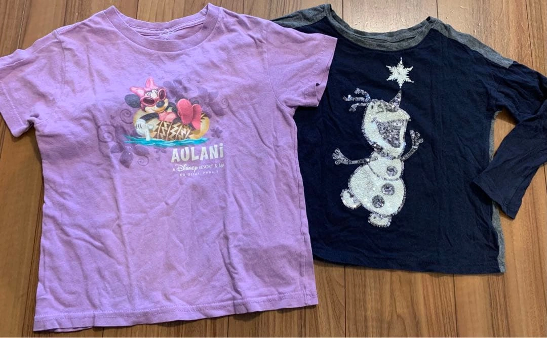 ディズニーTシャツのまとめ売りです。 パープルのTシャツはハワイのアウラニDisney Hotelで購入しました。120センチ位のサイズかと思います。 紺色とグレーのオラフのTシャツはGAPとDisneyコラボ商品です。110と書いてありますが、伸びやす い素材のため、100から120のサイズまで長く着用していました。 どちらも使用感はありますが、限定品です。 素人の自宅保管ですので、見落としがありましたらご容赦ください。 身幅や袖丈など必要でしたら測ります。伸縮性のある生地で冬はセーターの下、夏は1枚で着ていました。 他にも出品していますので、まとめて購入される場合はお値引きできます。コメント欄にてご連絡ください。 #ミニー #アナ雪 #オラフ #コラボ #Aulani