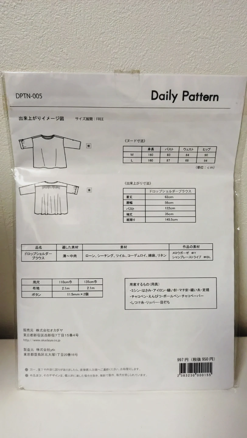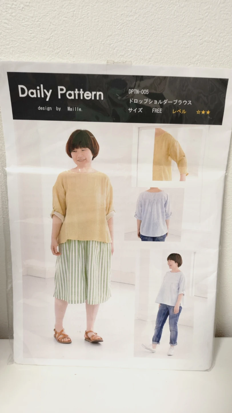 デイリーパターンのドロップショルダーブラウスの型紙です。 ・型番:DPTN-005 ・サイズ:FREE ・素材:薄~中肉の生地に適しています ・用尺:110cm巾の場合2.1m、135cm巾の場合2.1m 未使用未開封