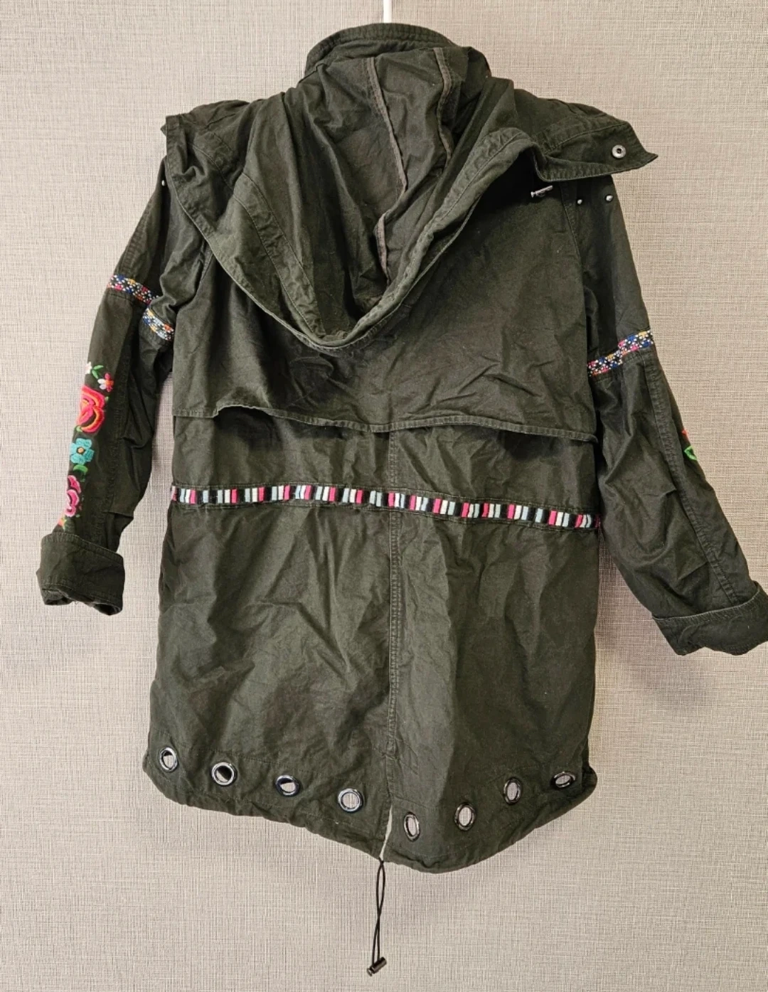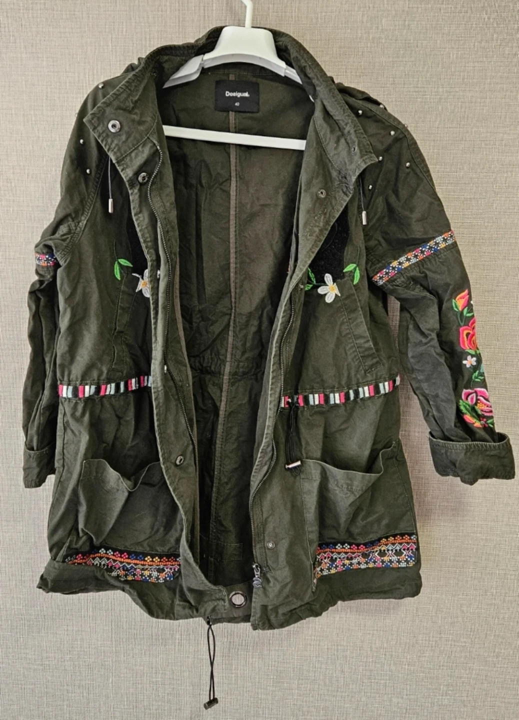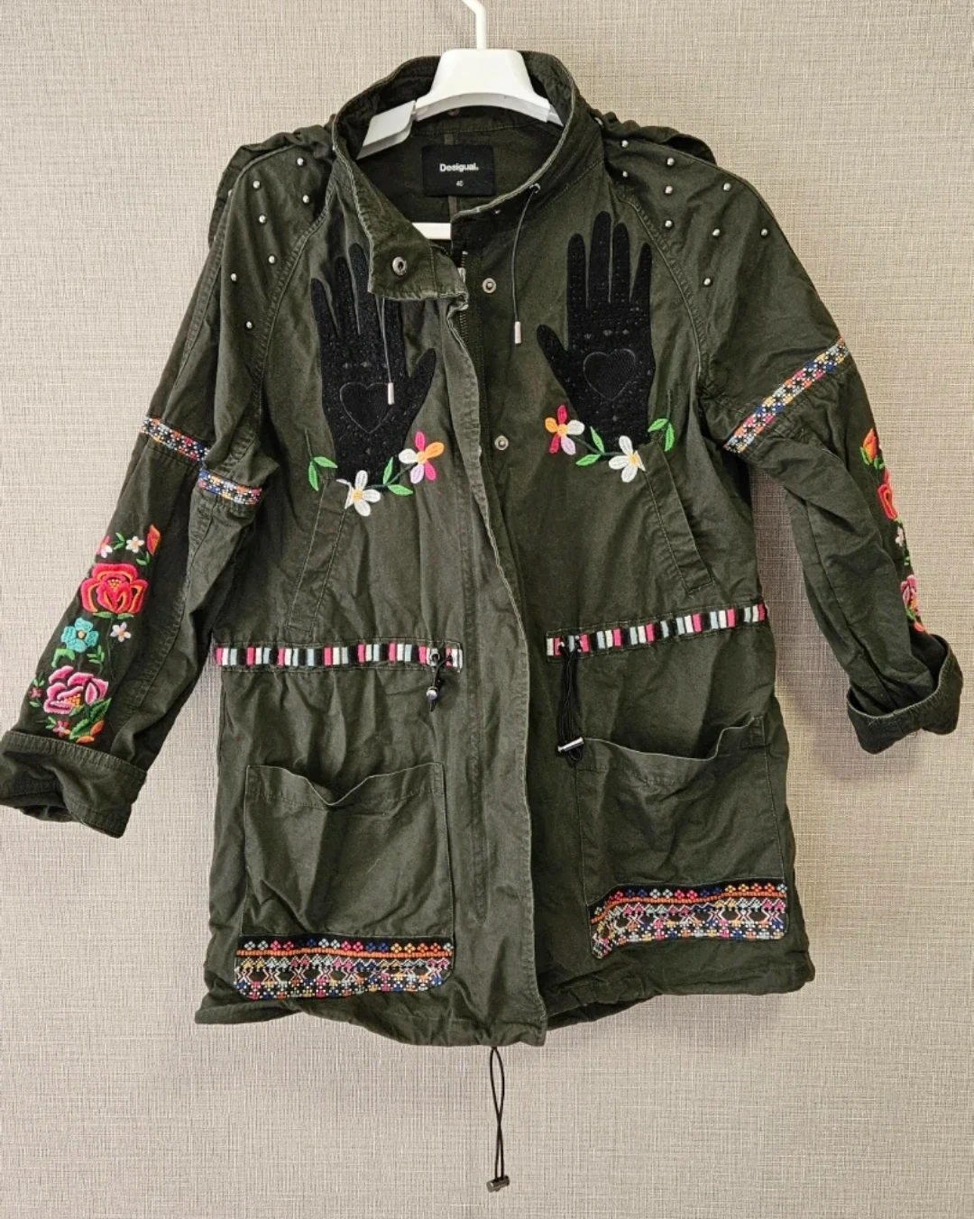 デシグアルのジャケットです。 ・ブランド:デシグアル ・サイズ:40 ・色:カーキ ・デザイン:刺繍、装飾あり ・状態:使用感あり 海外旅行の時に購入した物になります 独特のデザインです 中古品であることをご了承ください。