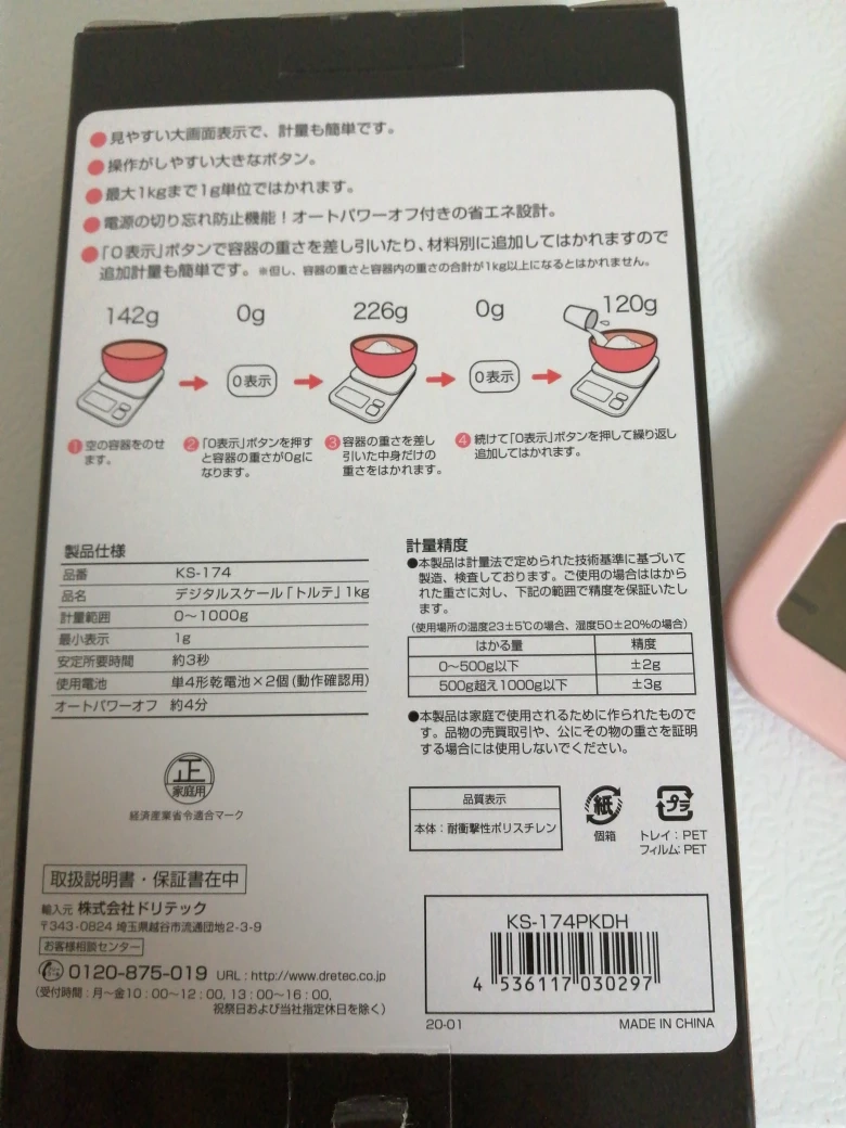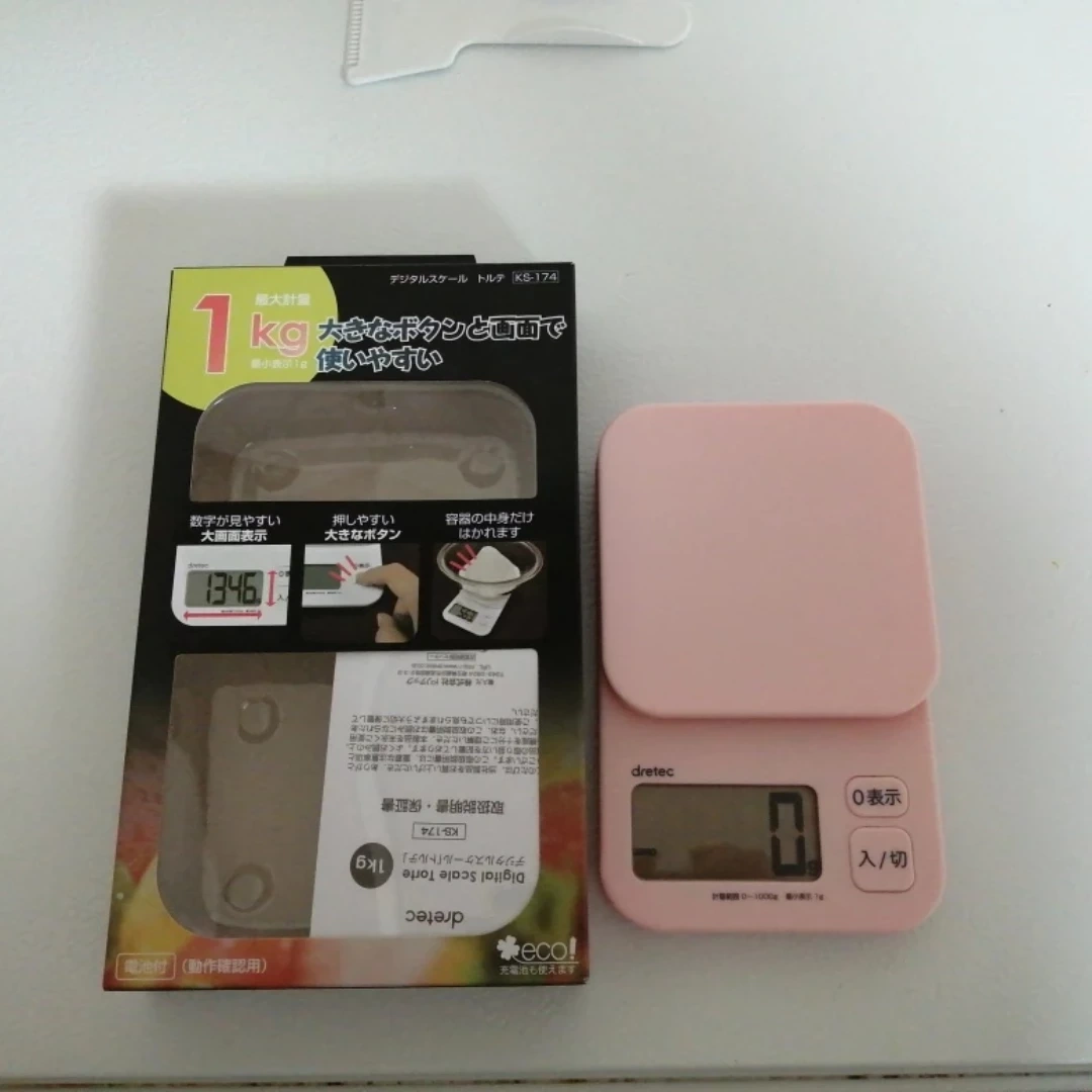 ドリテックのデジタルスケールです。 【情報】 ブランド:ドリテック 型番:KS-174 計量範囲:0〜1000g 最小表示:1g 使用電池:単4形乾電池×2個 オートパワーオフ:約4分 【状態】 使用感少なめ、全体的にきれい 【付属品】 箱、取扱説明書 中古品であることをご了承ください。