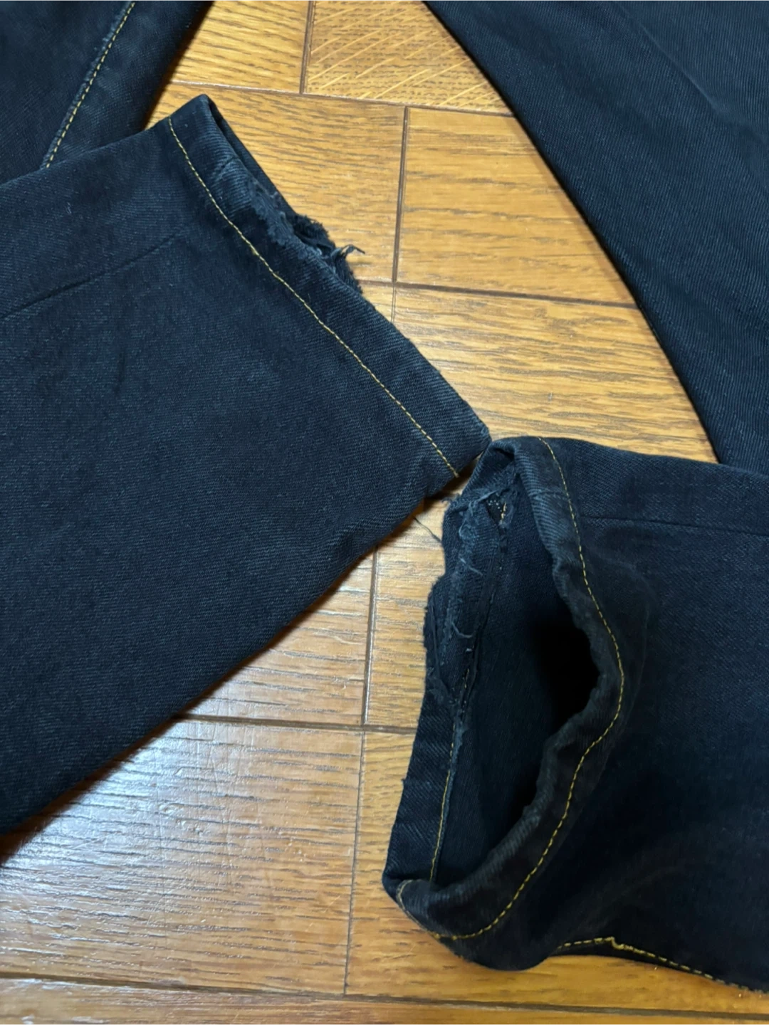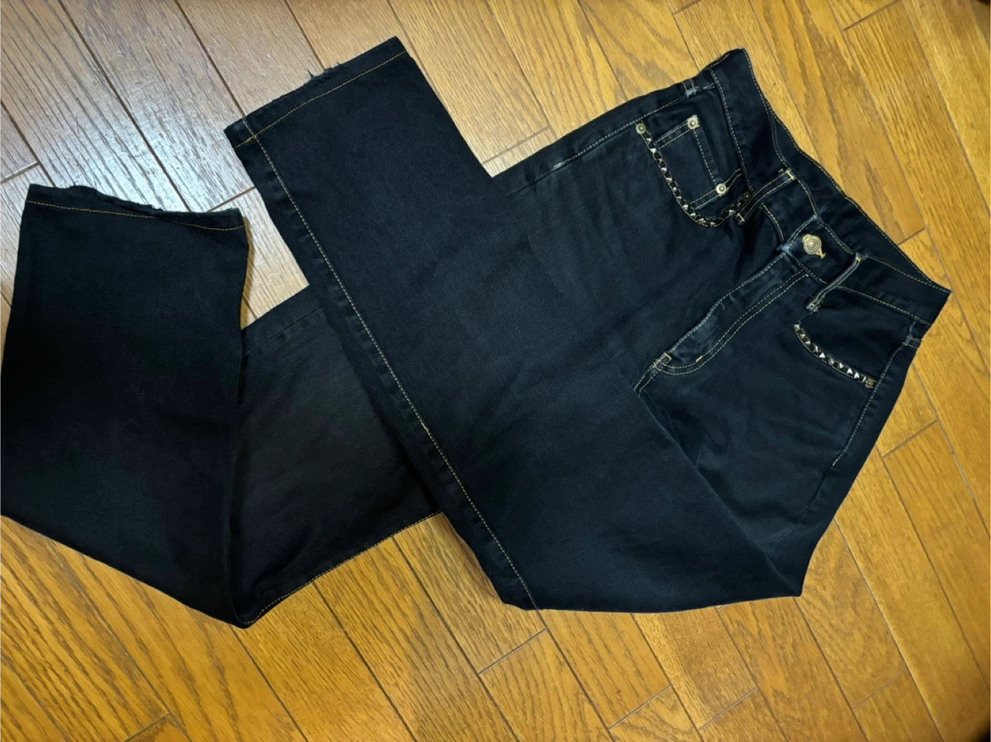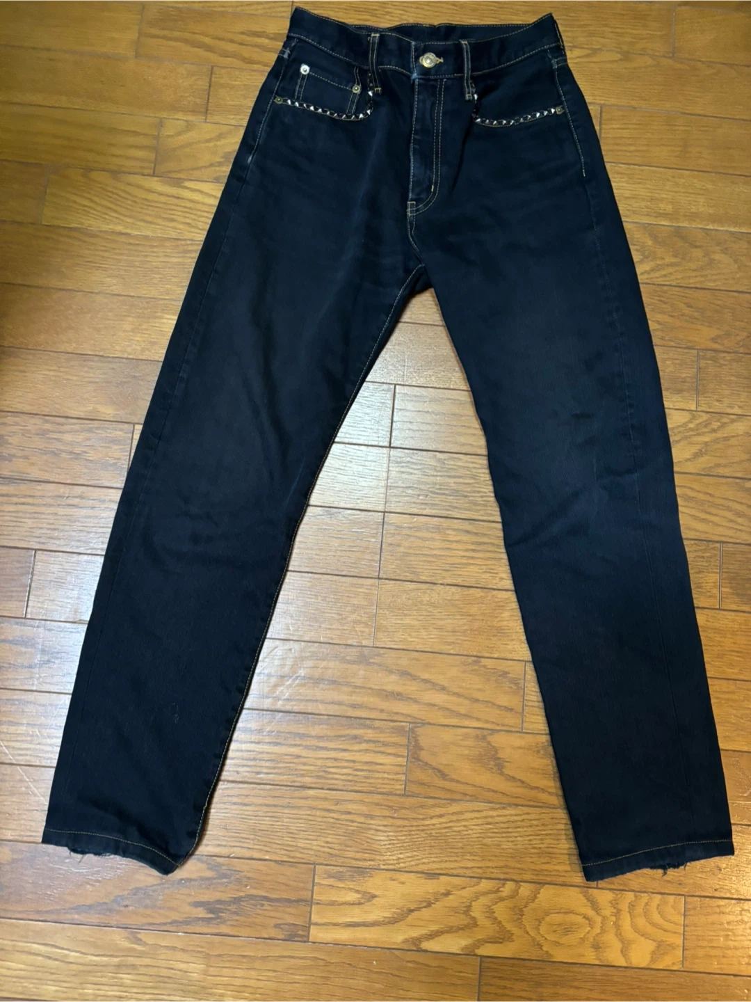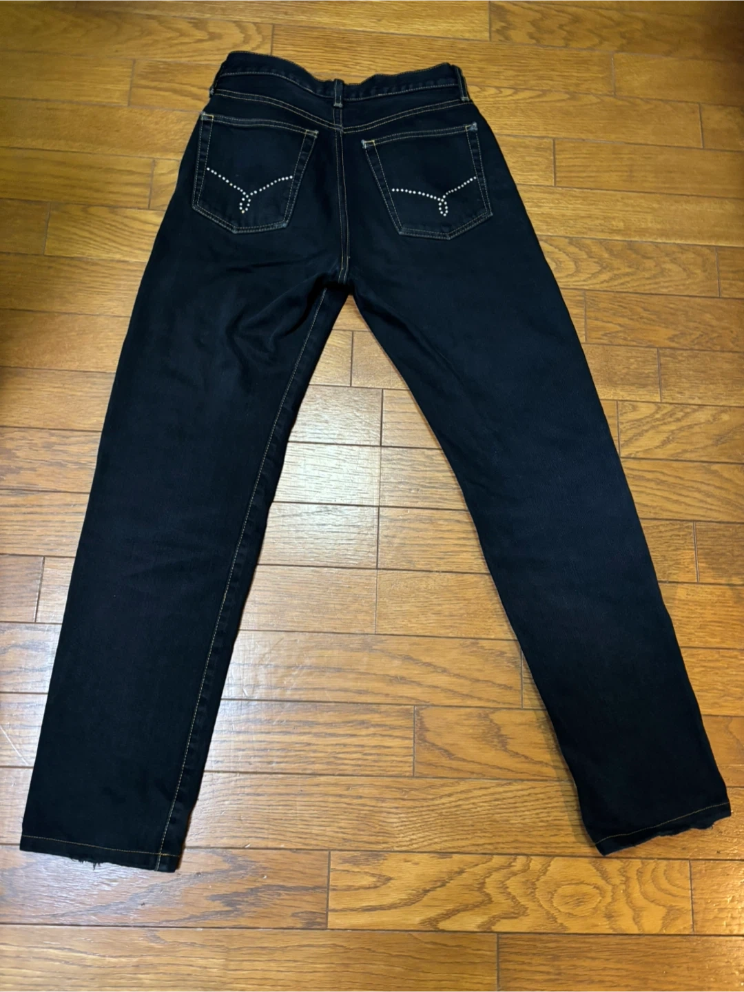 デニムパンツです。 30インチ  股下 70㌢ ポケットにドット、メタル付き ・色:ブラック ・状態:使用感あり、裾にダメージあり 中古品であることをご了承ください。