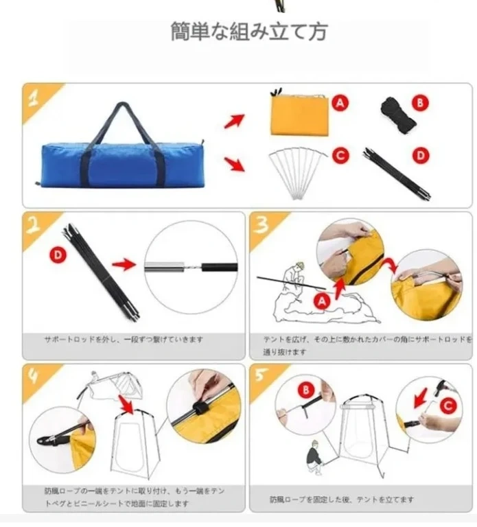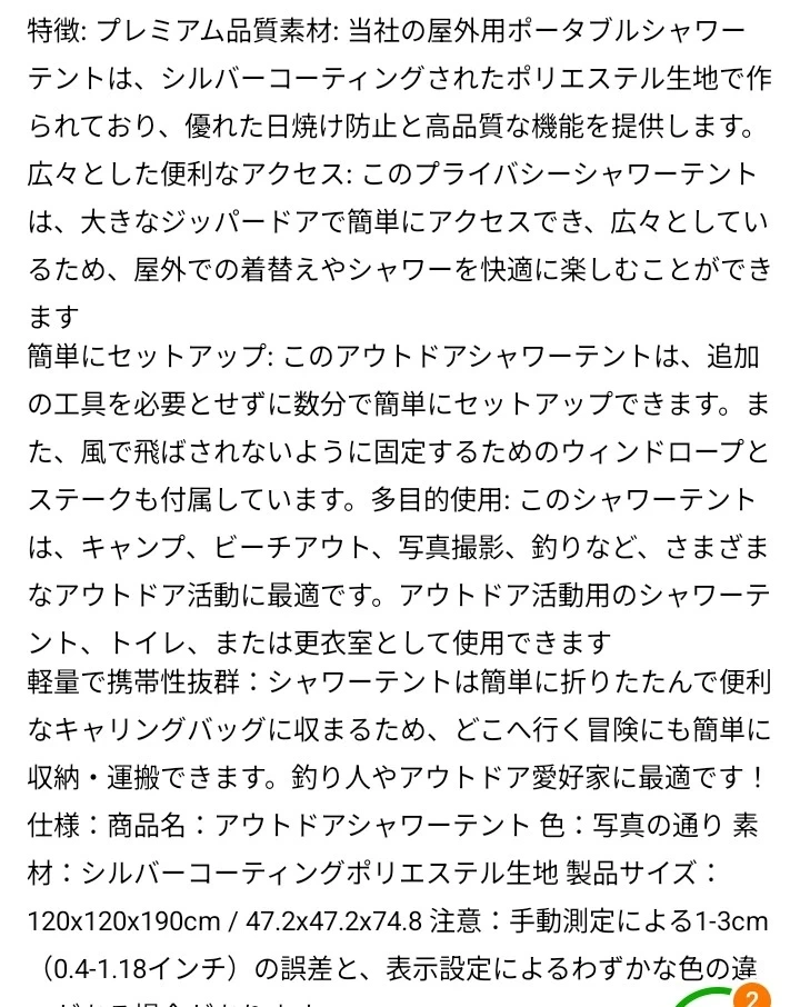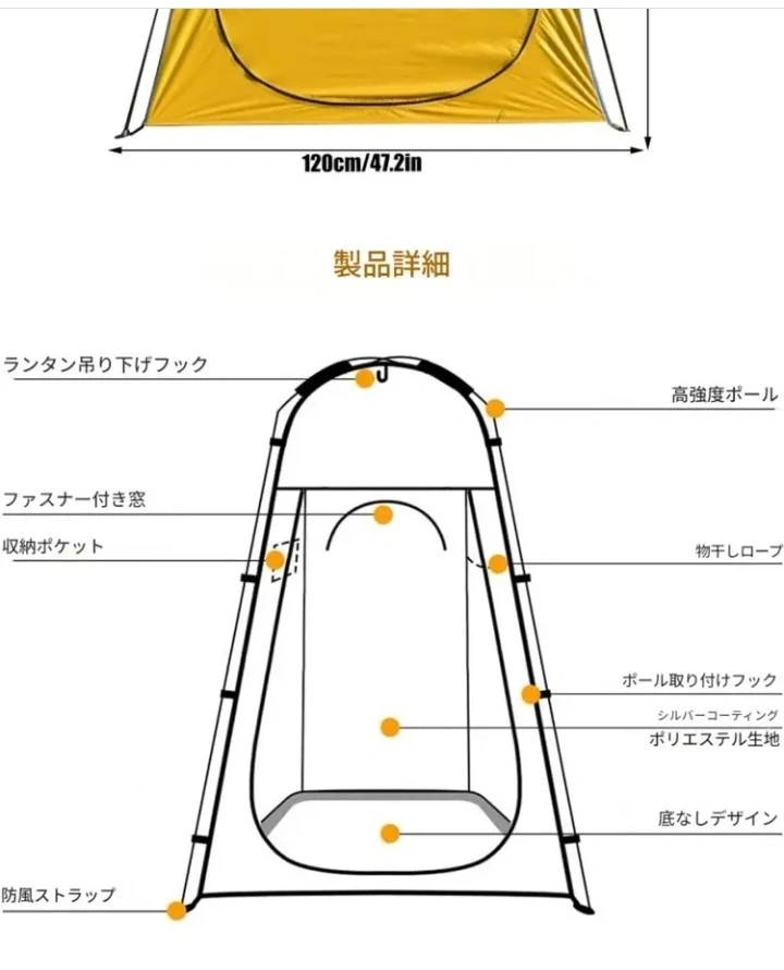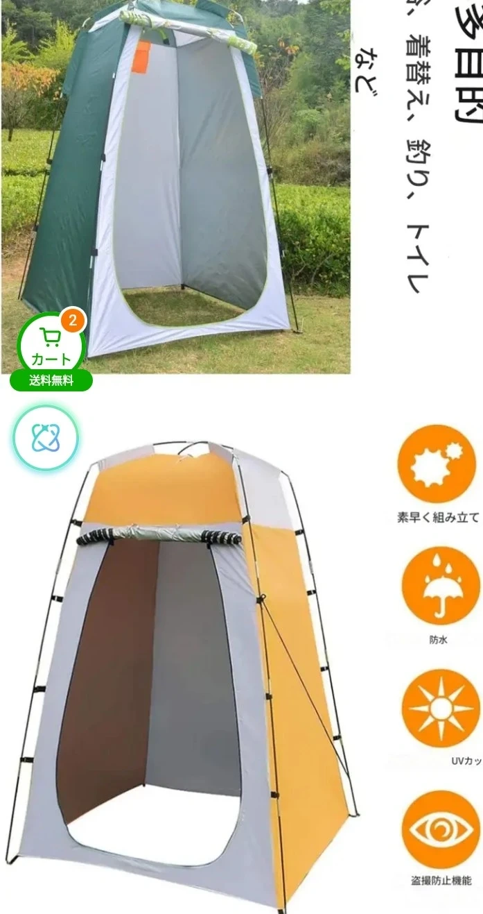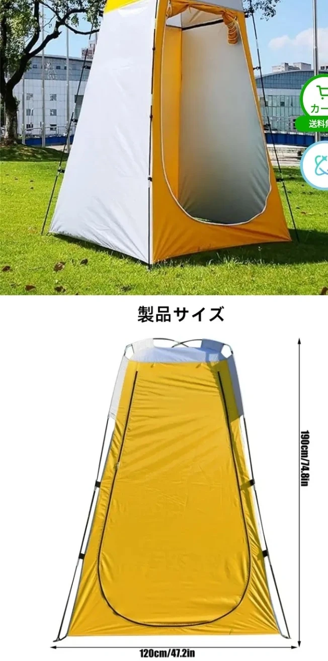 あたたかさアウトドアシャワーテントです。 ・色:写真の通り ・サイズ:120x120x190cm/47.2x47.2x74.8インチ 収納サイズ 53cm 1.2kg ・素材:シルバーコーティングポリエステル生地 ・特徴:UVカット、防水、透視防止機能付き ・組み立て簡単 簡易トイレ、着替え、シャワー、 釣り等で大活躍します。 従来の丸型収納タイプは展開 は早い ですが、収納は慣れないとかなり 難しくてこずります。こちらは ポールを通すタイプなので、簡単 展開、撤去できます。 受渡しは横浜市緑区中山駅北口徒歩3分の セブンイレブン中山北口店前で お願いします。駐車場はありませんが、 全面道路広く、停められます。 日にちにもよりますが、am8-pm8 対応できます。