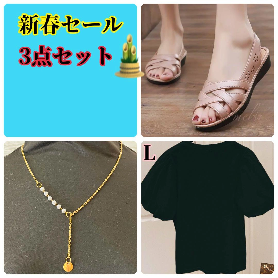新春初売り3点セット❤️ 今年の夏も暑くなる予想❗️ ①バルーン袖のLサイズトップス ②ゴールドネックレスビーズ付き ③ベージュのウェッジソールサンダル 3点セット - セット内容: トップス、ネックレス、サンダル ①洗濯してもシワになりずらく即乾性の半袖Tシャツです。シンプルかつ大人かわいいパフスリーブで、スカートでもパンツでも合わせやすいデザインです。涼しげな肌触りの良い素材と伸縮性があります。 【サイズ】Lサイズ 着丈約55cm バスト約96cm 肩幅約36cm 【素材】ポリエステル コットン *首元に小さな傷あり目立ちません ②ゴールドネックレス ③レディース サンダル24cm他/23.5cmあり *ベルトのところに小さな傷ありますが内側の為目立ちません ⚠一つ一つ丁寧に検品をしておりますが、海外製品ですので日本製と違い、小さな傷や汚れ、作りがあまい場合がありますので、ご理解の上ご購入をお願いいたします。 海外製品のため新品ですがタグ無しの場合もございます。 ⚠できるだけ実物のお色に近づけるように撮影をしておりますが、素材や光の具合により、実際の色味と多少異なって見える場合がございます。 ⚠お客様都合による(イメージ違い、サイズ違い、いらなくなったなど)返品交換や、受取評価後の返品はできませんのでご了承ください。 ご希望の方はお気軽にご連絡ください。