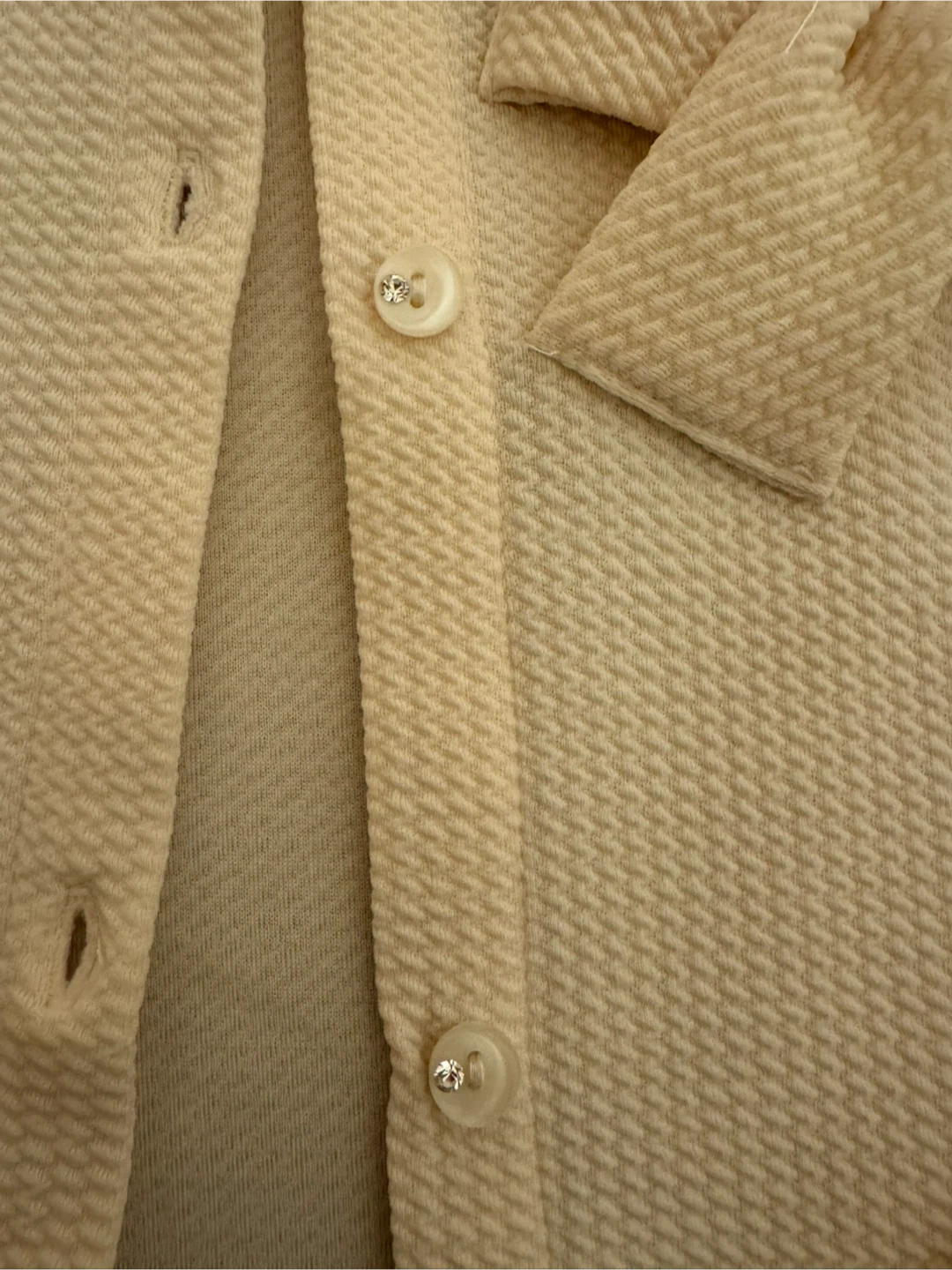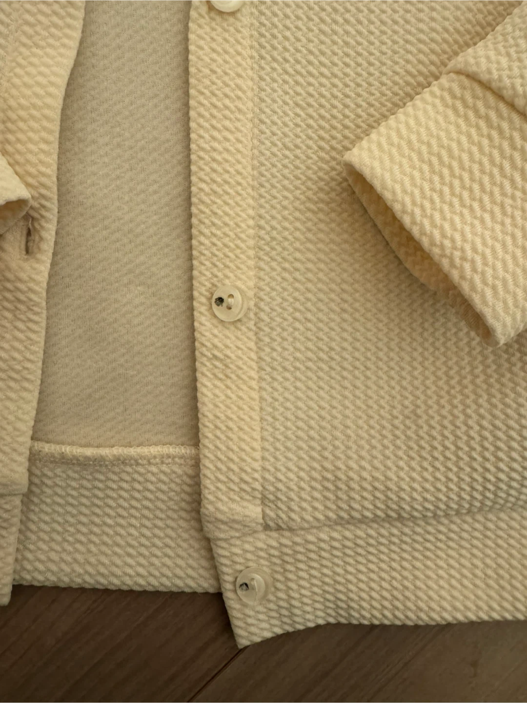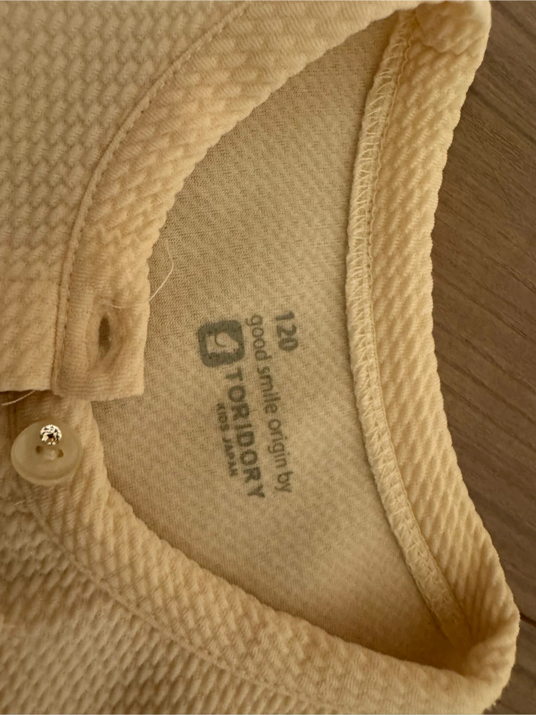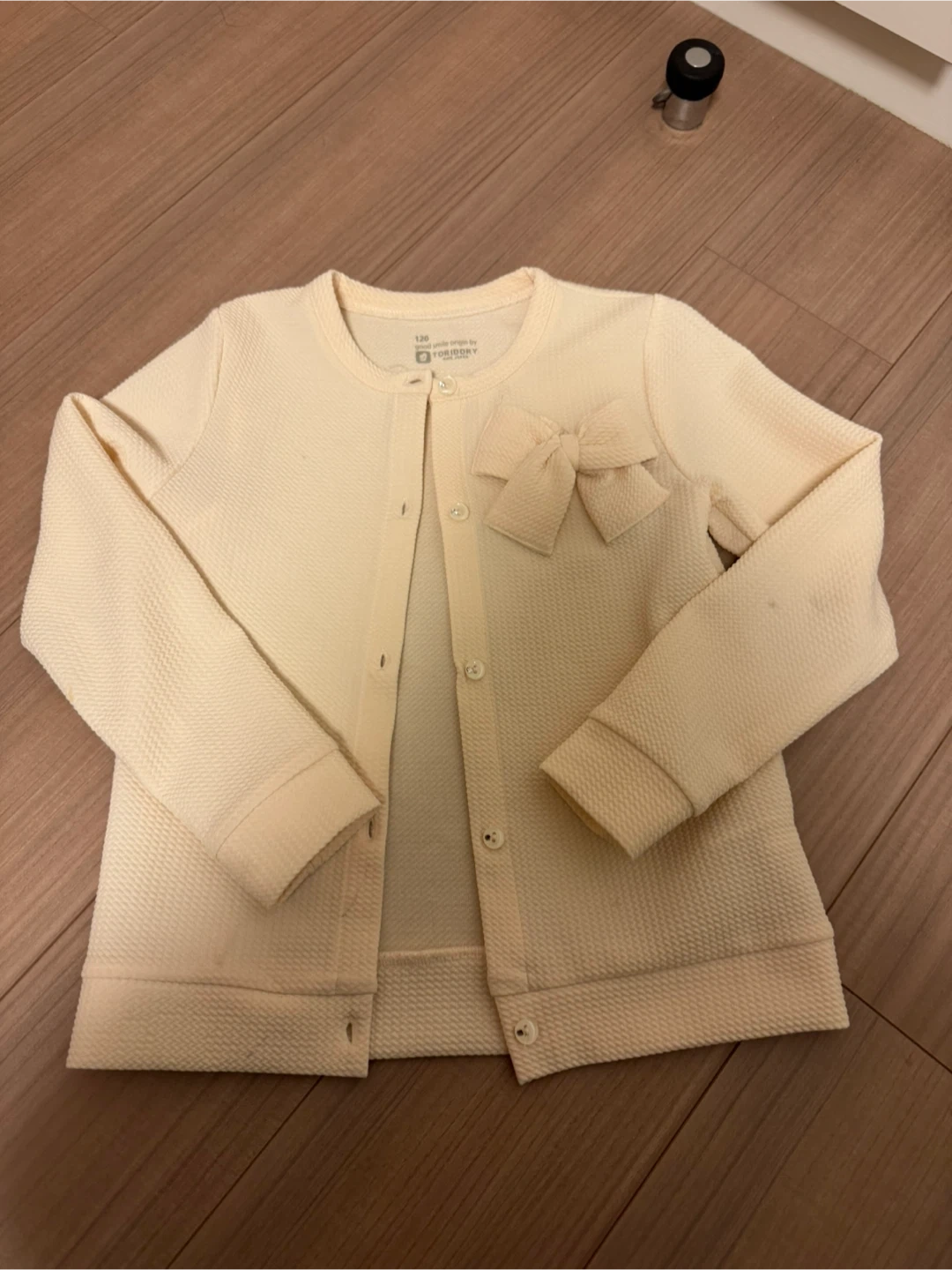 トリドリーのキッズカーディガンです 【情報】 ブランド:トリドリー サイズ:120 色:オフホワイト 素材:ポリエステル100% 【状態】 使用感少なめ ボタンのストーンが二つとれています (下の2個) 中古品であることご了承ください