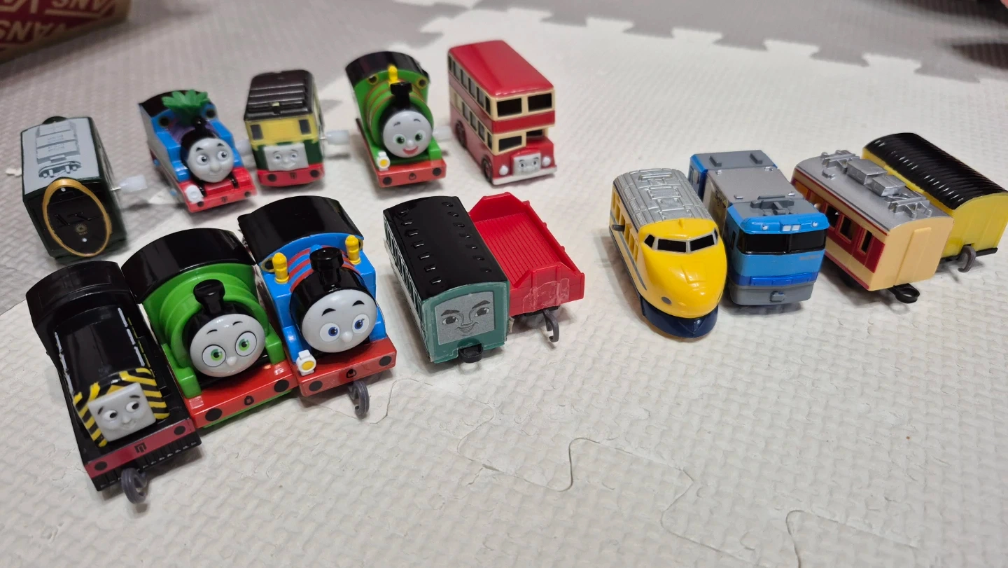 トーマスのキャラ多め。 一部、ネジ巻きタイプで走ります。 赤い車体のは顔がついてたが剥がれてます。 線路付き。 黒い線路は一緒に写っている電車用です。 電車が少し大きめ。 受け渡し場所や日時についてはプロフィールをご確認ください。 宜しくお願いします。