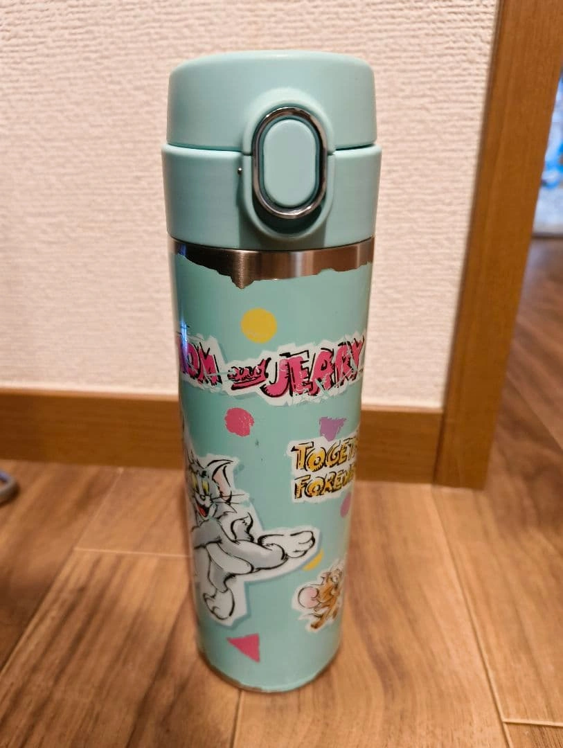 トムとジェリーのデザインが施されたミントグリーンのステンレス製タンブラーです。 - デザイン: トムとジェリーのキャラクターとカラフルな模様 - 色: ミントグリーン - フタのタイプ: ワンタッチオープン - 素材: ステンレス製 開け口が少し壊れているかもしれません。 ご覧いただきありがとうございます。