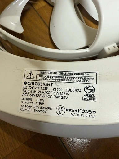 37000円のものです。 CIRCULIGHT(サーキュライト) EZシリーズ 音声コントロール スイングモデル 12畳タイプ DCC-SW12EV【SH】 ★Amazonでランキング1位を獲得した、人気モデルです!! ★音声で反応します。 ★付属品は写真のものが全てです。説明書はありません。 ★リモコンに電池は付きません。 ★本体とリモコン、リモコンケースのみ CIRCULIGHT(サーキュライト)に取り付けカンタンなEZシリーズが登場 引掛けシーリングの形に関わらずネジ止め不要で簡単に取り付けができるモデルです。 本モデルはさらに新機能「音声コントロール」を追加! リモコンいらずでライト・ファンのON/OFF、明るさ・風量の調整などの主要な機能を声で操作ができるようになりました! リモコンが見つからない、両手がふさがっているなどの環境でも操作が可能です。 ボイスコントロール機能は本体を設置するだけで、Wi-Fi環境・設定など不要でお使いいただけます。 また、お部屋の中にくまなく風を届けるスイング機能を搭載スイング角度も2段階調整が可能で 使うシーンに合わせて切り替えが可能です。 商品仕様 ■電源:AC100V 50/60Hz ■定格消費電力 LEDライト部:(約)51W(100%点灯時) ファン部:(約)19W(風力最大時) ■器具光束:(約)5000lm ■機能 LEDライト部:調光10段階、調色7段階、常夜灯2段階 ファン部:風量7段階調整、正逆回転切替、スイング機能2段階・回転2段階、リズム、オフタイマー ■外形寸法:(約)Φ450mm × 高さ245mm ■重量:(約)2.1kg ■配送サイズ(約):幅510×高さ510×奥行310mm #DCC-SW12CM ご不明点はお気軽にお問い合わせください。