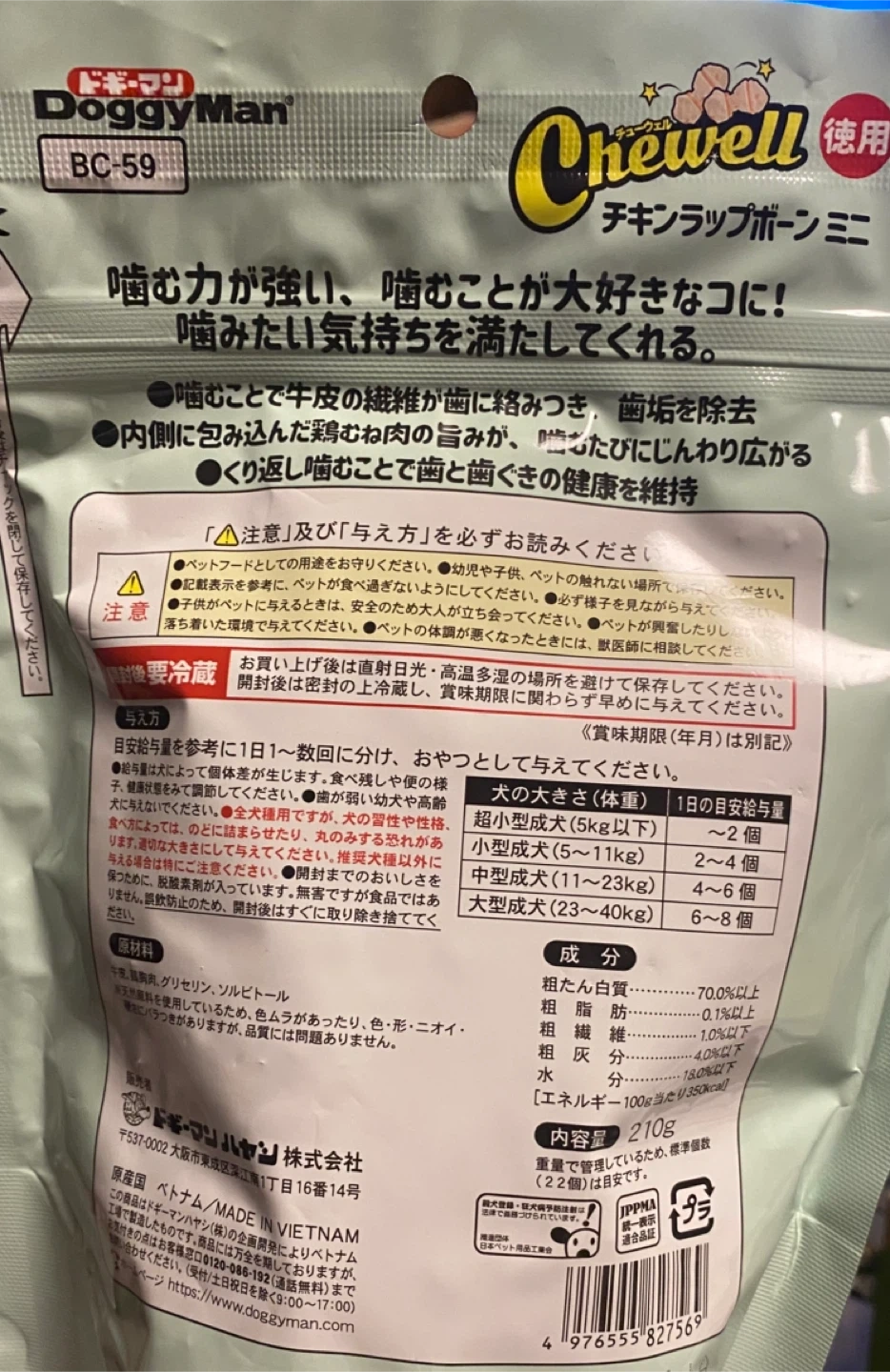 ドギーマンの犬用デンタルガムです 【情報】 ブランド:ドギーマン 商品名:チューウェル チキンラップボーン ミニ 内容量:210g(標準22個) 対象:超小型犬・小型犬 賞味期限:2025年10月 平日の19時以降、土日は終日お時間調整可能です。 自宅保存ですので神経質な方の購入をお断りしております。 ※トラブル等を防ぐため気になる事がございましたら、ご質問お待ちしております。 スムーズなお取引を心がけておりますのでどうぞ宜しくお願いします。