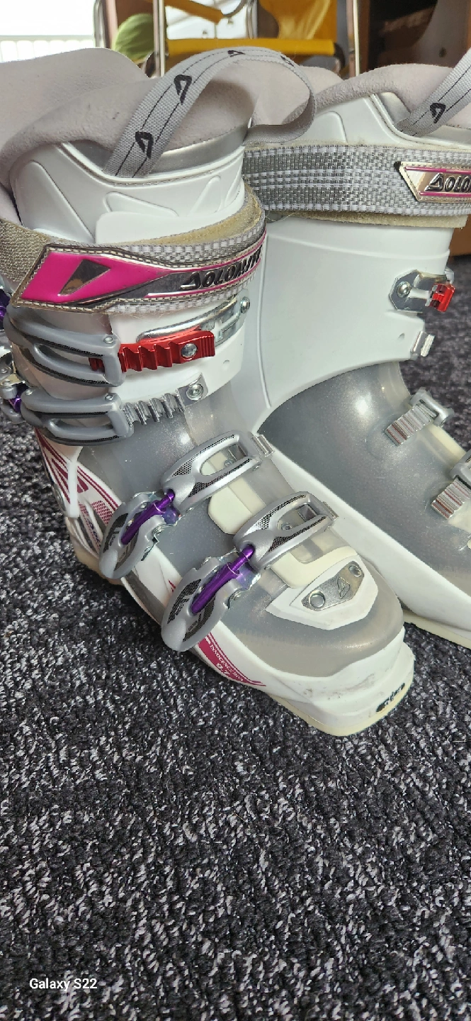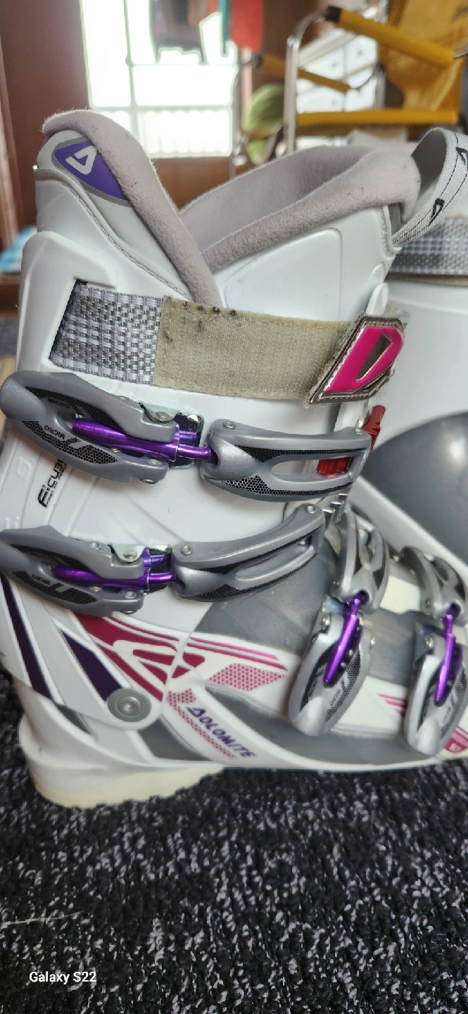 ドロミテのスキーブーツです ・ブランド:ドロミテ ・カラー:シルバー、パープル ・サイズ25.5  スニーカーだと24.5位です。 ・ブーツ用バッグを付けます ・2シーズンで4回程履いてます ・履いてから決めて頂いても結構です。 ・必要でしたらこのブーツに合わせたスキー板とストックも有りますのでご相談に乗ります。 中古品であることご了承ください