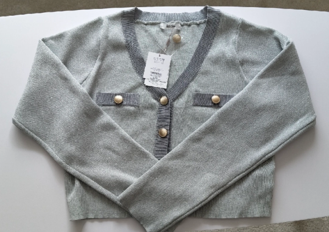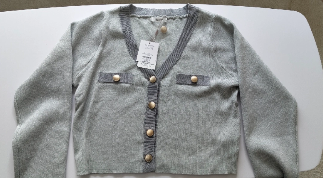 ラメ入りのニットカーディガンです ・ブランド NICE CLAUP ・色:シルバー グレー ・新品タグ付き ・サイズ:F ・着丈44cm 身幅脇下48cm 5500円 新大久保 市ヶ谷 牛込神楽坂でお渡し可能です