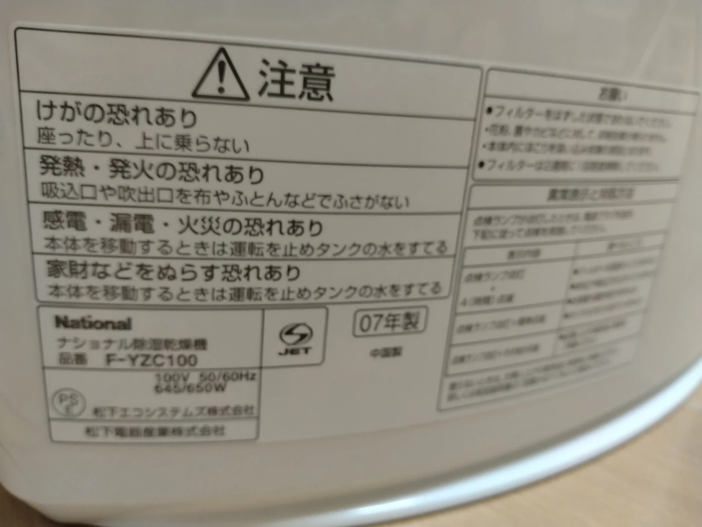ナショナルの除湿乾燥機です。 【情報】 ブランド:ナショナル 型番:F-YZC100 年式:07年製 もう使わないため、出品します。 動作確認済ですが、中古品であることをご了承いただき、ノークレーム、ノーリターンでお願いします。