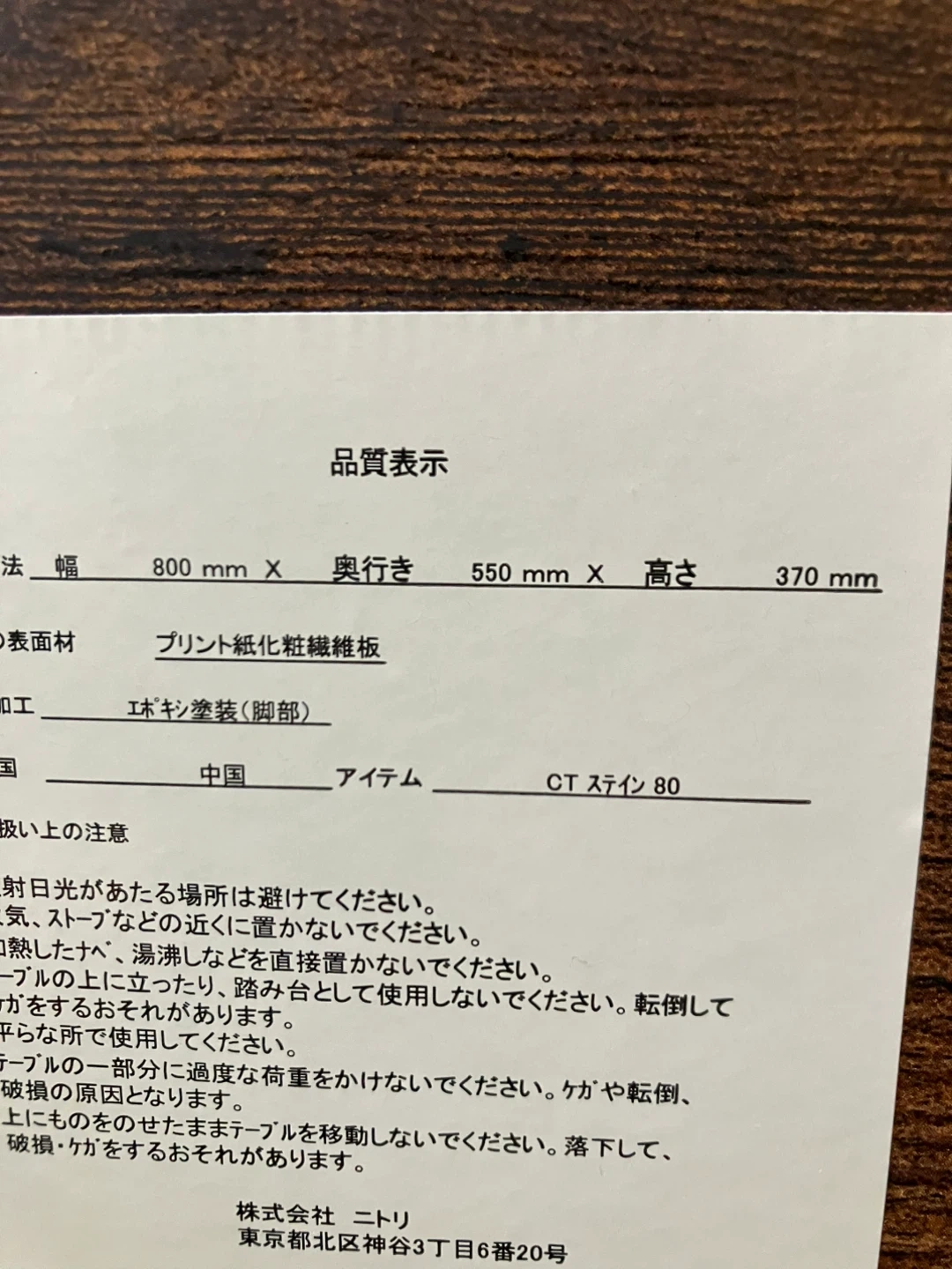 ニトリのローテーブルです。お近くでしたら手渡しでも大丈夫だと思いますが、大きいものなので受け取り方法などご検討ください。 【情報】 ブランド:ニトリ 商品名:CTステイン80 サイズ:幅800mm × 奥行き550mm × 高さ370mm 【状態】 目立たない小さな傷はありますが、キレイめだと思います。サイドにコードを引っ掛けるフックをつけていまいましたが、撮ると汚くなりそうなのでそのままにしています。 中古品であることをご了承ください。