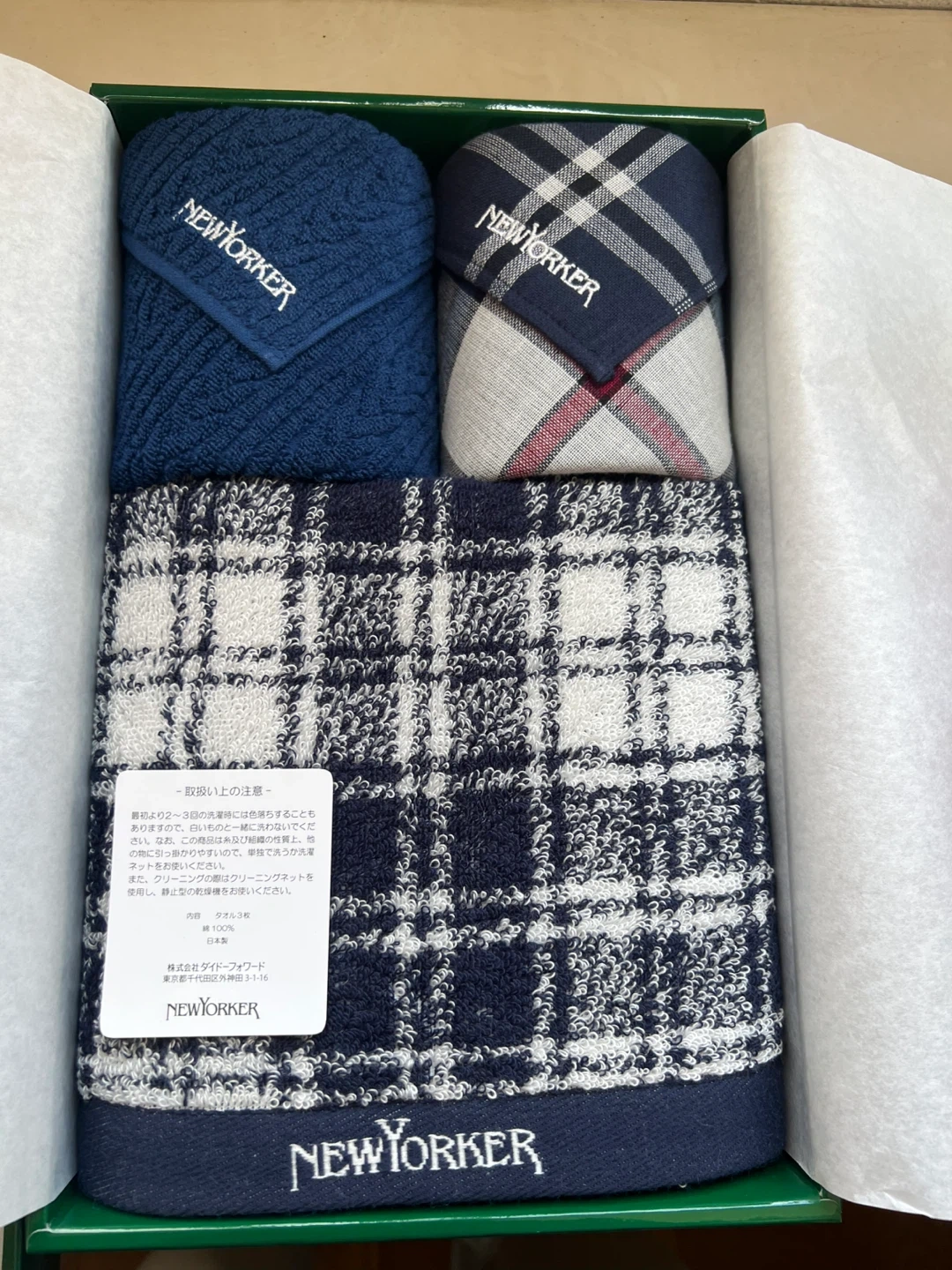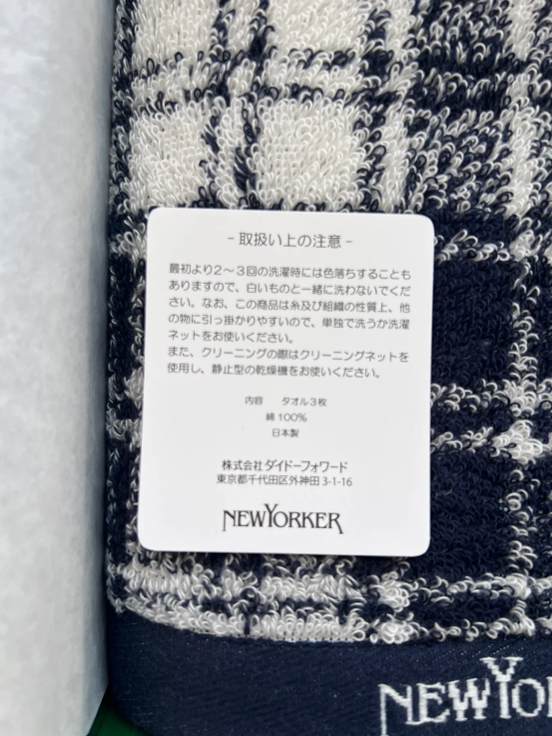 ニューヨーカーのタオル3枚セットです 【情報】 ブランド:ニューヨーカー 内容:タオル3枚 素材:綿100% 【状態】 未使用品 ダイドーリミテッドの2017年か2018年くらいに株主優待としてもらったものです。 未使用ですが、長期間タンスで保管していたものであることをご理解ください。 主な取引可能な日時 ①土日祝7:00~20:00 ②平日20:00~22:00 ※平日は仕事のため、可能な限り土日祝での取引を望んでいます。