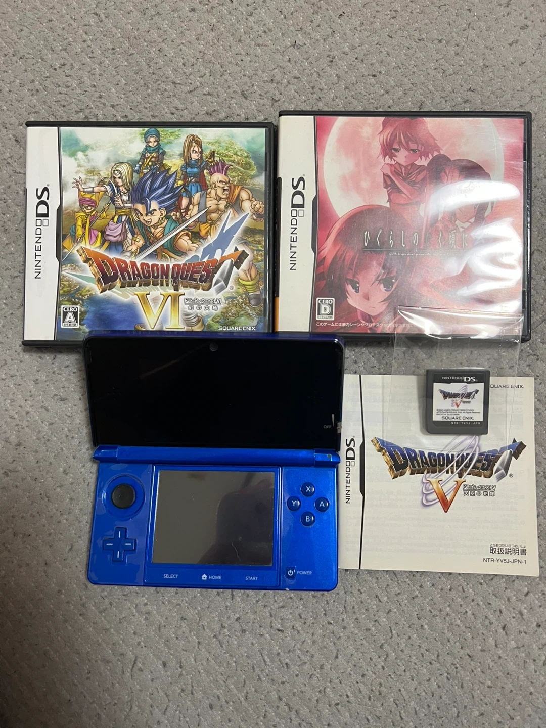 ニンテンドー3DS本体とゲームソフトのセットです。 ・ニンテンドー3DS本体(ブルー) ・ドラゴンクエスト VI 幻の大地 ・ドラゴンクエストV 天空の花嫁(DS) ・ひぐらしのなく頃に 一巻 (DS) ・ひぐらしのなく頃に絆 二巻・想(DS) ・桃太郎電鉄DS TOKYO&JAPAN(DS) ・ポケットモンスターY(3DS) ・充電器 中古品であることご了承ください。 スティックのゴムがありませんが問題なく動作します。 NC.NRでお願いします。