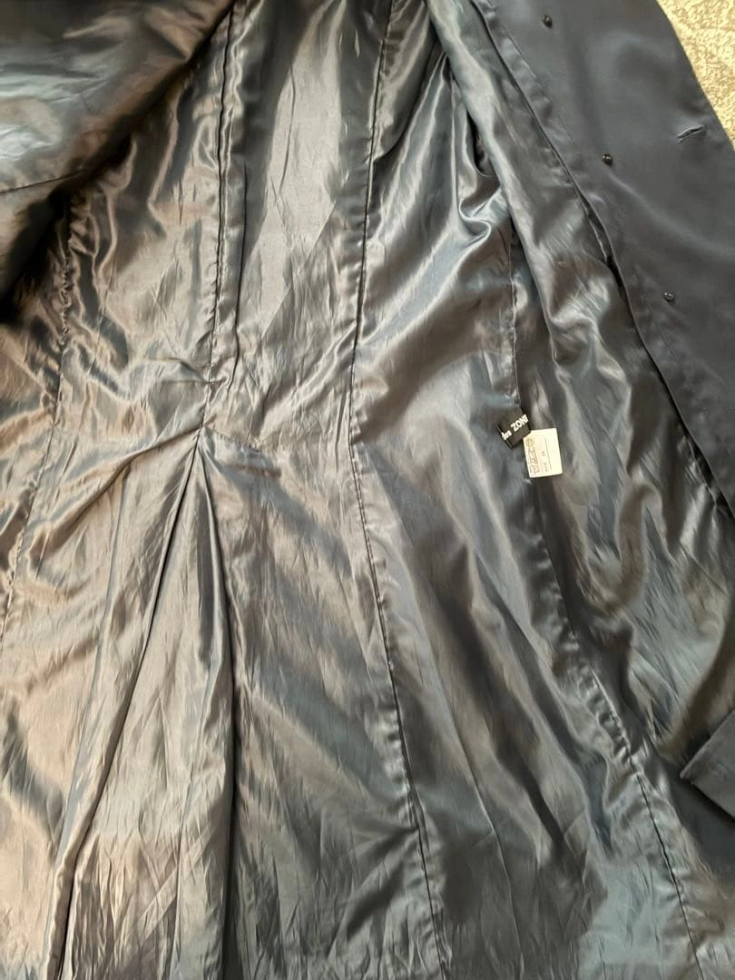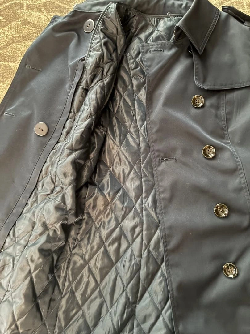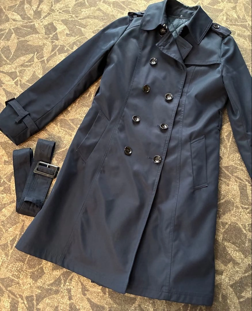 ネイビーのダブルブレストトレンチコートです。ウエストベルト付き。 数年前に百貨店で購入しました。定価で3万前後だったと思います。 汚れやほつれ等なく綺麗なため、まだまだ活躍していただけます。 インナーのキルティングライナーは取り外し可能で、 秋・冬だけでなく春先まで長く着用できます。 上部はボタン、サイドはジッパーなので簡単に取り外しできます。 お写真5枚目がインナーダウンを外した状態です。 首元は上までボタンでとめられる他、襟もフックでとめられるため、寒い時期でも隙間風が入り込みづらいです。 - 色: ネイビー - スタイル: トレンチコート - ボタン: ダブルブレスト - 特徴: ウエストベルト付き - ポケット: 両サイドポケットあり - サイズ:38 ご覧いただきありがとうございます。