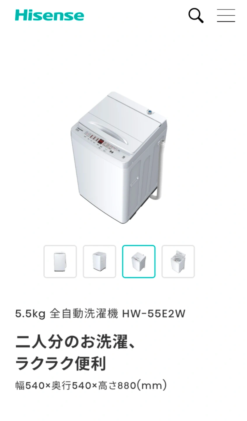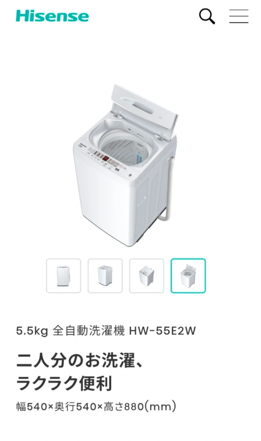 ハイセンスの全自動洗濯機5.5kgです。 【情報】 ブランド:ハイセンス 型番:HW-55E2W 容量:5.5kg サイズ:幅540×奥行540×高さ880(mm) 消費電力量:97Wh/102Wh 標準使用水量:約98L 最短洗濯時間:約14分/約14分(50Hz/60Hz) 【特徴】 ・ステンレス槽 ・コンパクトスリムボディ ・ローダウン設計 ・洗剤投入ケース ・使いやすい操作パネル ・簡単な予約機能 ・充実した洗濯コース ・独自形状パルセーター ・立体シャワー水流 1年ほど使用し、使用中の不具合は一切ありませんでした。 見た目の汚れや傷は特にないです。 ※中古品であることをご了承ください。 お引渡しは1月下旬予定です お気軽にご連絡下さい!