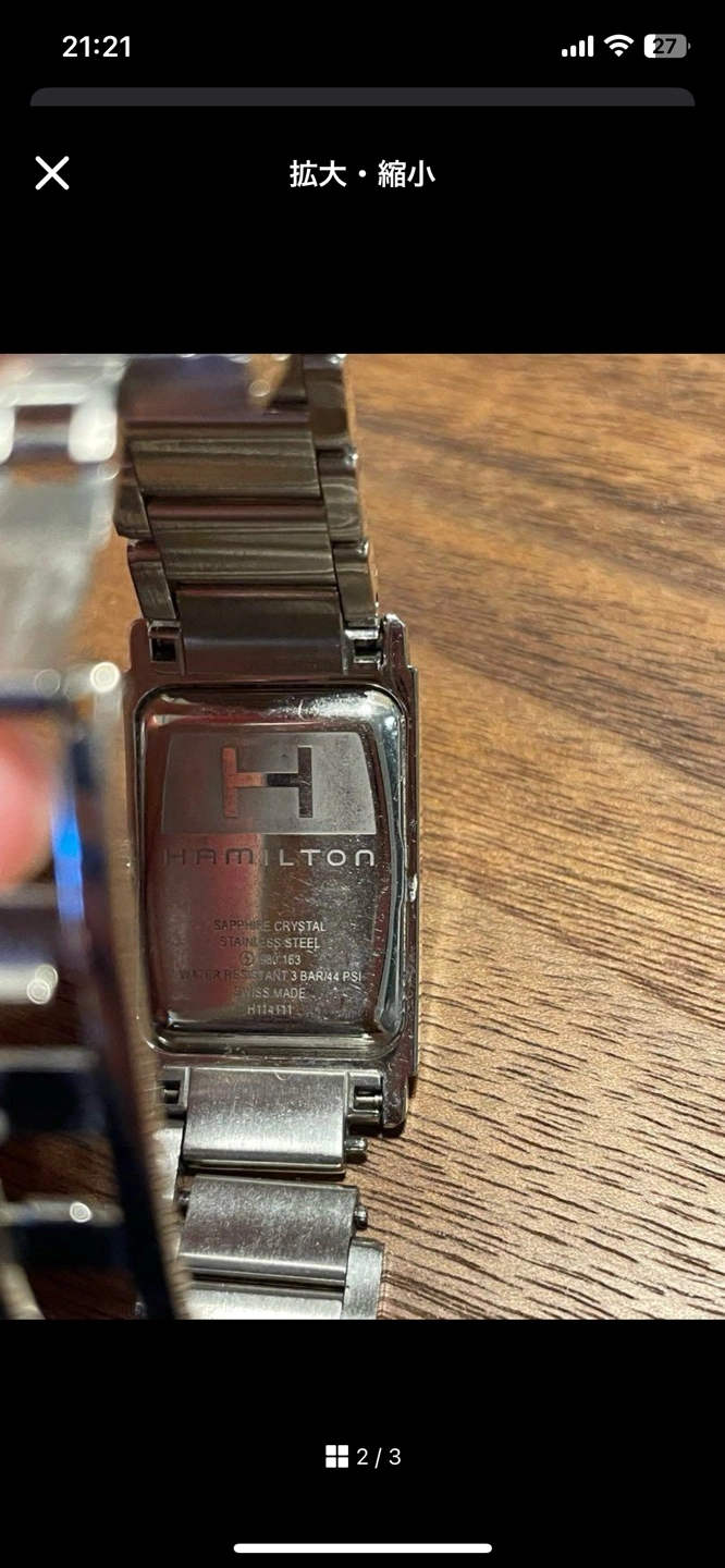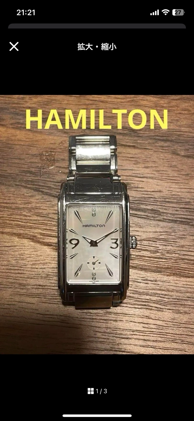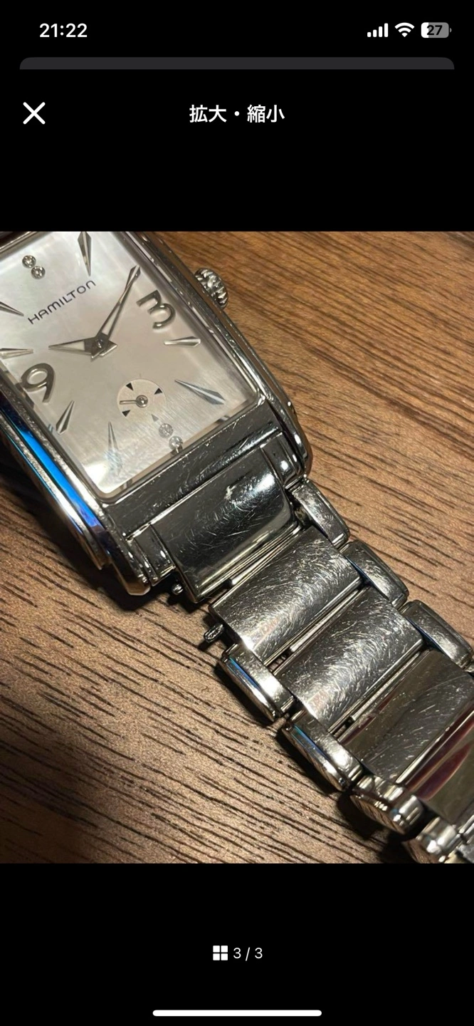 ハミルトン アードモアです。 稼動品ですがバンドの部品の一部が取れてしまったため出品します。 取れた部品も保管しています。 直せる方いかがでしょうか? また、出品後に電池が切れたため、電池交換も必要です。 【品番】H11411115 【ムーブメント】クォーツ 【素材】ステンレス/ミネラルクリスタル 【文字盤】ホワイトシェル2時と6時に天然ダイヤ【サイズ】縦32mmx横23mm/厚さ約7mm 【防水】30m防水 新丸子駅周辺または武蔵小杉駅周辺でも受け渡し可能です。