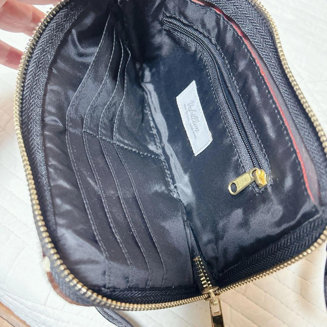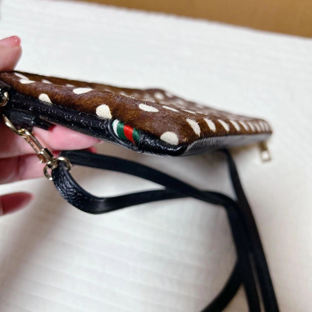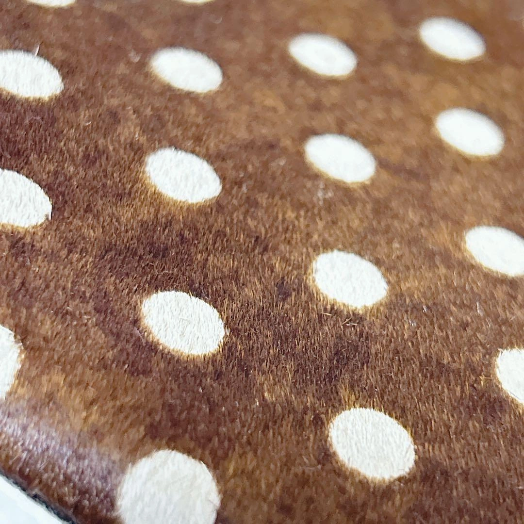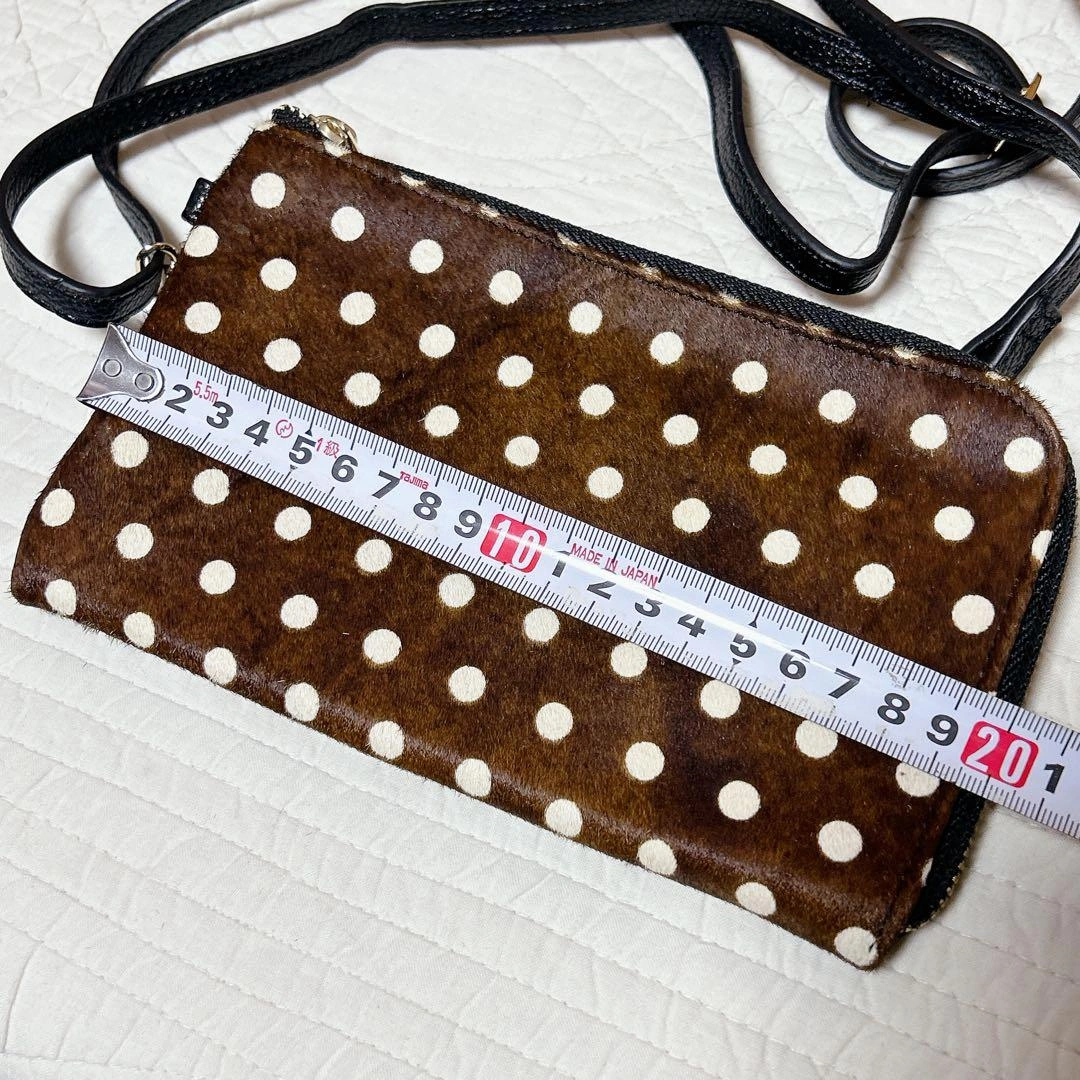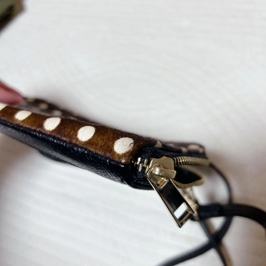 茶色ハラコ素材に白の水玉模様のスマホショルダーバッグです。ストライプデザインの透明ポケットが付いています。 L字ファスナーで使いやすいです。 本体には目立つキズ等は見当たりませんが、ショルダーベルトに小さな傷がありました。 1度旅行でパスポート入れに使用したあと、保管していました。usedにご理解頂ける方のみお願い致します。 ご不明な点がございましたらお気軽にお問い合わせください。 - 色: 茶色と白の水玉模様 - デザイン: ストライプと透明ポケット - 内部構造: ファスナー付きポケットとカードスロット