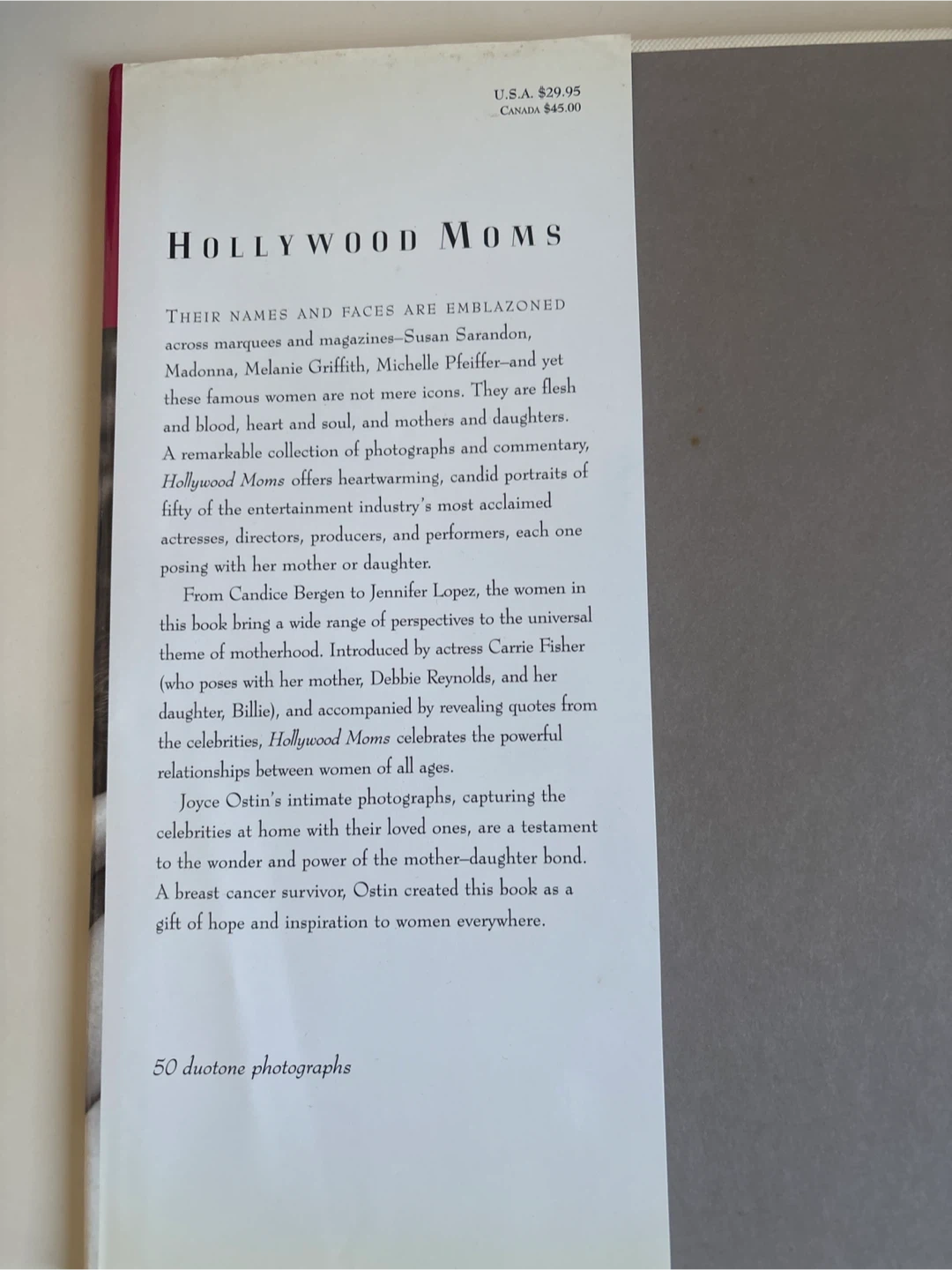 ハリウッド・MOMSの写真集です。 ハリウッドの女優さんや歌手の方の母娘の写真がとても微笑ましくて20年くらい前にアメリカで購入。 本の大きさは28✖️26✖️3㎝くらいです。 ところどころのページに最後のページのようなシミがあります。写真の部分はきれいです。 111組の母娘の写真です。 お家やお店のインテリアにいかがでしょうか。 ・タイトル:HOLLYWOOD MOMS ・Introduction by Carrie Fisher ・Photographs by Joyce Ostin 中古品であることをご了承ください。