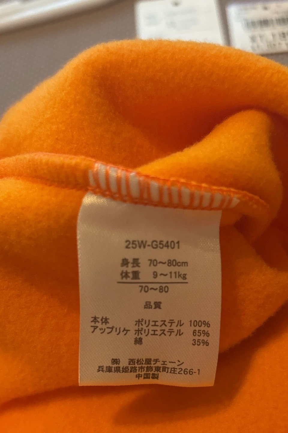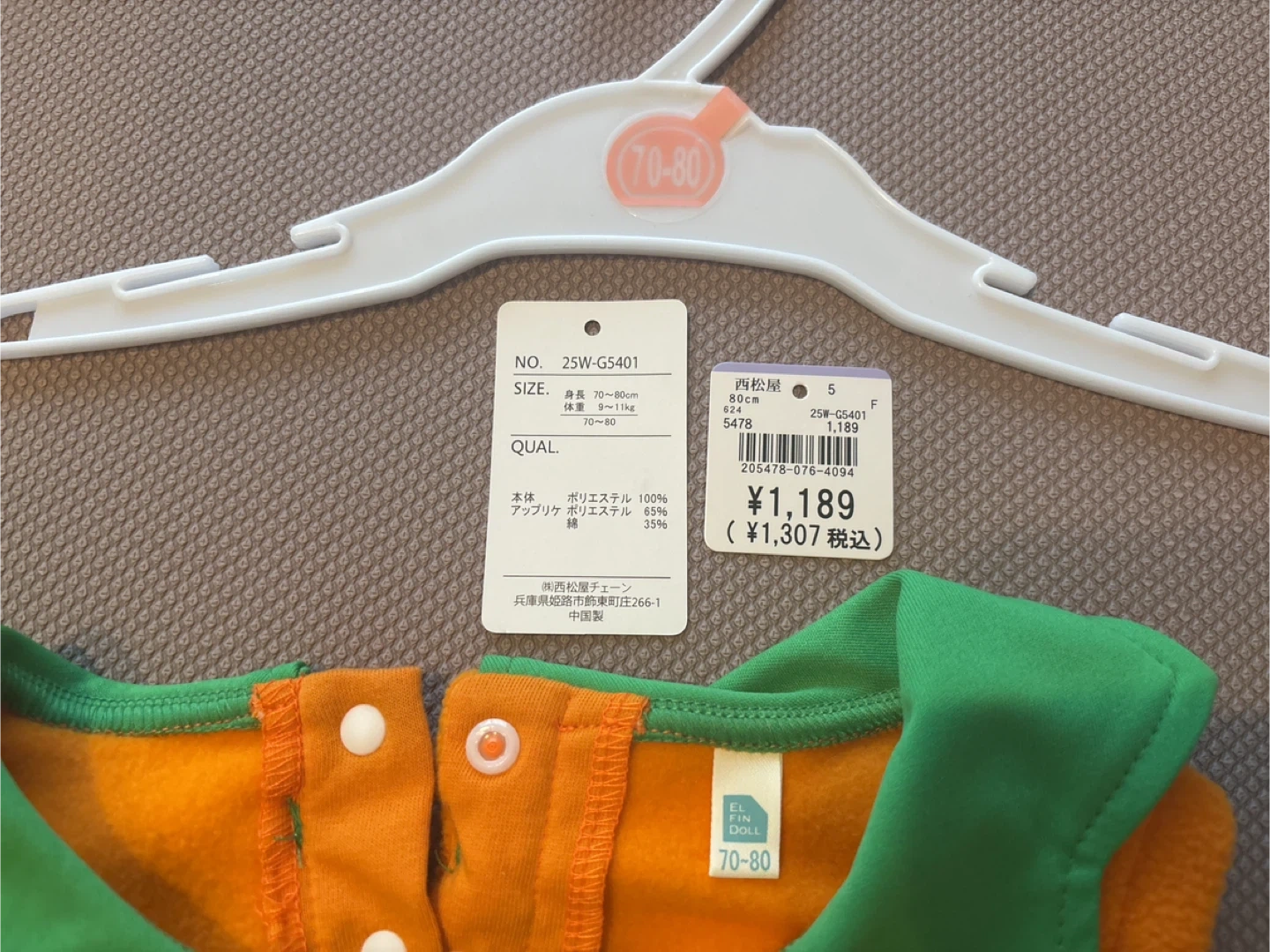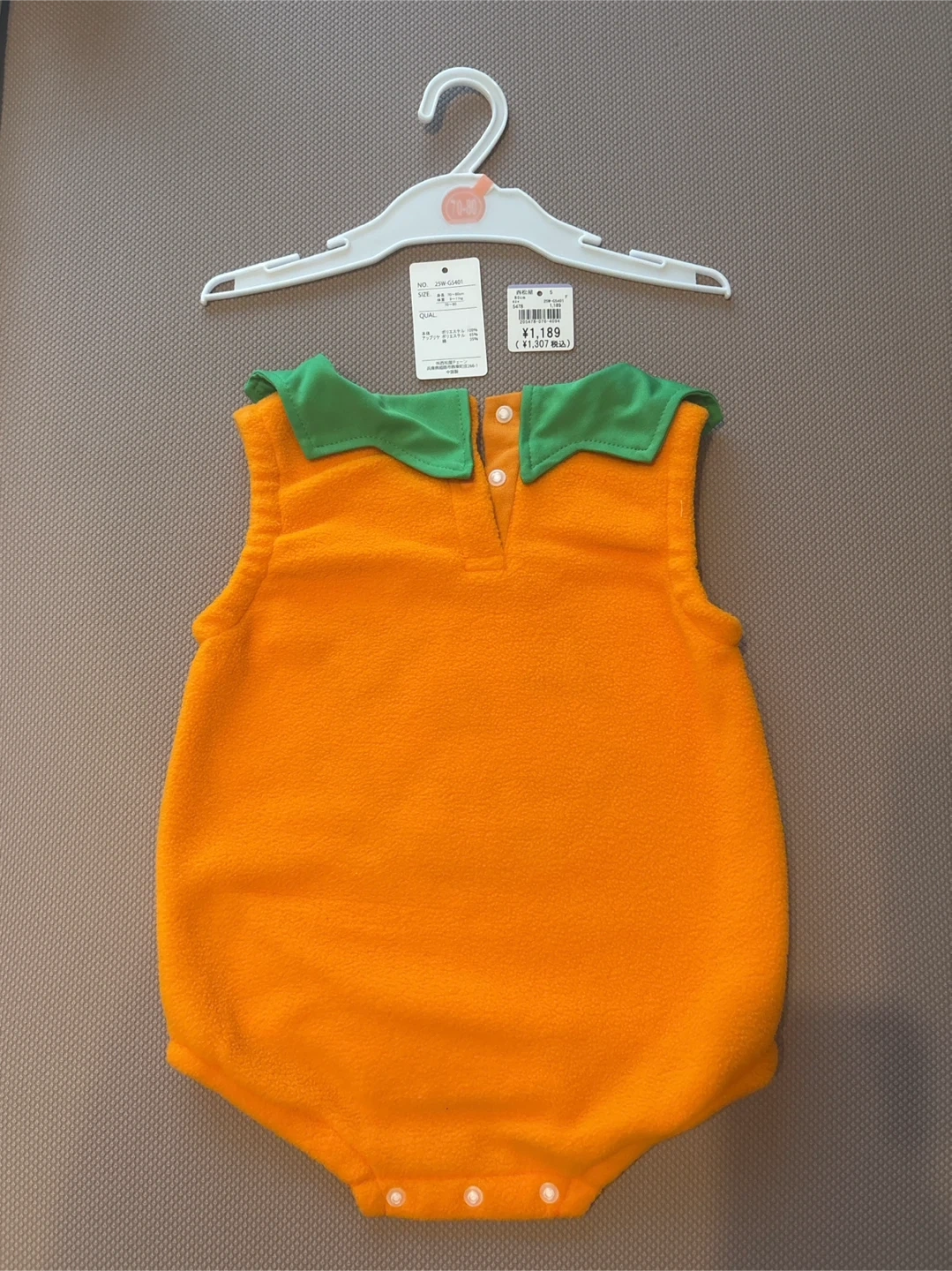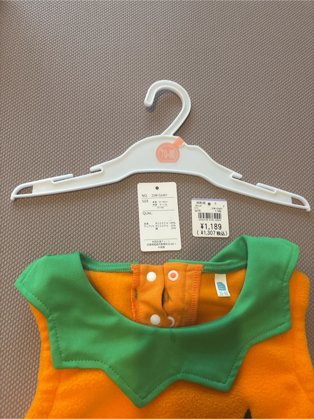 西松屋のかぼちゃロンパースです 【情報】 ブランド:ニシマツヤ サイズ:70-80cm 型番:25W-GS401 素材:ポリエステル100%、アップリケ ポリエステル65%、綿35% 【状態】 10月上旬に西松屋オンラインショップで購入しました。 10/31に袋から出しタグを切り、下着の上から着せて、自宅撮影のために5分程使用しました。 洗濯は1度もしておりません。 ご希望でしたら、お渡し前にこちらで洗濯いたします。 中古品であることご了承ください。 日時、場所、金額など、お気軽にご連絡頂ければと思います。 気持ちよく取引できる方にお譲りできればと思います。 ご覧いただきありがとうございます。