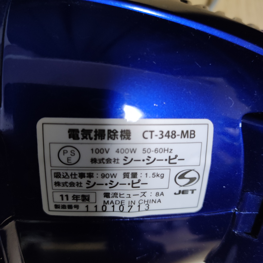 CCP シーシーピー CT-348-MB [ハンドクリーナー(コード式) メタリックブルー] 定格電圧AC100V, 50-60Hz 定格消費電力400W 吸込仕事率90W 集塵容積約0.5L 製品重量1.5kg(本体のみ) 製品寸法幅267 × 奥行134 × 高さ171mm(本体のみ) コードの長さ約5.0m ほとんど使わずに仕舞っていました。