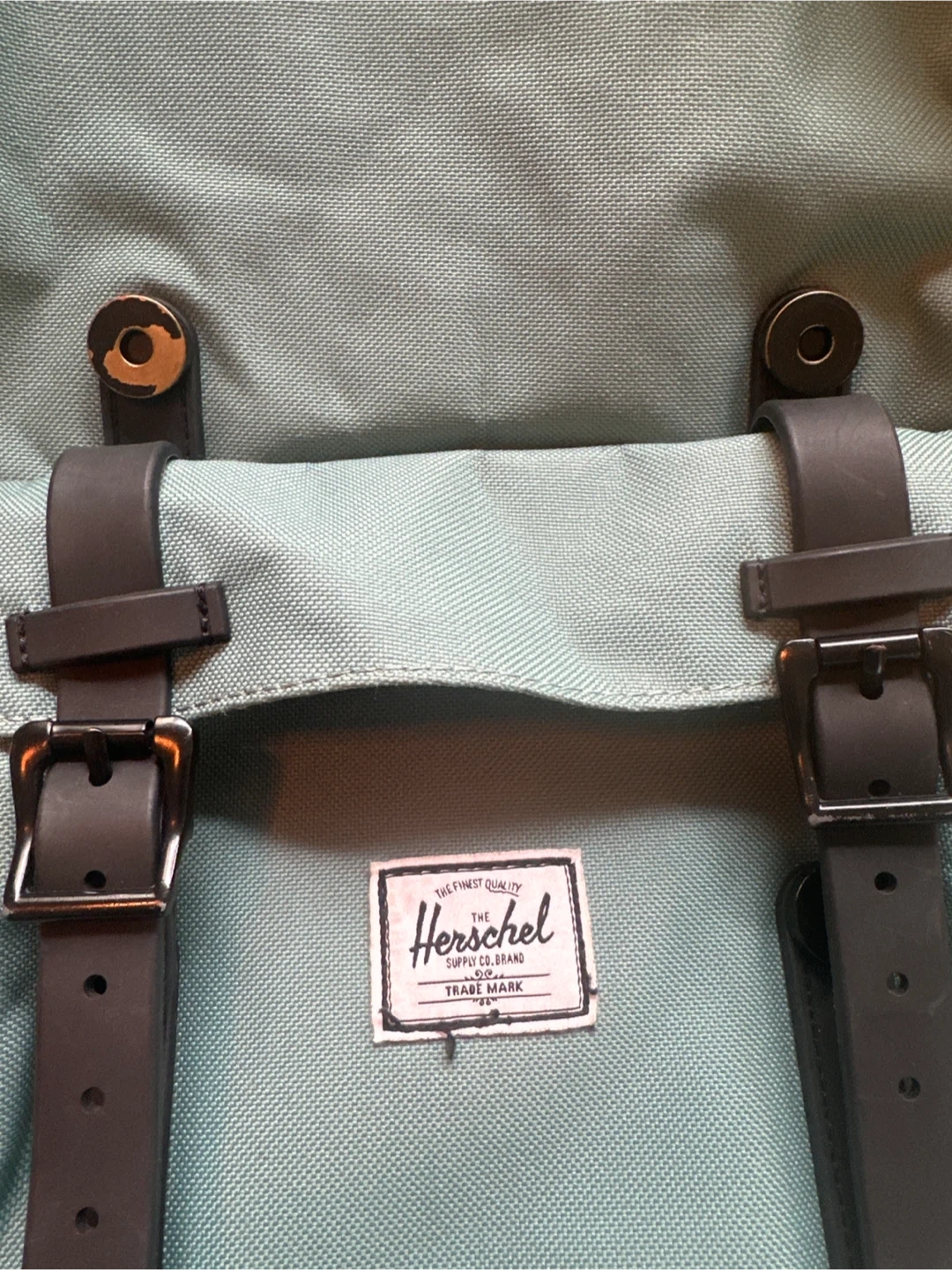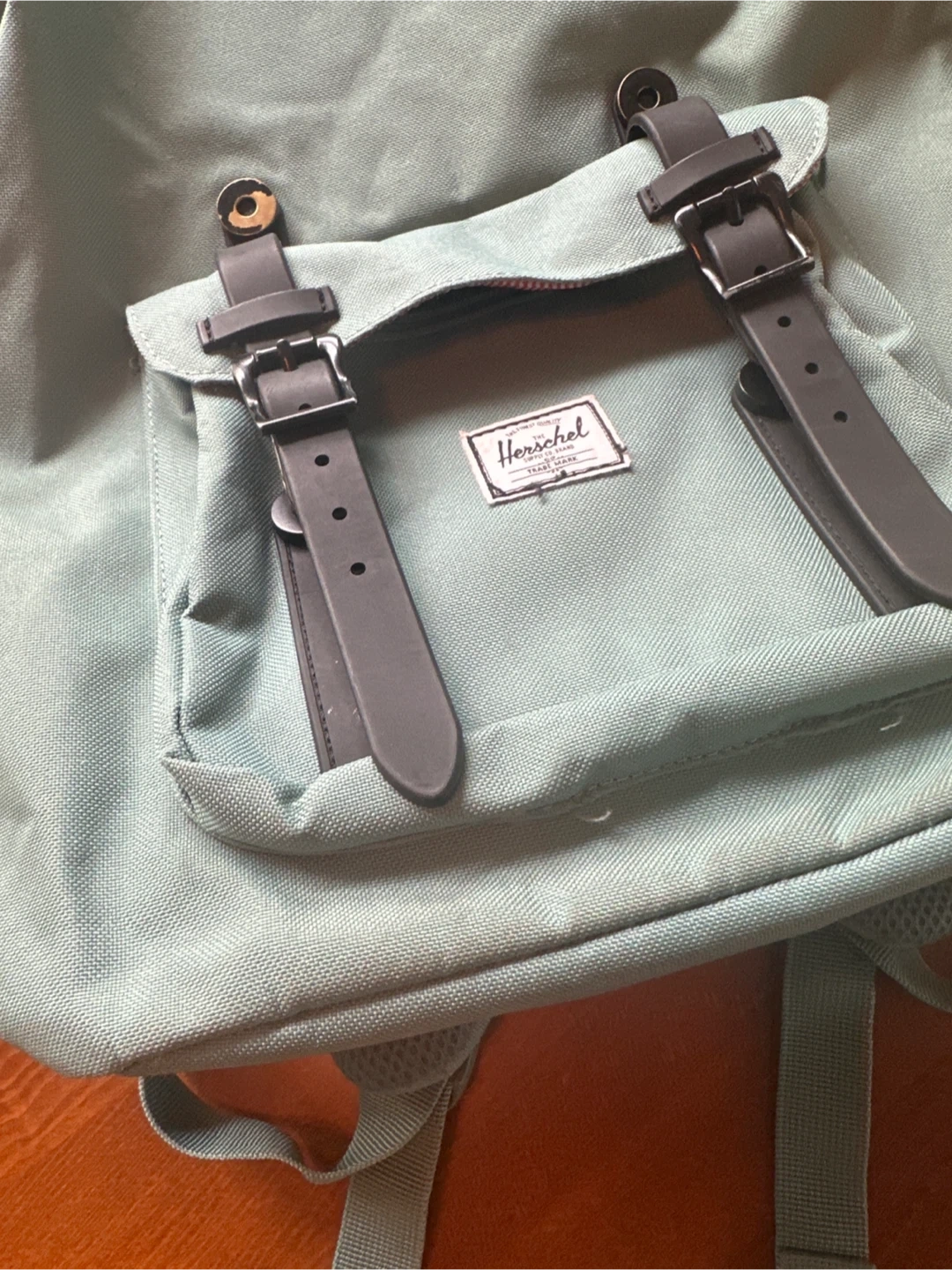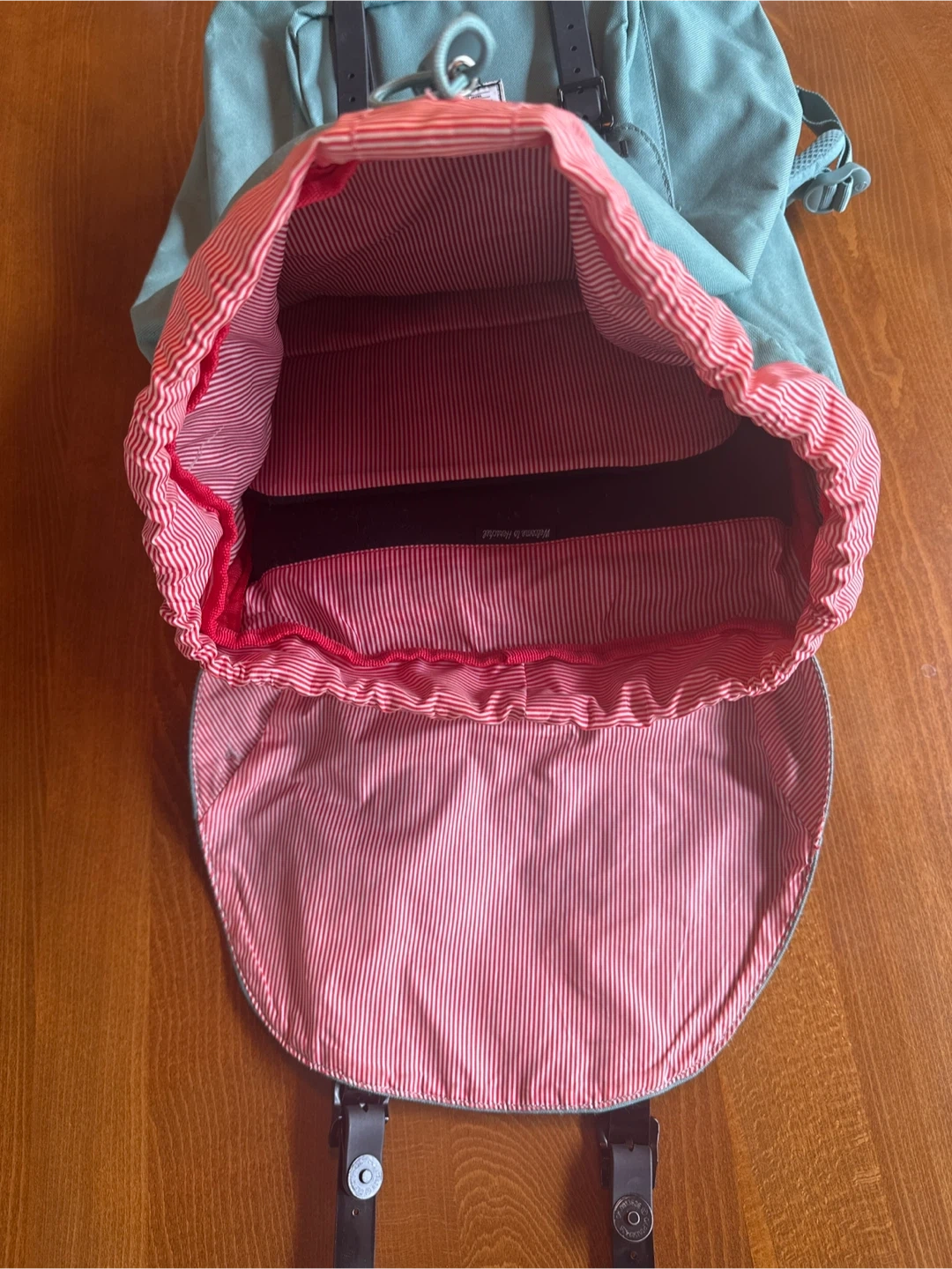 ハーシェルのリュックサック、縦50cm横40cmくらいで大容量です。 珍しい色で気に入って使っていましたが、断捨離のため出品いたします。 ・色:ミントグリーン ・内側は赤と白のストライプ柄 ・使用感少なめ 内側にPCを入れるためのクッション付き仕切りがあります。見る限りシミなどはなく、綺麗な状態かと思います。底の周囲がほんの少し色が変わって いますので、写真でご確認ください。 ご不明点があればお気軽にご連絡ください