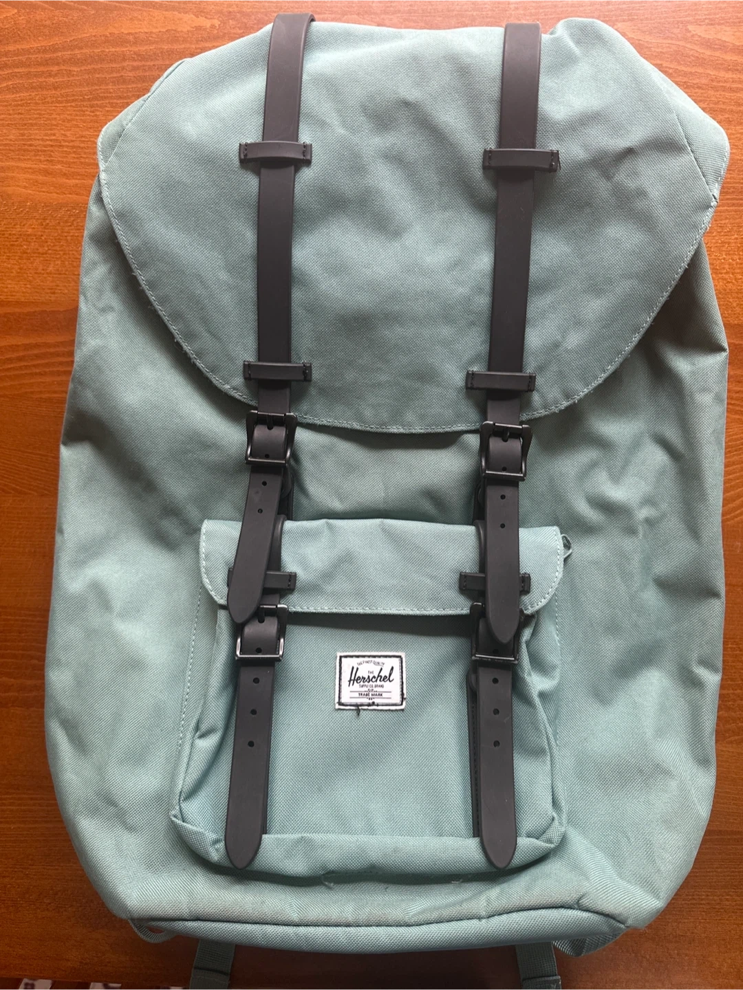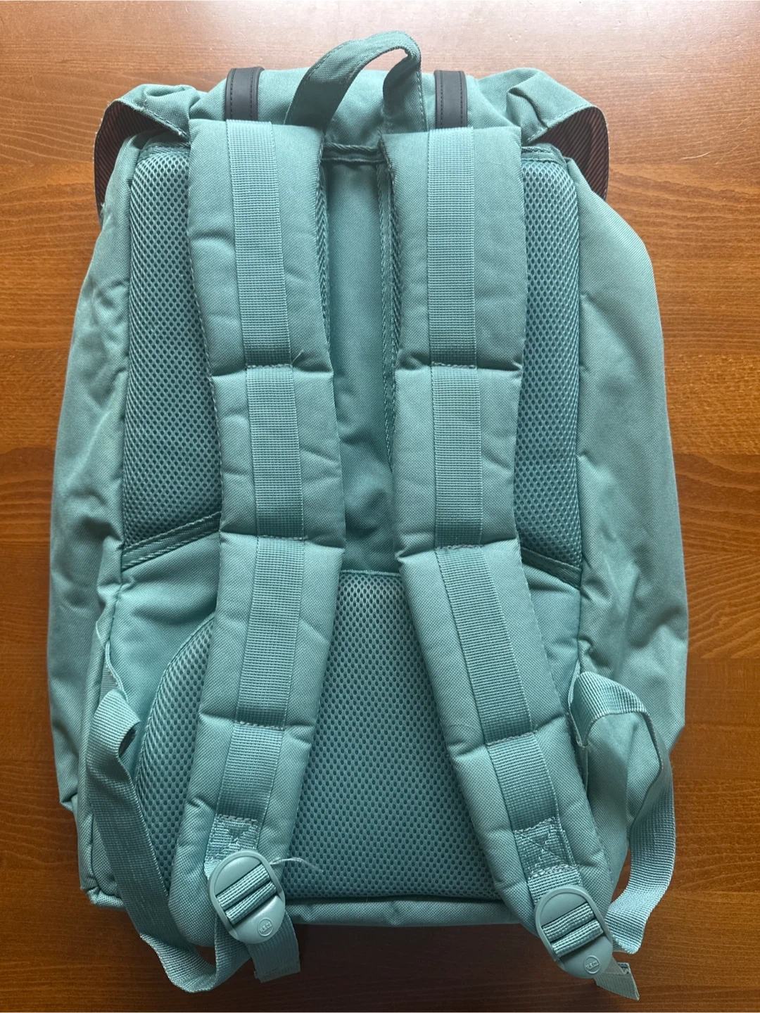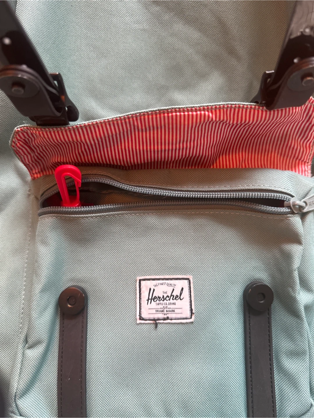 ハーシェルのリュックサック、縦50cm横40cmくらいで大容量です。 珍しい色で気に入って使っていましたが、断捨離のため出品いたします。 ・色:ミントグリーン ・内側は赤と白のストライプ柄 ・使用感少なめ 内側にPCを入れるためのクッション付き仕切りがあります。見る限りシミなどはなく、綺麗な状態かと思います。底の周囲がほんの少し色が変わって いますので、写真でご確認ください。 ご不明点があればお気軽にご連絡ください