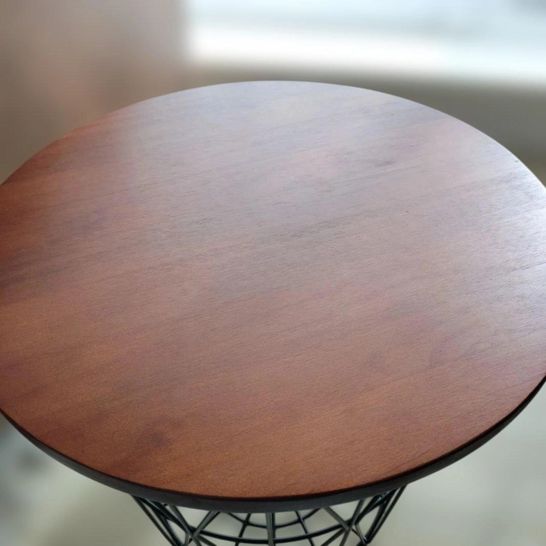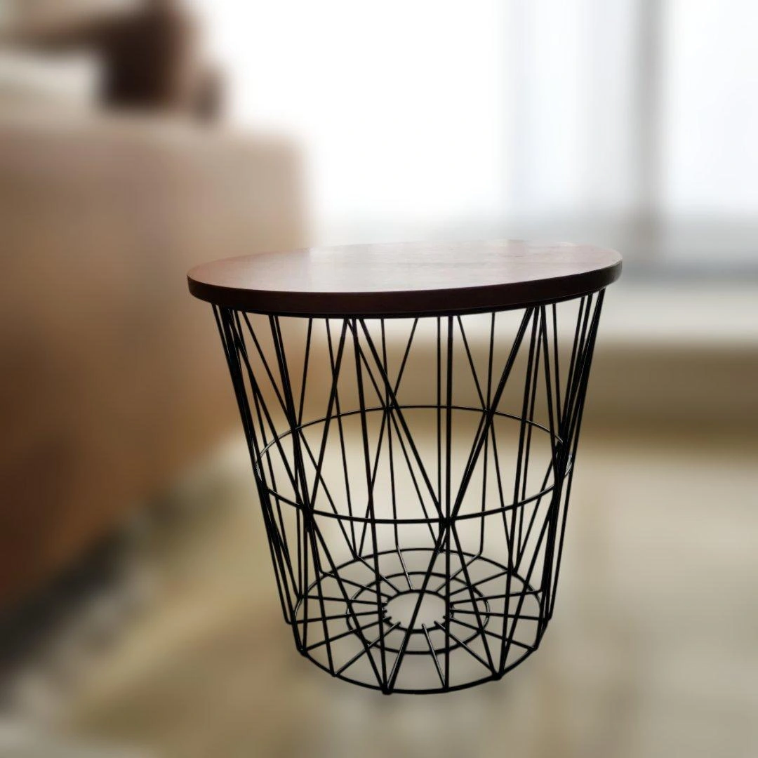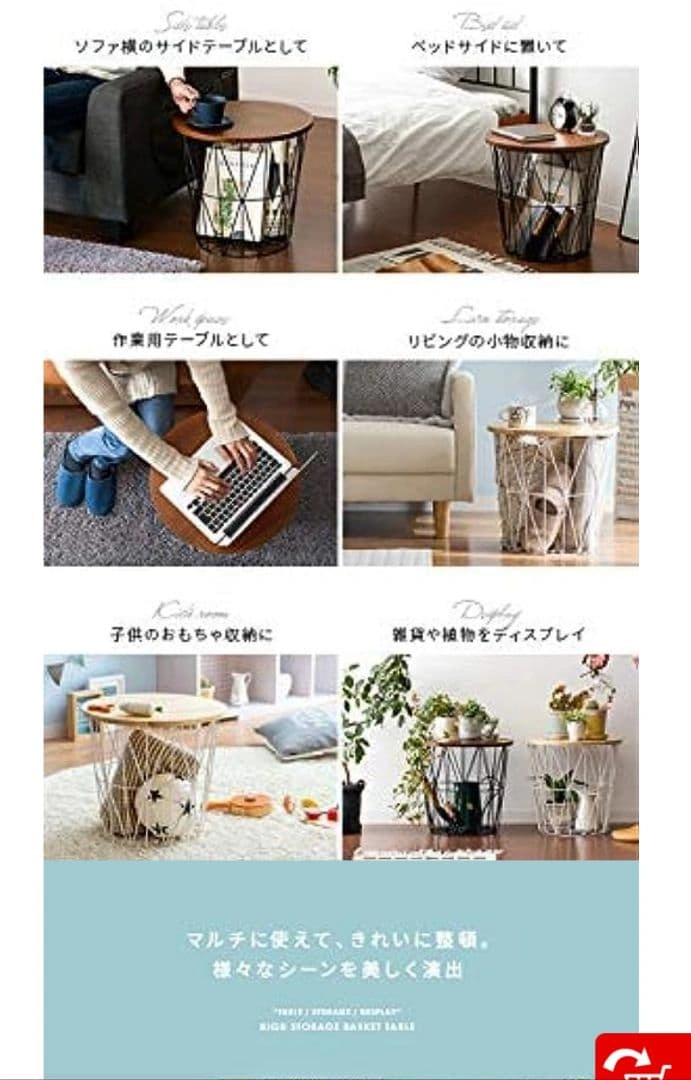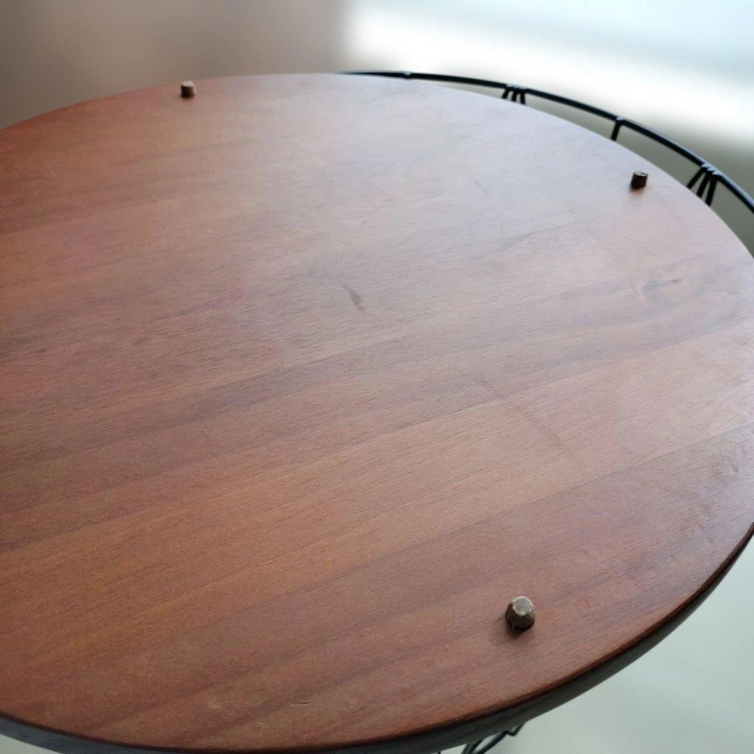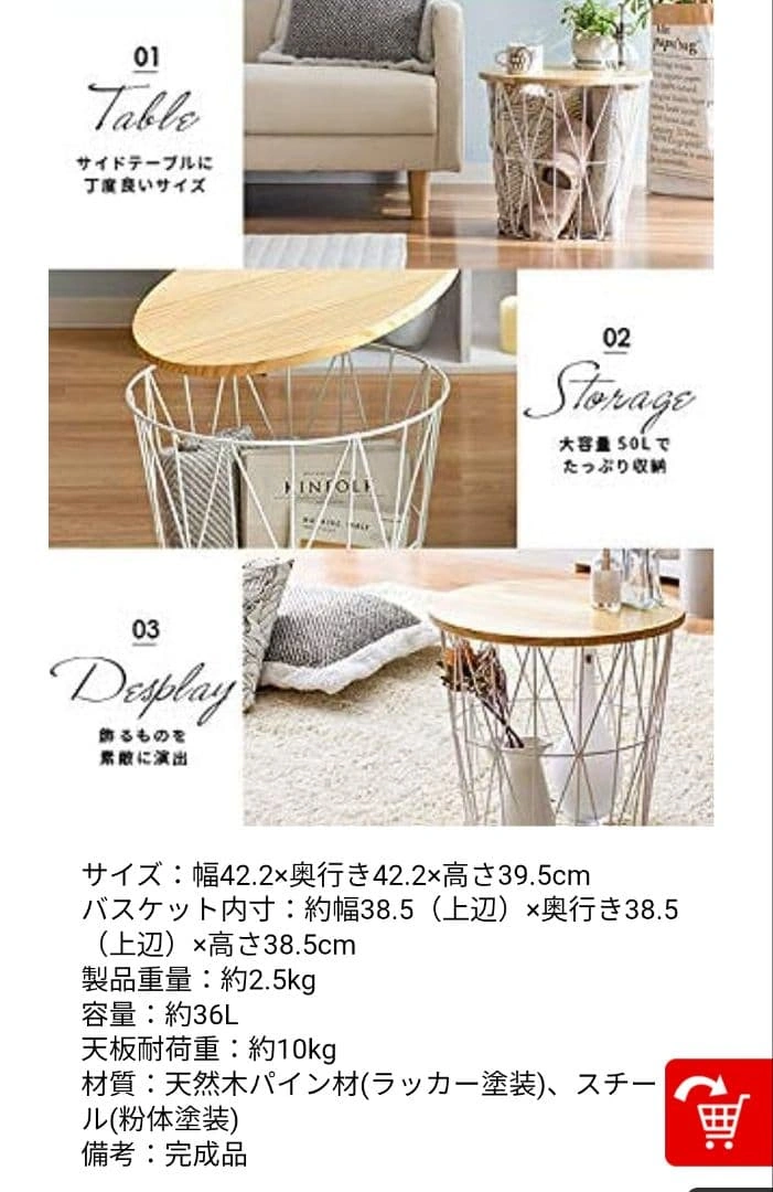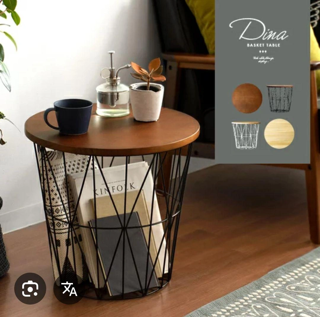 天然木パイン材とスチールの組み合わせのバスケットテーブルです。5枚目以降が実物の写真です。 【定価】約1万円 似たようなデザインのものが雑貨屋などで売られているのを見かけたことがありますが、それと比べるとこちらは作りがしっかりしており高級感があります。 1年ほどソファ横のサイドテーブルとして使用しておりました。置くだけで部屋がおしゃれな雰囲気になるところが気に入っていました。 こどもが産まれインテリアを変更するため今回出品します。 使用に伴う小さな傷が天板にありますので写真でご確認ください。使用には影響ありません。 9枚目のように天板裏にはダボが打ってあり、バスケットから落ちないように固定される仕様です。 以下サイトより引用 ----- ソ ファサイドやベッドサイドなど、様々なシーンにフィットするサイズ設計となっております。 直径42cmの天板は飲み物やお菓子、読みかけの本などを置いても余裕を持ってお使い頂けるサイズ感で、リラックスタイムをより快適にお過ごし頂けます。 容量約36Lで、散らかりがちな小物もすっきりひとまとめに。 ダイヤ型の美しいフレームデザインがリビング周りの雑多なものも自然と美しく見せ、上質な空間を演出いたします。 サイドテーブルとしての使いやすさと、高い収納力、空間のアクセントになるデザイン性を持ち合わせたサイドテーブルで、雑誌で見るような憧れの空間づくりを。 ご希望の方はお気軽にご連絡ください。