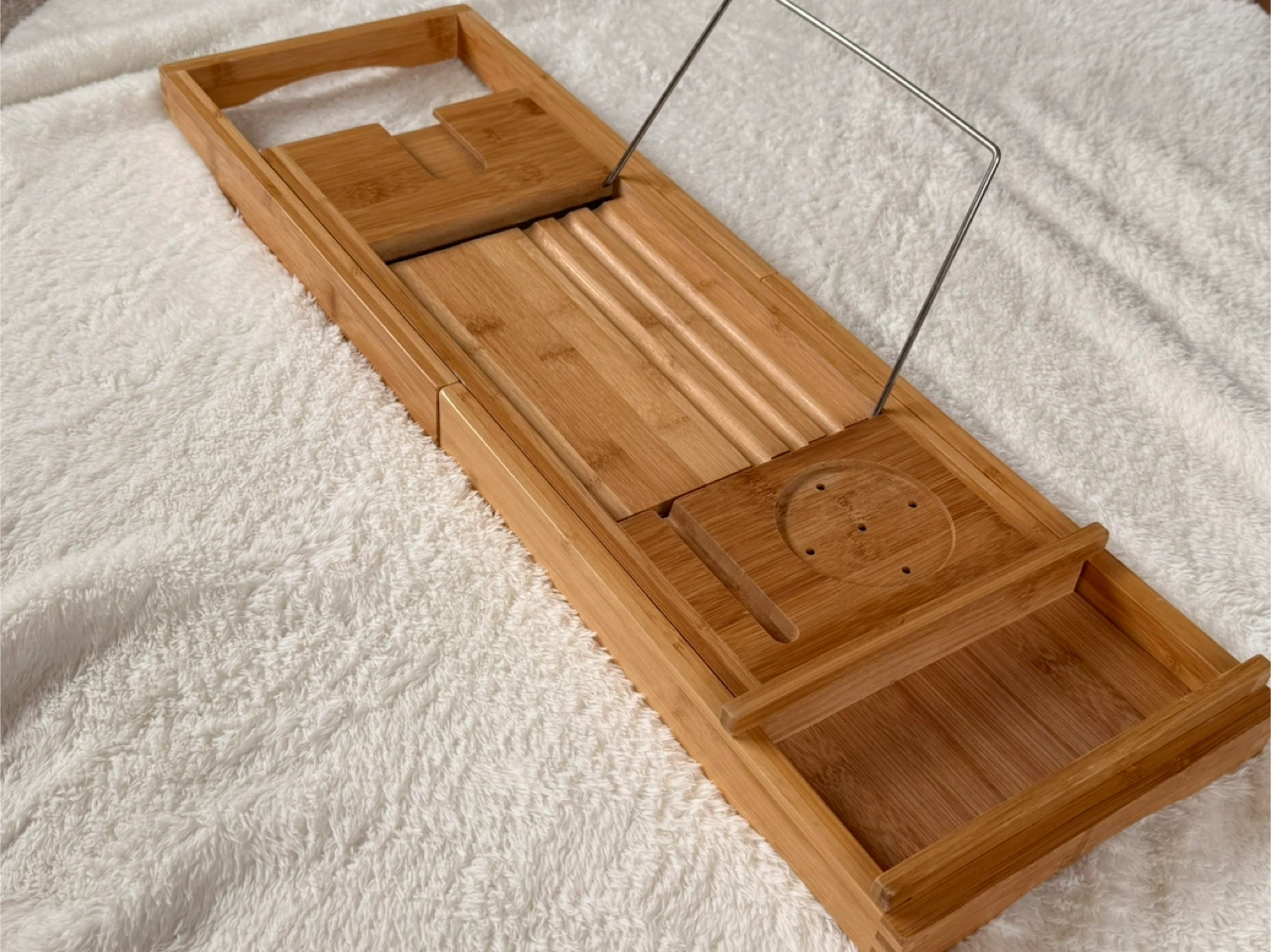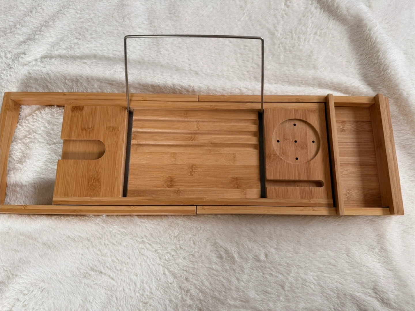 木製のバスタブトレーです。 ・素材:木製 ・状態:目立った傷なし。使用感あり。 ・伸縮式で幅を調節できます。 伸縮前 約70×23×4CM、 伸縮後 約106×23×4CM 今の季節に活躍できるお風呂テーブルとしていかがですか🛀 青山高樹町での取引をお願いします。 中古ですので神経質な方はご購入お控えくださいm(_ _)m どうぞよろしくお願い致します。