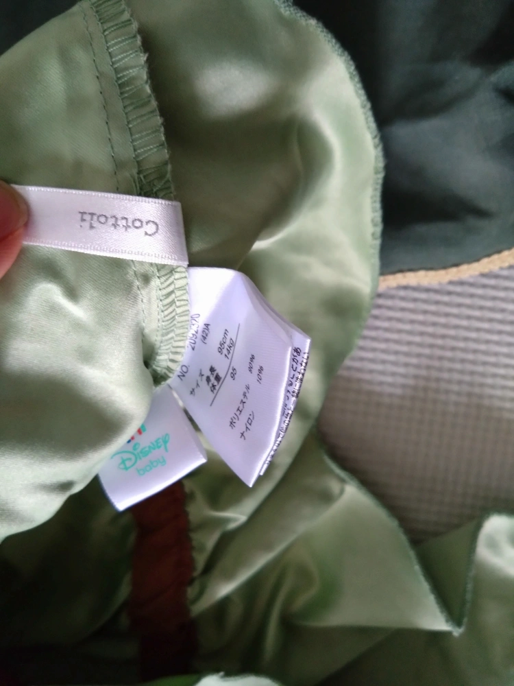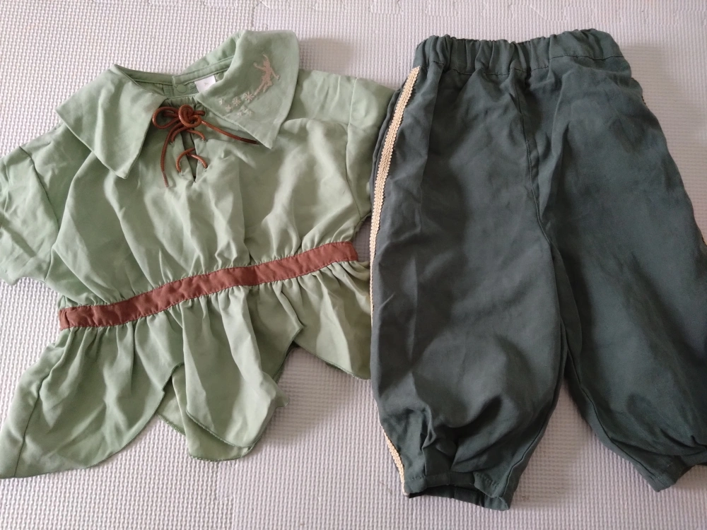 ディズニー ベビーのコスチュームです 大人気のバースデーのコトリ、ピーターパンの衣装です。 ディズニーランドで半日着用したのみです。 右の襟元に少し汚れがついてしましたが、他は綺麗です。 ・サイズ:95cm ・素材:ポリエステル90%、ナイロン10% ・色:グリーン系 ・使用感少なめ 中古品であることご了承ください