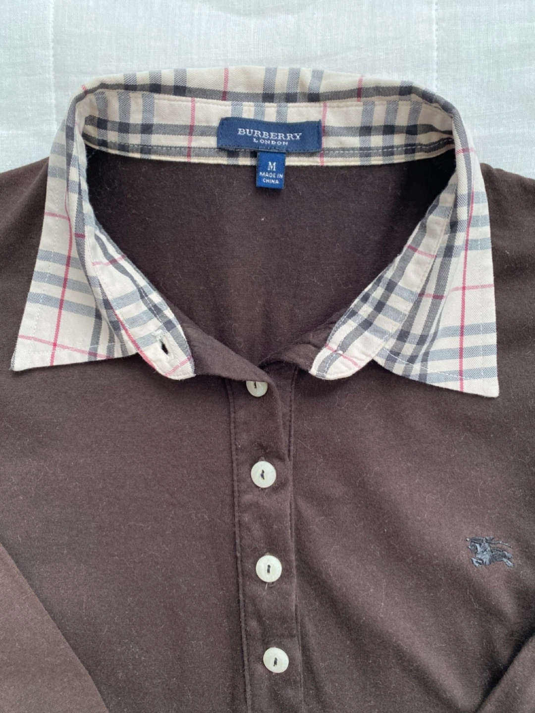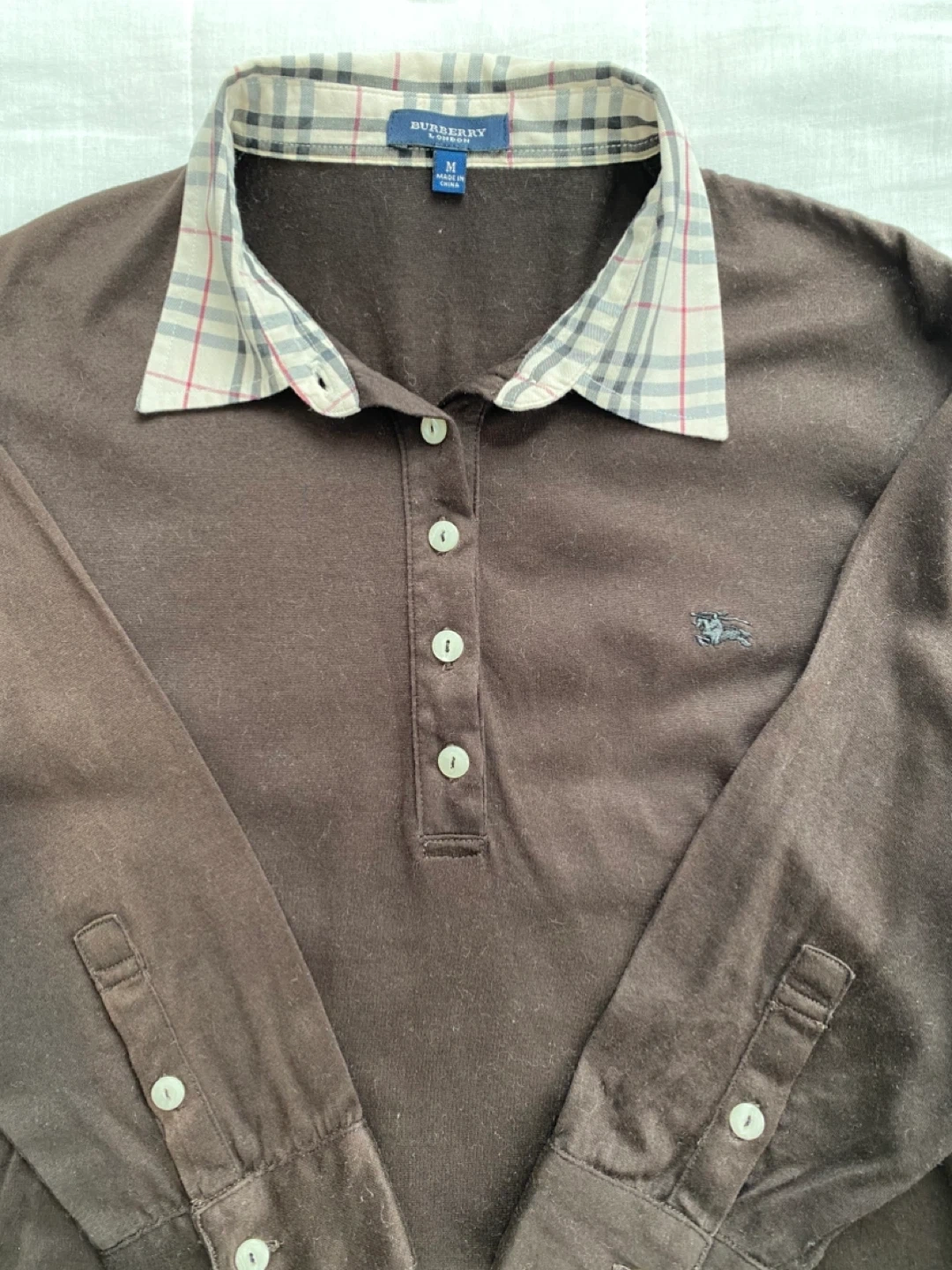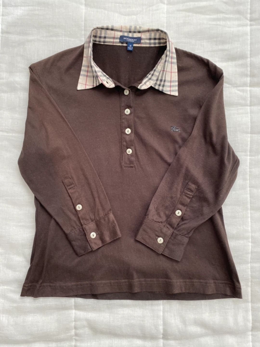 バーバリーロンドンの長袖ポロシャツです。 ・ブランド:バーバリーロンドン ・サイズ:M ・カラー:ブラウン ・素材:100%コットン ・襟:チェック柄 ・状態:襟元に若干の使用感有りですが汚れキズなどは無しです。ボタンにもバーバリーの英字表記が入っています。色むらが有るように見えますが、実際にはブラウンのお色のままです。 Mサイズ表記ですが、やや小さめのMととらえて下さい。 受渡しは三軒茶屋から桜新町辺り迄可能です。 宜しくお願い致します。