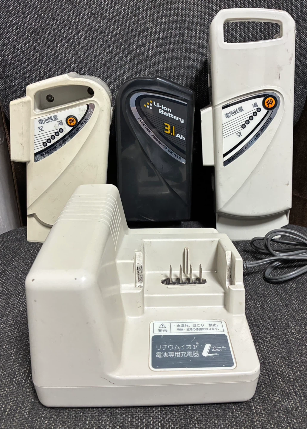 パナソニックの電動アシスト自転車用バッテリー3個と充電器1個のセットです。 【情報】 ブランド:パナソニック バッテリー容量:3.1AH &8.9AH 充電器品番:NKJ033 【状態】 使用感はありますが、動作確認済みです。 バッテリーの充電残量ランプは点灯します。 バッテリー:使用感、汚れ、傷、色あせ有り 充電器:使用感、汚れ、傷、色あせ有り 白 長押し5点灯 黒 長押し4点灯 白(8.9AH)長押し2点灯 中古品であることをご了承ください。 ⚠️日本語が通じない方は取り引きが出来ませんので、あらかじめご了承いただけますようお願いします。 ⚠️ 問い合わせをして頂いた方への注意⚠️ チャットに問い合わせを頂いてから12時間以上経っても何の反応もないような冷やかし行為につきましては、ブロック対応を致します。予めご了承願います。