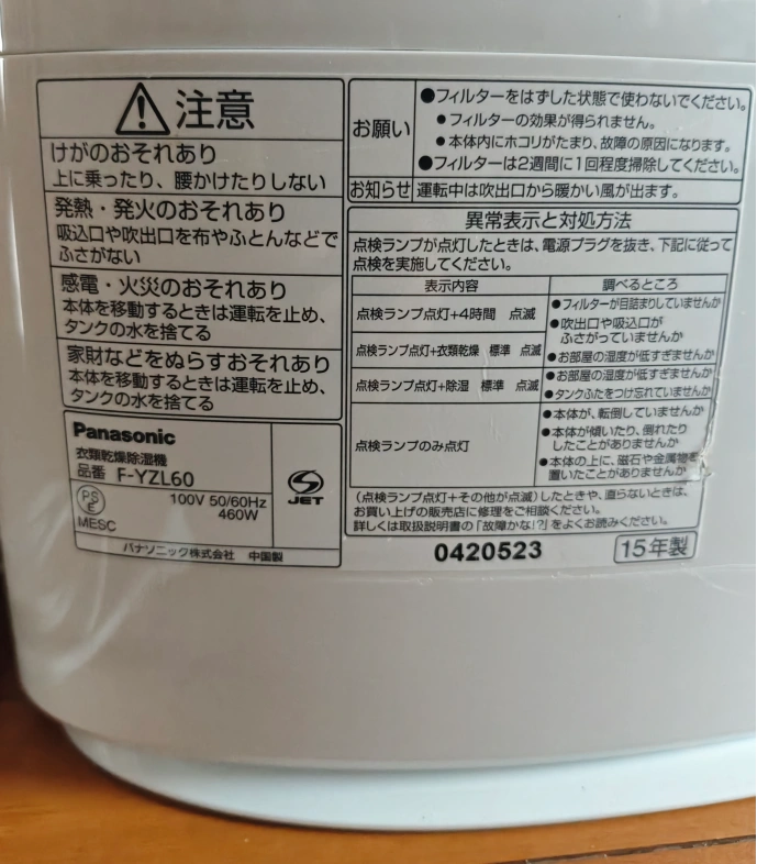 パナソニック Panasonic 衣類乾燥除湿機 F-YZL60 ホワイト ~正常作動確認済~ 出品に伴い掃除は行いできるだけ綺麗にしました。 除湿方式: デシカント式 タンク容量: 2 L 除湿能力: 木造:7畳 鉄筋:14畳 1日あたりの除湿能力:5.4 L 消費電力 除湿運転:おまかせ・標準:280W/弱:270W 衣類乾燥運転:速乾・強:460W/標準:280W 電源コード長さ:2.1 m 衣類乾燥時間: 標準:約95分 速乾・強:約72分 自動停止機能:○ 切タイマー:2・4・6時間後 幅x高さx奥行き :194x458x352 mm 重さ:5.8 kg ・画像がすべてとなりますので外観は画像でご判断下さい。 ・コンディションにつきましてはあくまでも主観となり個人差がございますので、トラブル防止のためにも、神経質な方や細部まで気になさる方、 完璧を求められる方は、ご購入をお控下さい。