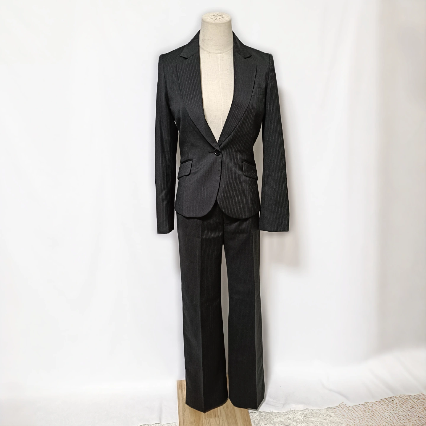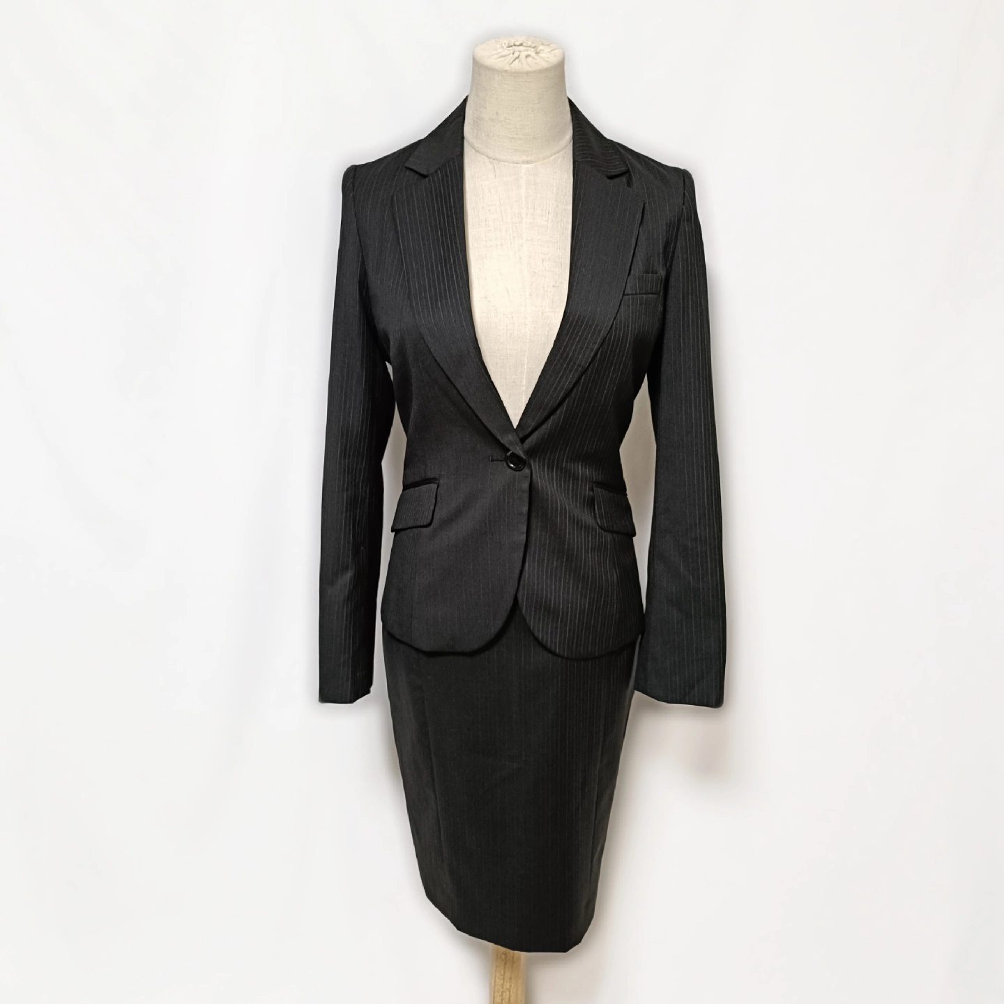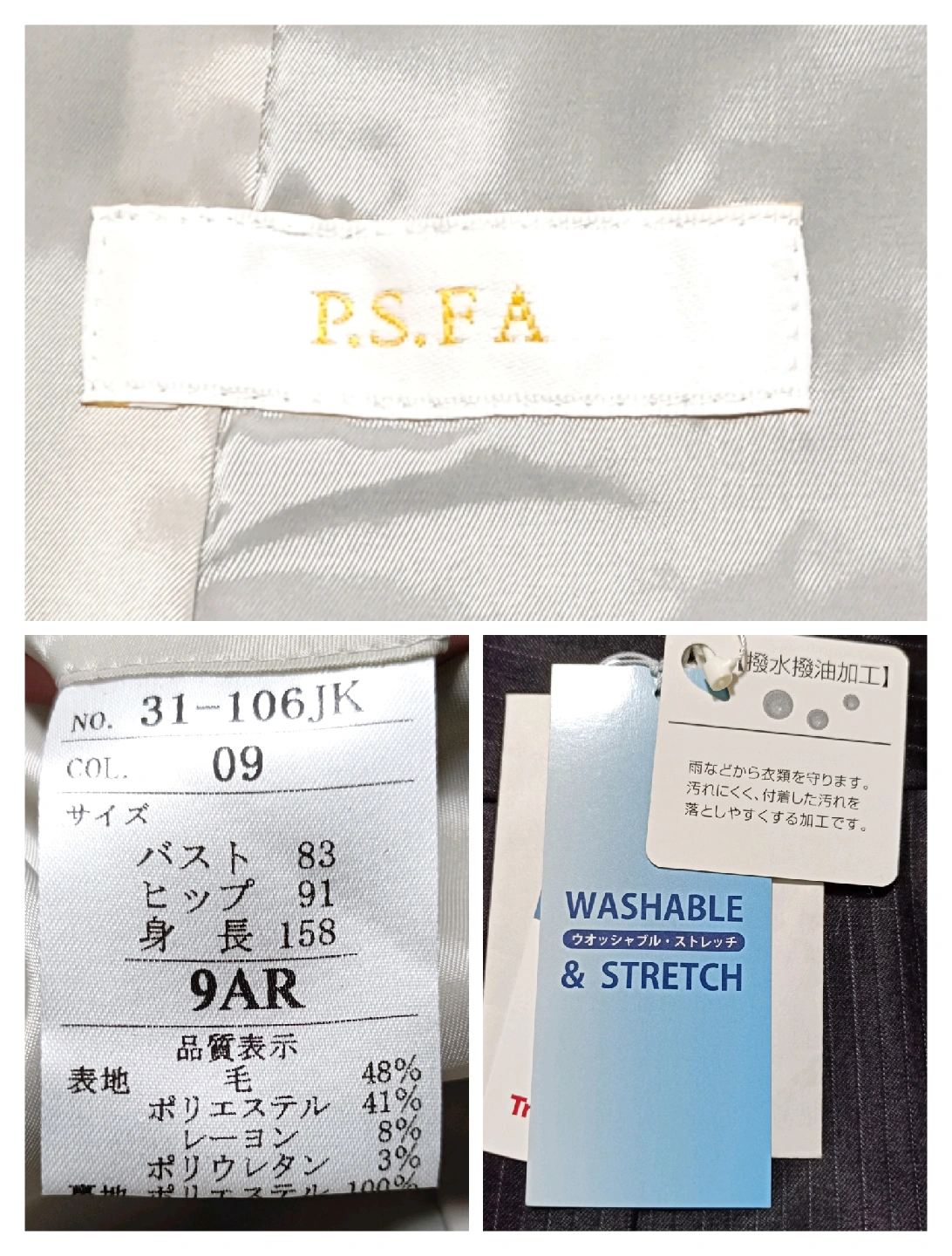 ご覧いただきありがとうございます! パーフェクトスーツファクトリー(P.S.FA)のレディース用3点セットアップスーツです。 ジャケット、スカート、パンツの3点がセットになっており、幅広いビジネスシーンに対応できます。 ご自宅で洗濯できる**「ウォッシャブル」仕様で、いつでも清潔に保てます。さらに「ストレッチ」**素材で動きやすく、長時間の着用でもストレスを感じにくい設計です。 #joymaxお得なプロフへ #ゆうの古着屋さん_レディースセットアップ □商品名□ P.S.FA パーフェクトスーツファクトリー 3点セットアップスーツ ブラック ストライプ 9AR ウォッシャブル&ストレッチ □ブランド□ P.S.FA パーフェクトスーツファクトリー □表記サイズ□ 9 □実寸サイズ(cm) □ 【床置きサイズ】 ジャケット 着丈:56 肩幅:38 身幅︰40 袖丈:60 パンツ ウエスト︰38 着丈︰95 股上︰25 股下︰70 裾幅︰23 スカート ウエスト︰35 着丈︰53 ※実寸につきまして多少の誤差はご了承ください。 ※表記サイズだけではなく実寸のサイズをご確認ください。 □カラー□ ブラック 黒色 □素材□ 表地:毛 48%    ポリエステル 41%   レーヨン 8%    ポリウレタン 3% ​裏地:ポリエステル 100% □コンディション□ 目立った汚れやダメージなど特にございません。 ※汚れはできる限り写真にて掲載しております。まずは画像をご確認ください。 どうぞよろしくお願い致します。 □商品管理番号□ T9-W-5498