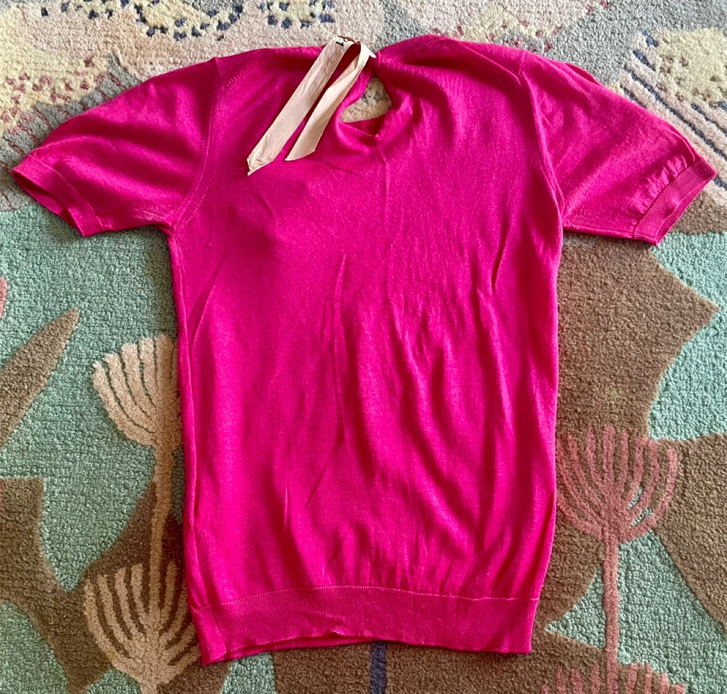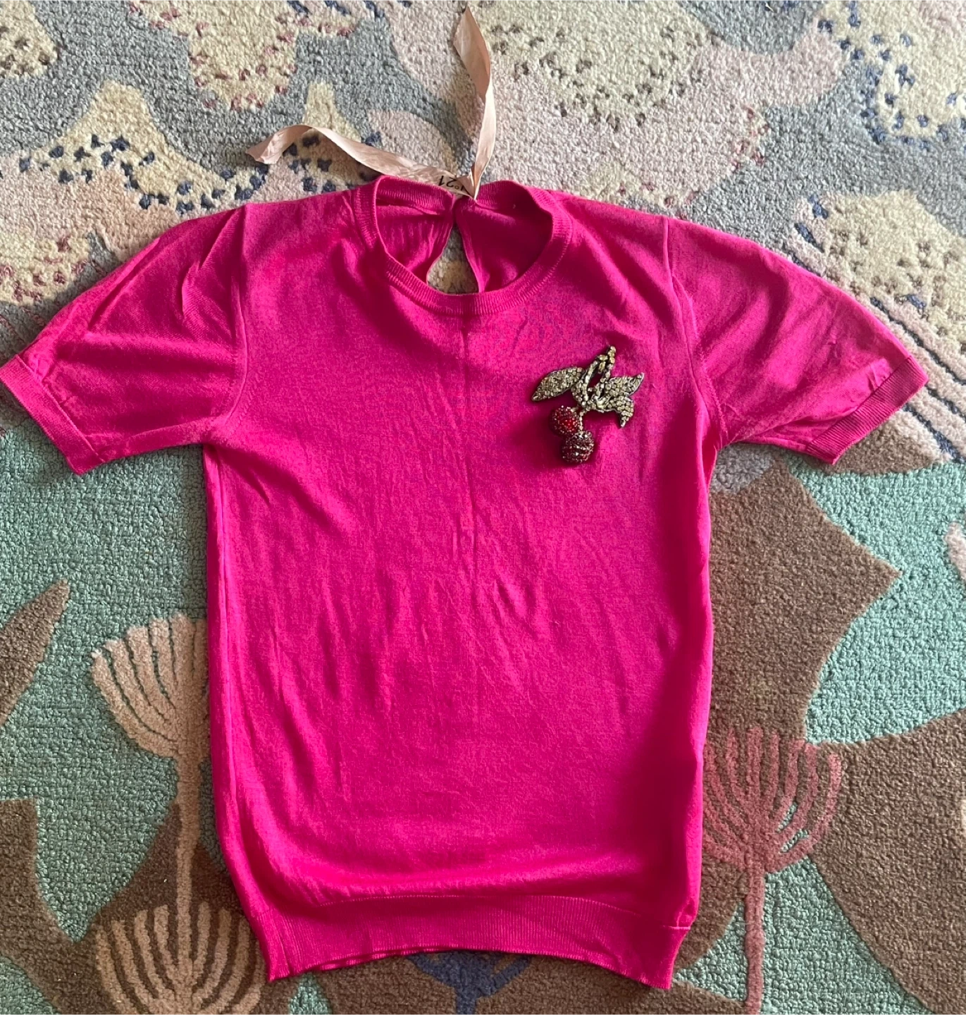ルーマニア製の薄手セーターです。 色味は、ラズベリーピンクのとてもキュートなカラーです。今の季節にぴったり! 胸のビジューはブローチではなく、縫われています。 ワンサイズですが、S寄りのMかと思います。 実寸は、肩幅34cm、胸囲84cm、着丈60cmになります。 ネック後ろは、ボタン止めになっています。リボンも、最初から縫い付けられています。 素材が、ウール70%+絹30%で、滑らかで伸びも良く、着心地がよいです。 ただ、それだけに繊細な素材なので、数カ所、わずかなひっかきが見当たります。アップの写真をご参照ください。 お渡しは、千歳烏山駅西口、粕谷図書館、八幡山駅、千歳船橋駅、また下高井戸駅と三茶に関しては、夕方18時のみ、というシバリがありますが、ご相談下さい。
