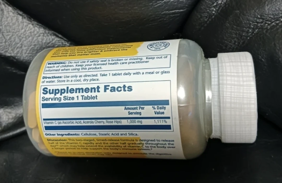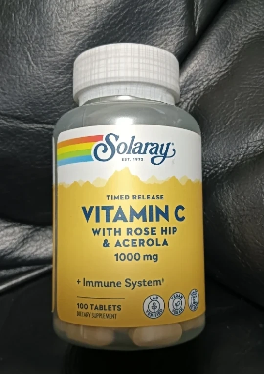 ビタミンCのタブレットです。 こちらのタブレットはタイムリリース型(持続放出型)で、ビタミンCの半量をすばやく放出し、残りの半分を1日かけて段階的に放出するよう工夫されています。 タブレットが大きめなのでご注意ください。参考:4枚目 ※写真はwebから参照しました。 ・容量:1000mg ・100錠入り ・使用期限:2027年6月 ●安心の非遺伝子組み換え商品、ベジタリアン / ビーガン仕様 ●ローズヒップ・アセロラなどのビタミンサポート成分配合 【Solarayのこだわり】 物理的特性のテスト済 / 微生物検査済 / 崩壊試験済 / 同一性と効力のテスト済 / 汚染物質検査済 / 完成品と安定性のテスト済 / 455 GMP (適正製造規範) 認定 / ISO 17025:2017 認定 アスコルビン酸・アセロラ・ローズヒップ ビタミンCが環境の変化に負けない体づくりを応援 風邪予防