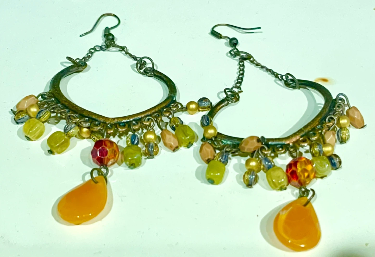 ビーズ装飾のピアスです。 ・色:ゴールド、オレンジ、グリーン、茶など ・サイズ:幅4cm×高さ8cm ご不明点があればお気軽にお尋ねください。 千歳烏山駅、千歳船橋駅、祖師ヶ谷大蔵駅、芦花公園、三軒茶屋(夕方18時頃限定)、粕谷図書館など、待ち合わせ場所は、ご相談ください。
