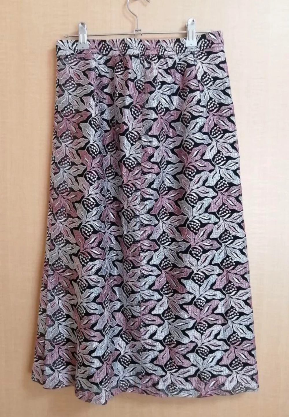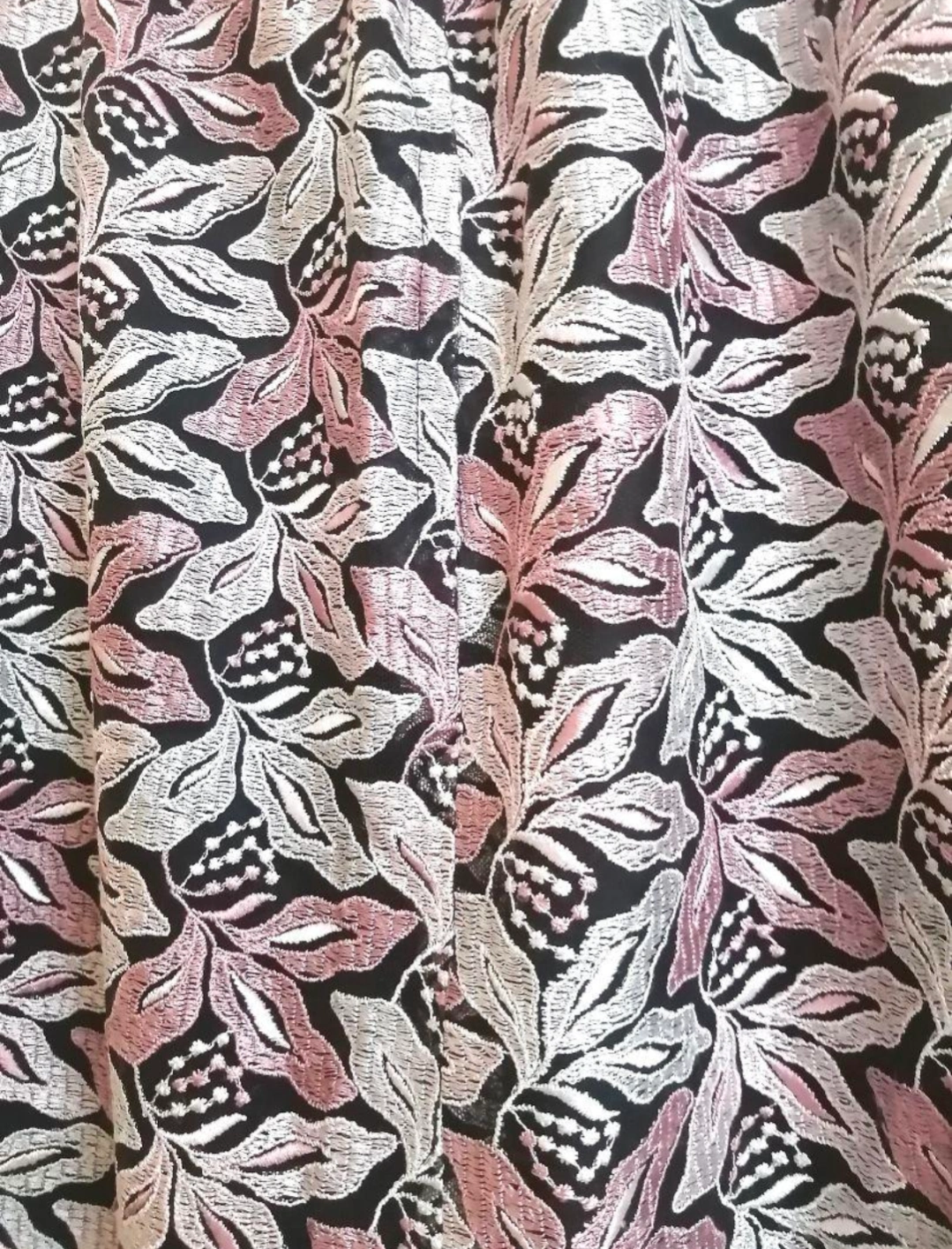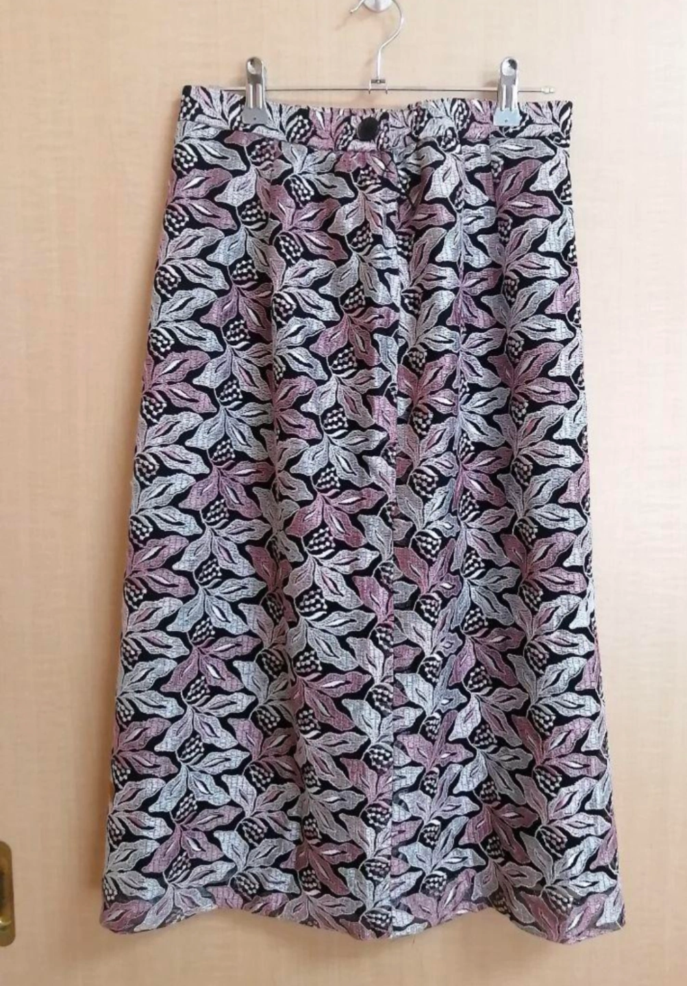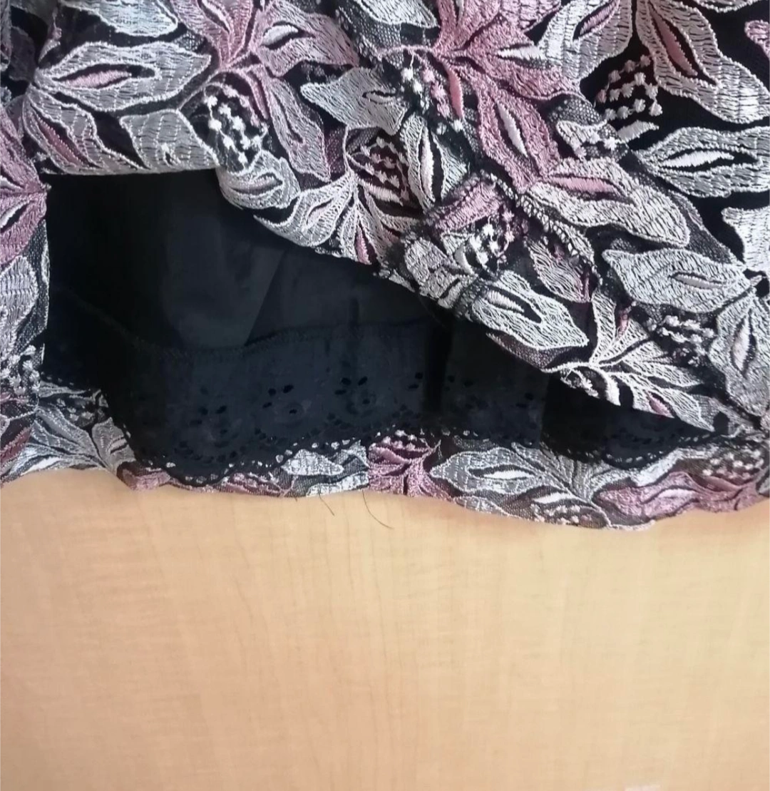 ピンクと黒の刺繍レースのAラインスカートです。 繊細な刺繍風の花柄が散りばめられていて、糸に少し光沢があるため、上品で高見えします。 ウエストは飾りボタンが表についていて、裏側でフックで留められる形式です。4枚目の画像のように裏地が付いています。 サイズは実寸で総丈70cm、ウエスト70㎝程ですので、13号表記とありますが、実質Lサイズが近いと思います。