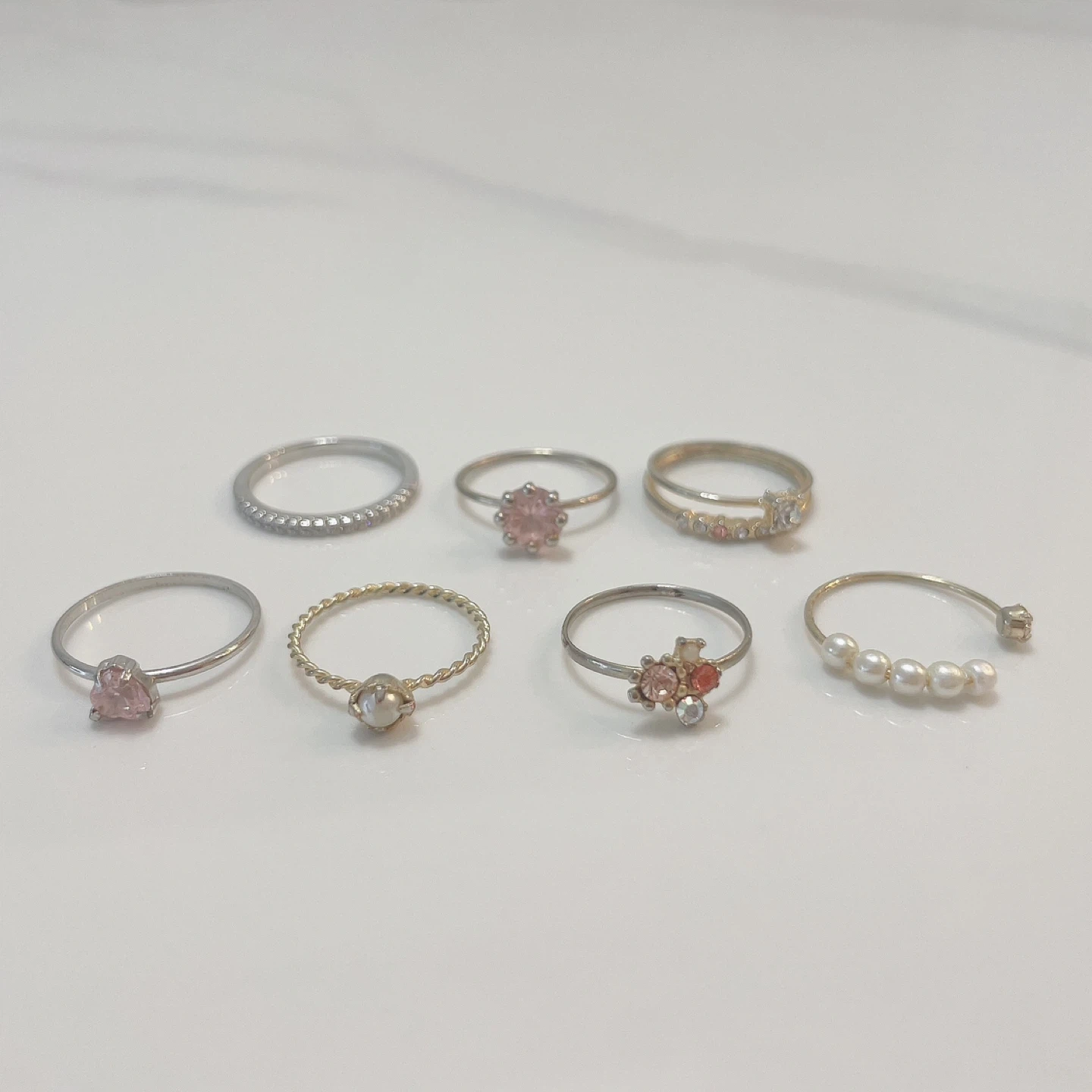 ファッションリング 7点まとめて出品します。 ピンクやハート、カラーストーンなど女性らしい華奢なものです。 重ねづけしてもとても可愛いですよ♪ 号数はあいにく分かりかねますが、親指用のものが1点と、人差し指or中指or薬指用のものが6点です。 当方は平均的な指の太さかと思います。合う指にはめていただければと思います。 概ね綺麗ですが、中古品につき金属のくすみなどございますのでご了承ください。 カラー···シルバー系