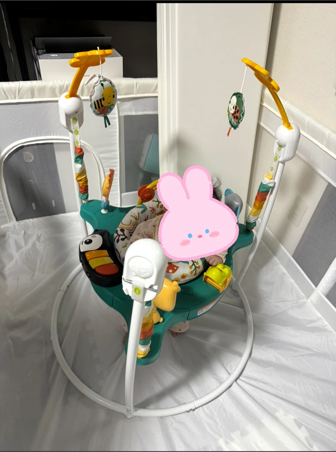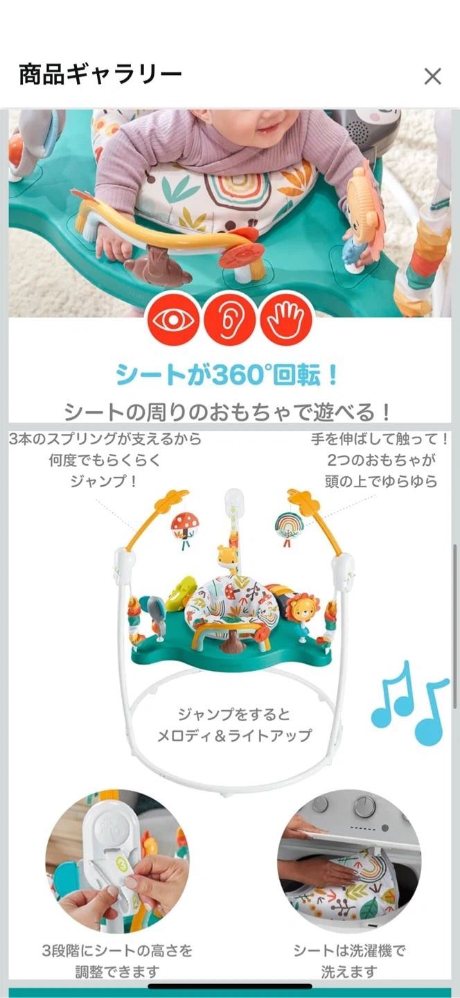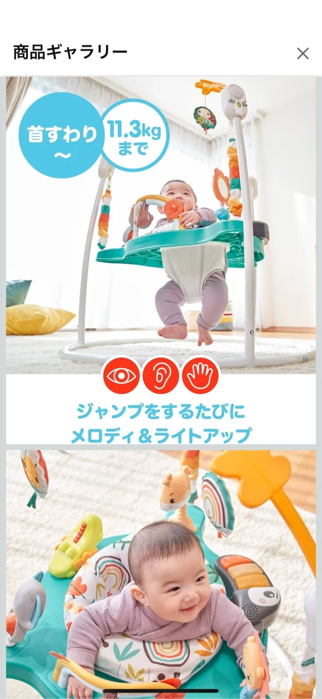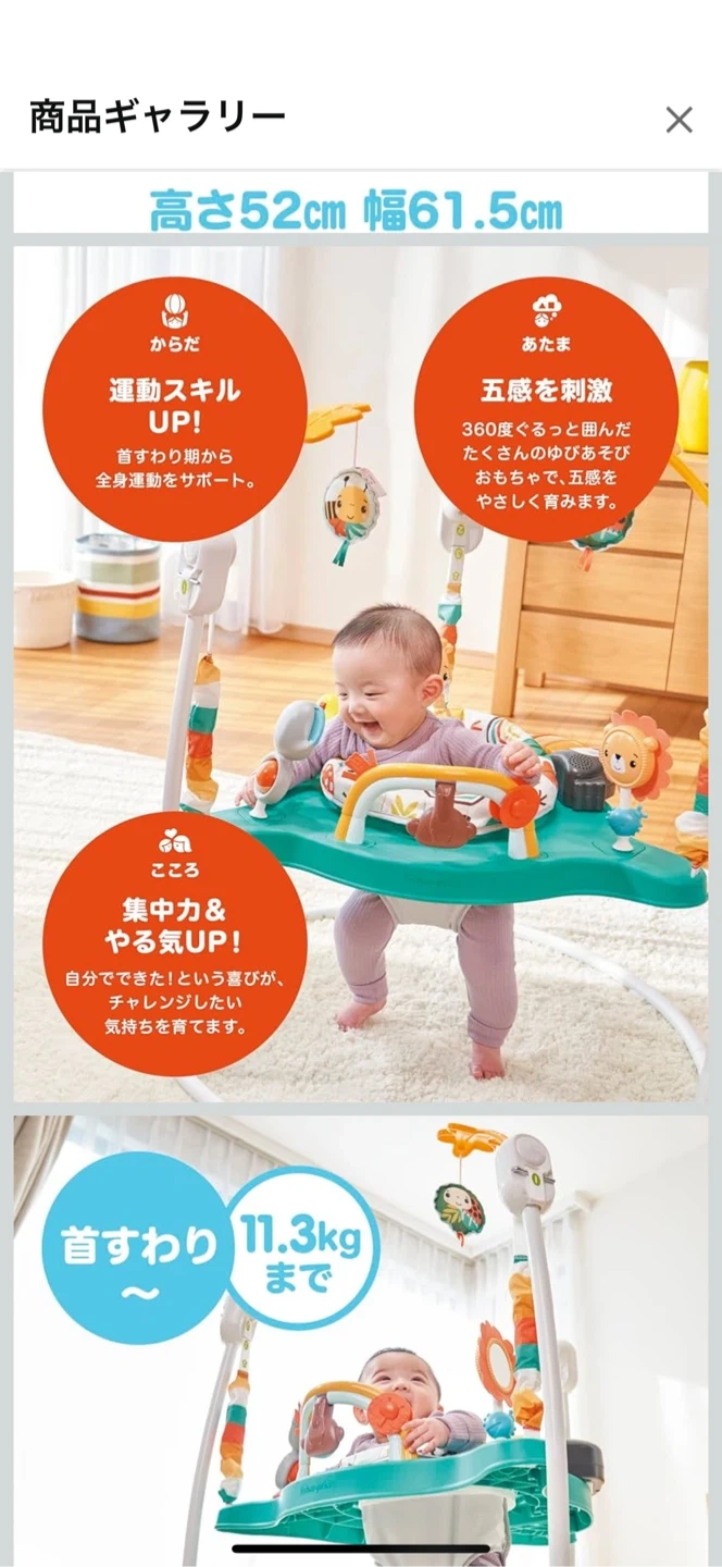 フィッシャープライスのジャンパルーです 【情報】 ブランド:フィッシャープライス 商品名:ゆかいなレインボーフォレスト ジャンパルー 【状 態】 生後8ヶ月くらいの時に1ヶ月くらい使用して綺麗めですが、中古品になります🙇♀️ うちは大きめの子で体重がオーバーになりすぐ使えなくなってしまったのですが…本人は音楽が鳴ったり、おもちゃもたくさん付いててぴょんぴょんしながらとても楽しそうでした😆 【サイズ】 耐荷重:11.3kgまで 高さ52cm 幅61.5cm 使わなくなったので、どなたか使って下さる方にお譲りします✨