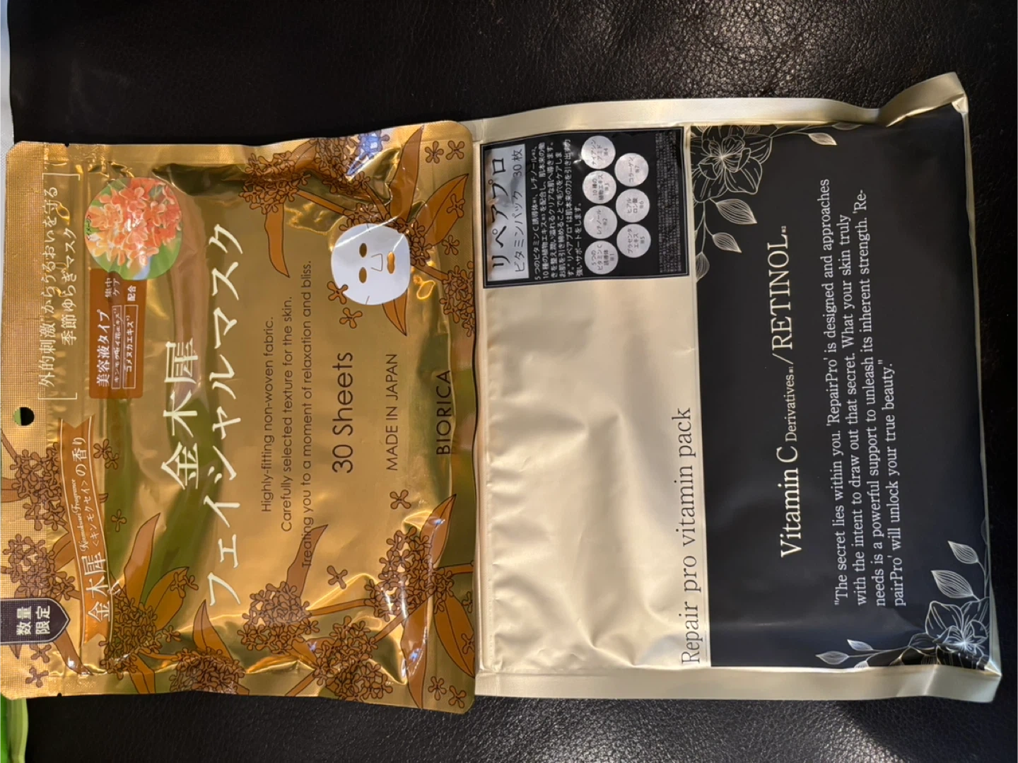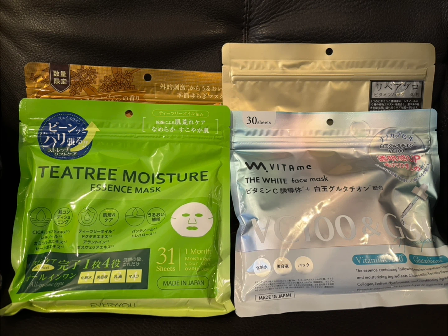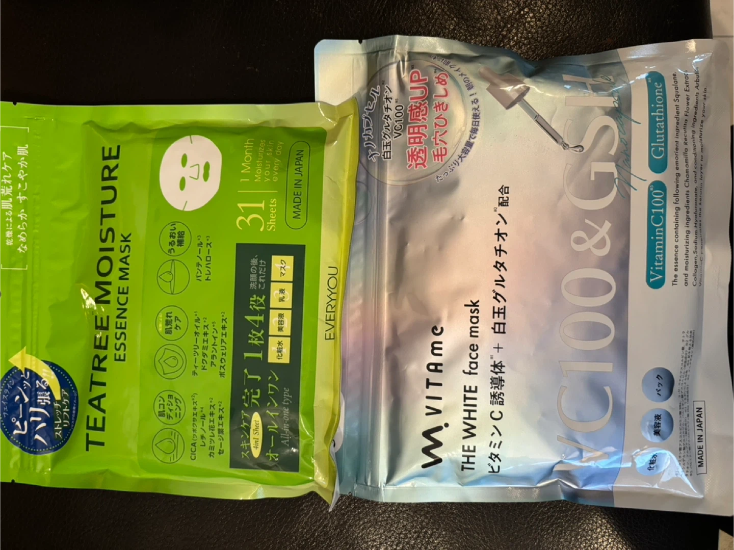 フェイスマスクのまとめ売りです。 ・TEATREE MOISTURE ESSENCE MASK 31枚入り ・金木犀フェイシャルマスク 30枚入り ・リペアプロ ビタミンパック 30枚入り ・M VITAmC THE WHITE face mask VC100&GSH 30枚入り いずれも未開封の新品ですが自宅保管しておりましたので、気にならない方ご検討よろしくお願いします。 受け渡し場所は、平日夕方でしたら九品仏駅周辺も可能ですのでご相談ください。 また、他商品とまとめてご購入くださった方には気持ち程度お値引きさせていただきます。