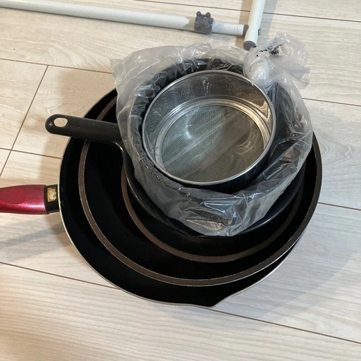 フライパン(取っ手なし2つ、取っ手あり1つ)、ボール、裏ごし、油揚げ用鍋のまとめ売りです。 焼くとくっつきやすいので、油を引いてご使用ください。まだお使いいただけます。 新しいものを購入したのでお譲りします。 ご希望の方はお気軽にご連絡ください。