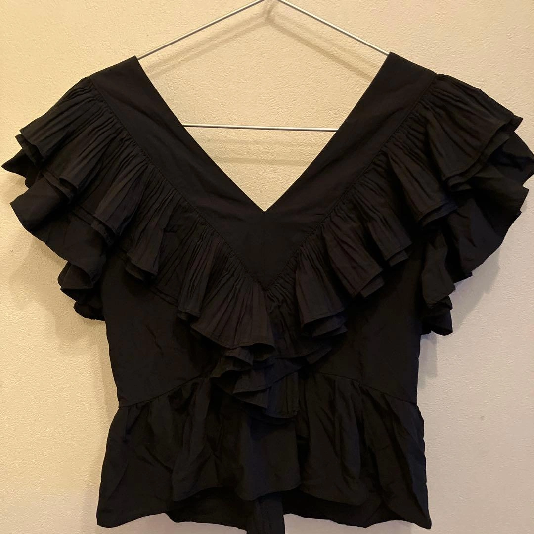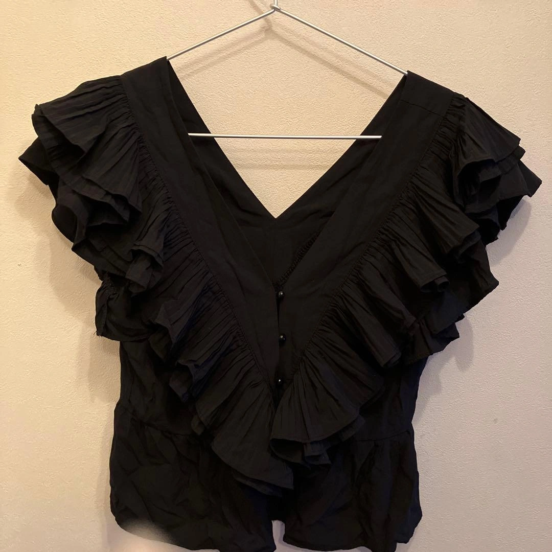 フリル付き黒Vネックトップス